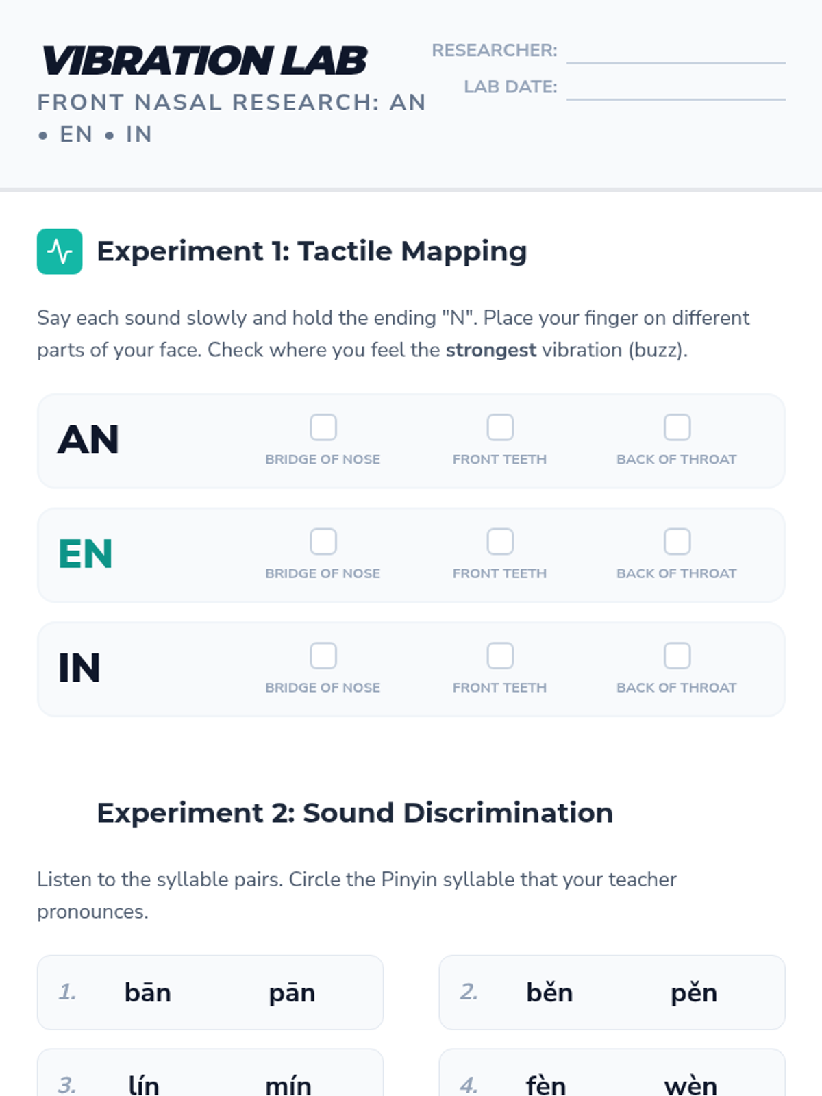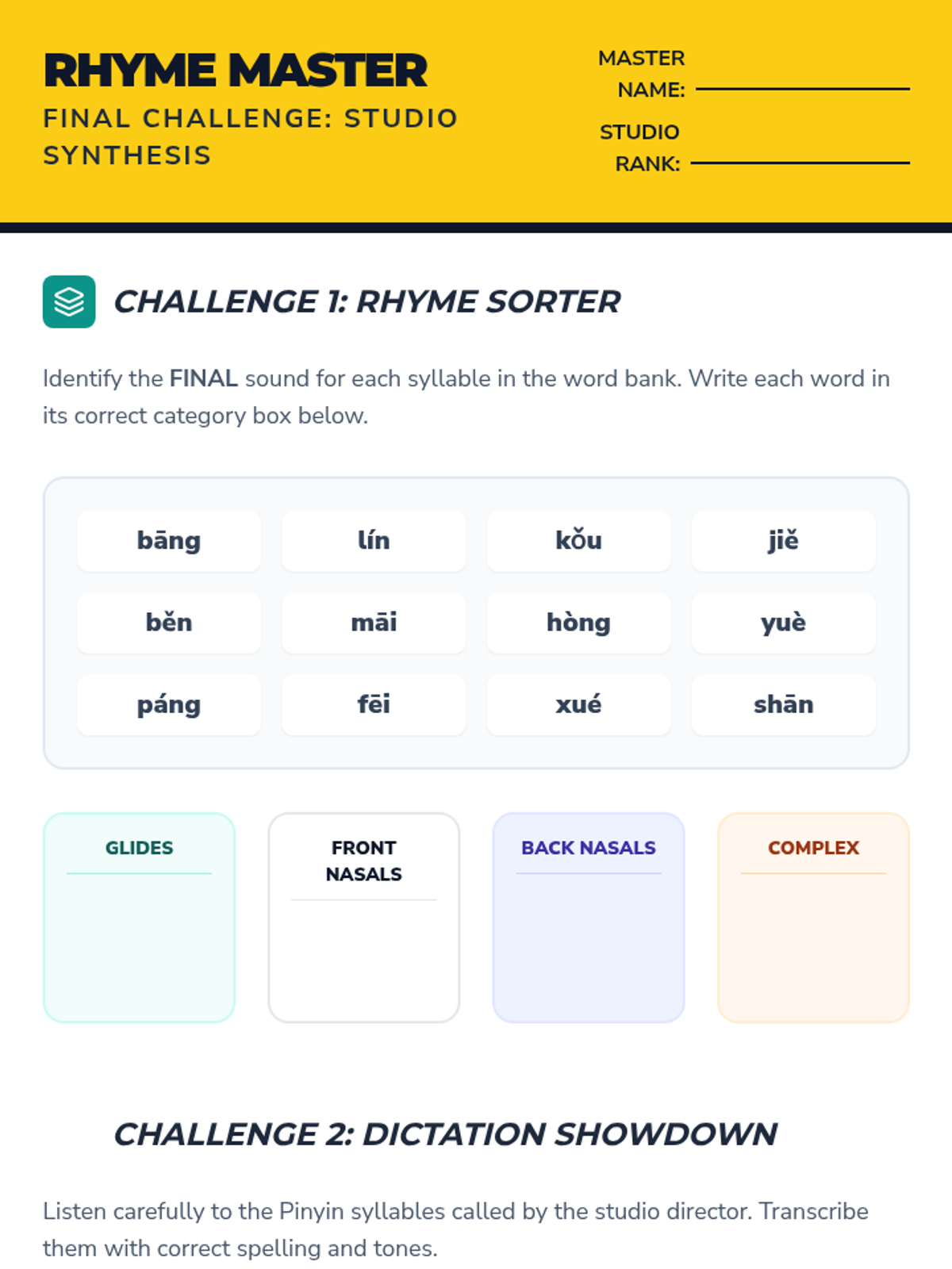 This sequence explores the mechanics of Pinyin compound finals and nasal sounds for 6th-grade beginners. Students learn to navigate the 'gliding' nature of diphthongs and distinguish between front and back nasal endings through tactile exercises and auditory discrimination games.