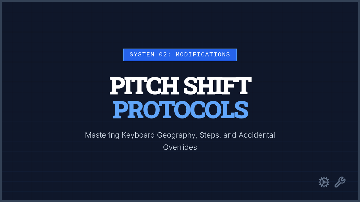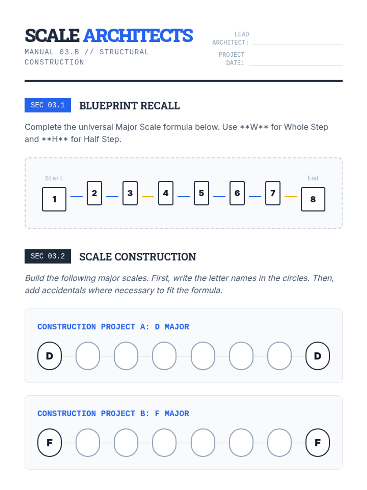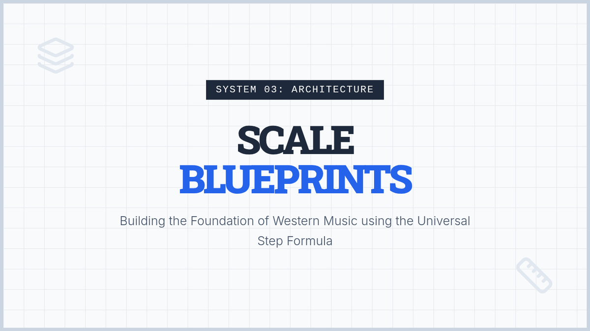 A comprehensive journey through the mechanics of pitch organization, from staff navigation to the construction of major scales and intervals. Students will master the Grand Staff, accidentals, scale formulas, key signatures, and interval identification through a technical, blueprint-inspired aesthetic.