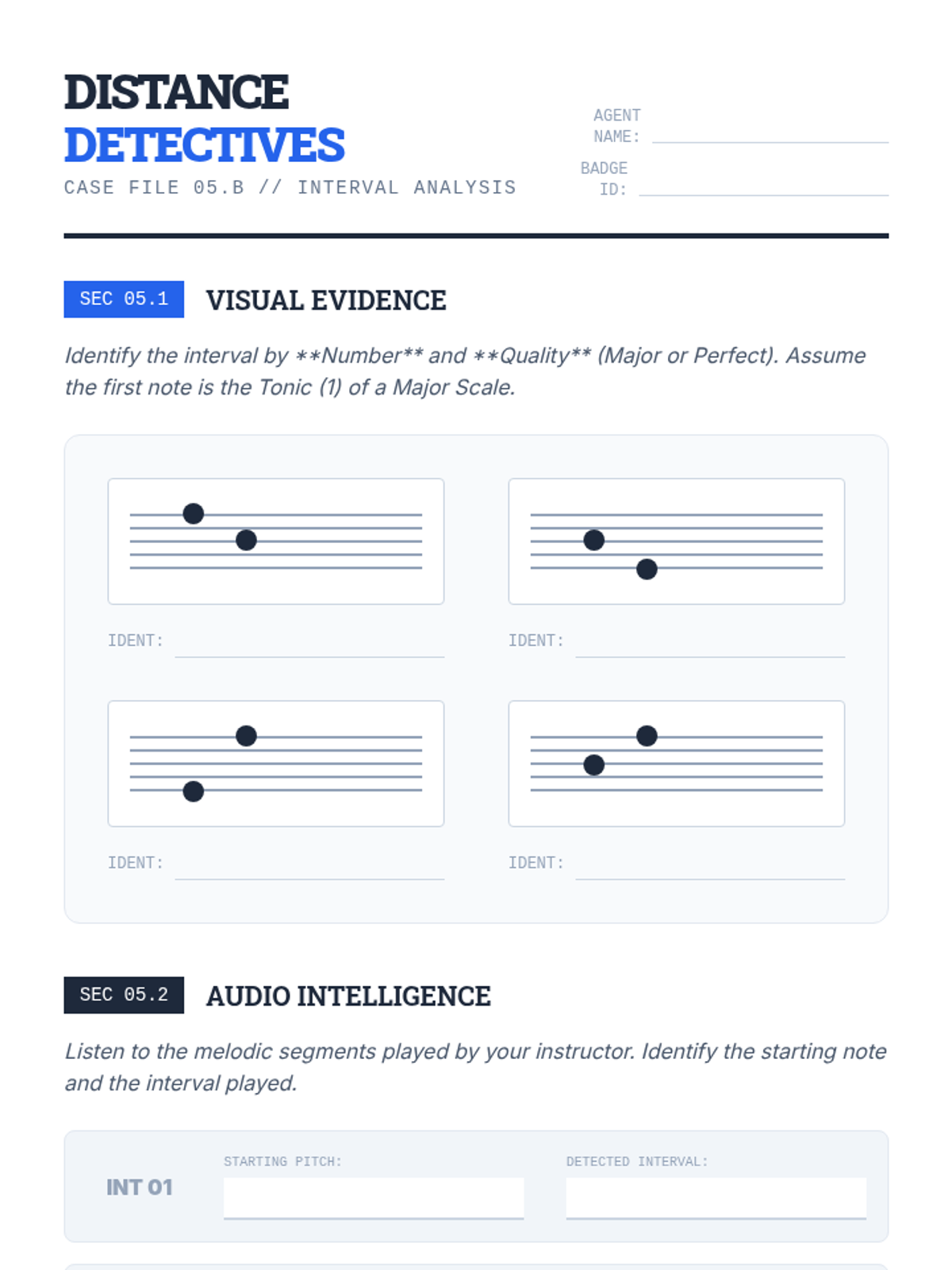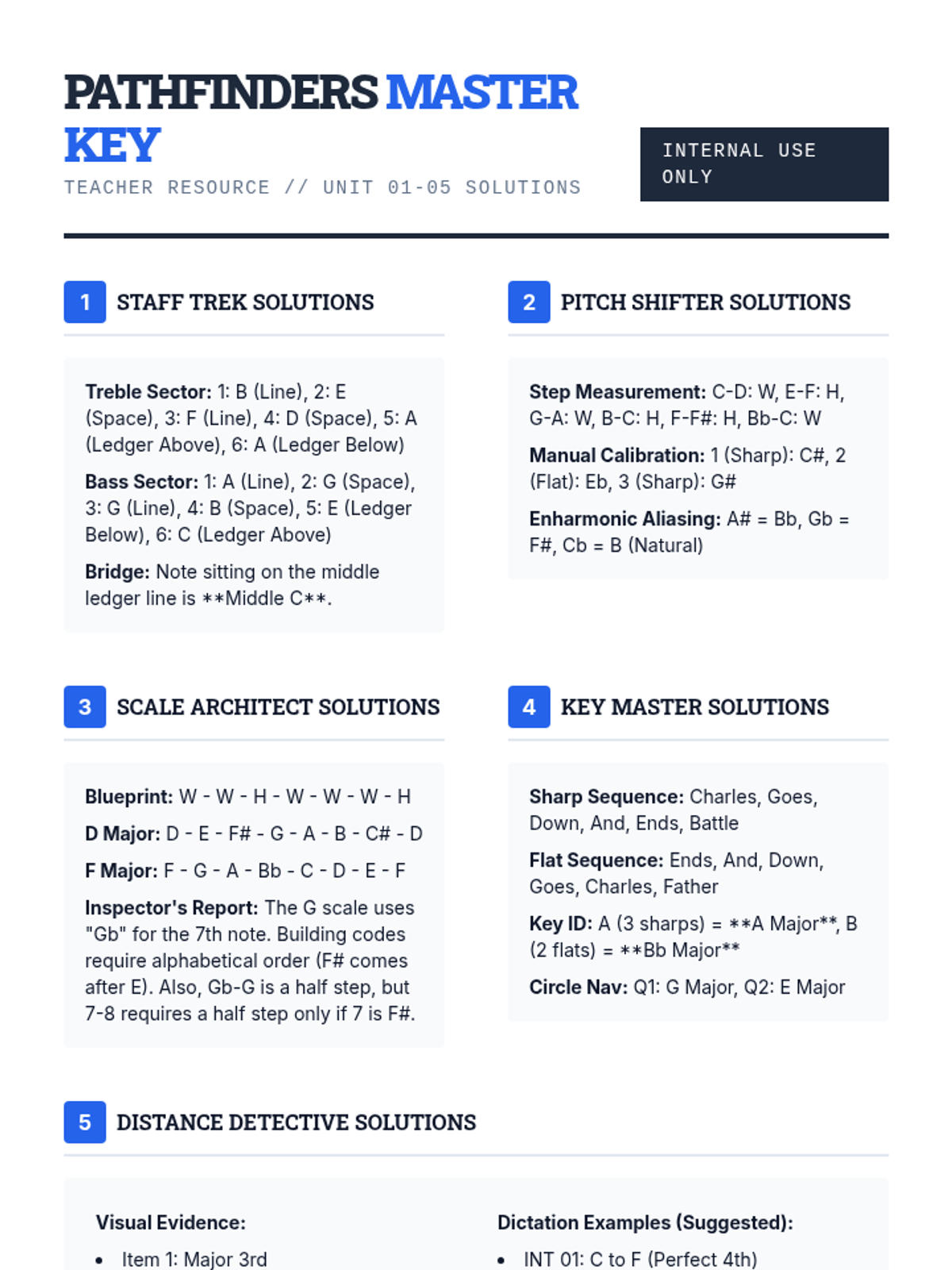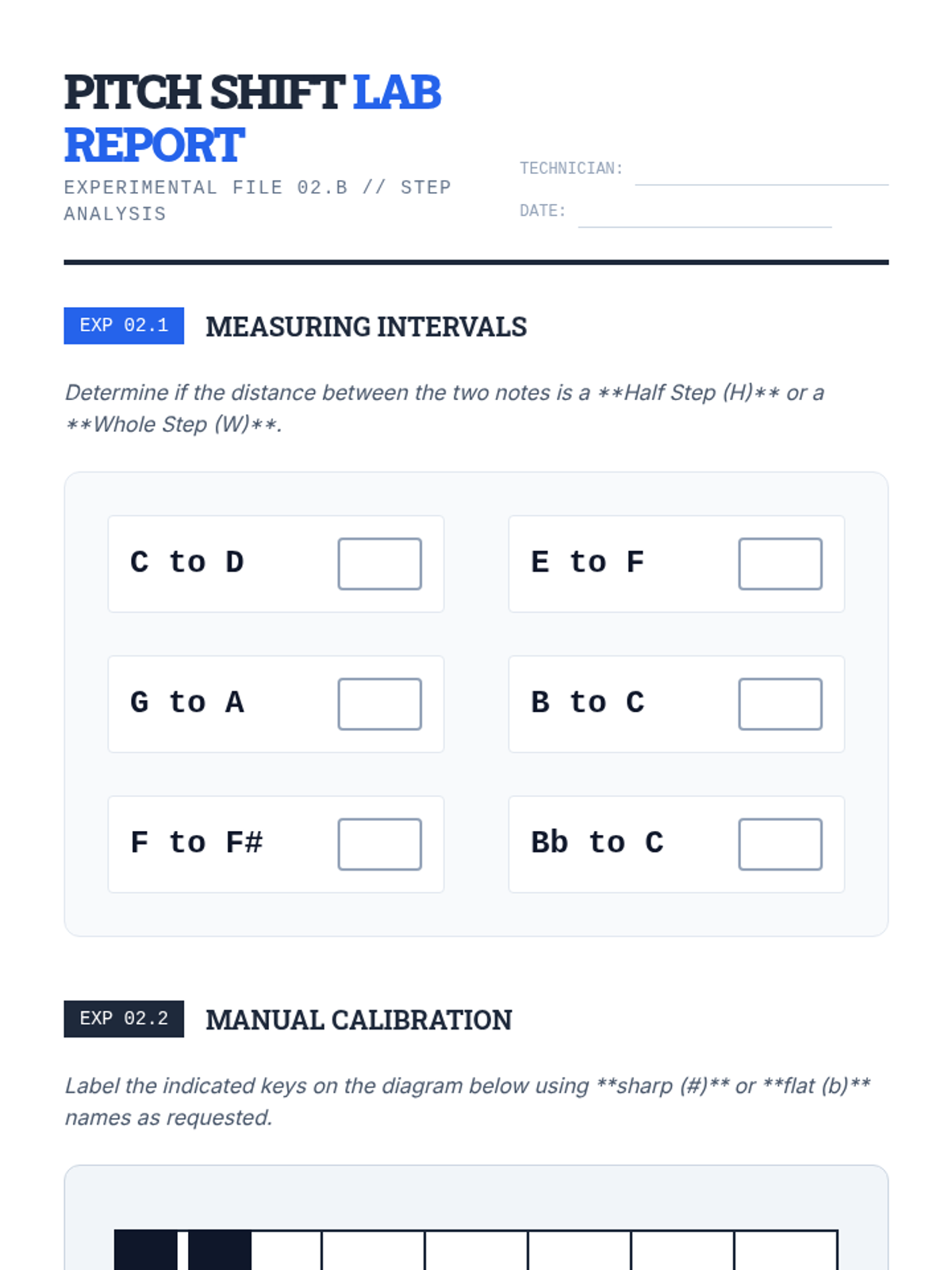 A comprehensive journey through the mechanics of pitch organization, from staff navigation to the construction of major scales and intervals. Students will master the Grand Staff, accidentals, scale formulas, key signatures, and interval identification through a technical, blueprint-inspired aesthetic.