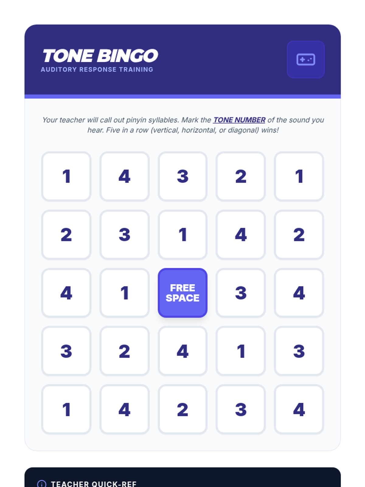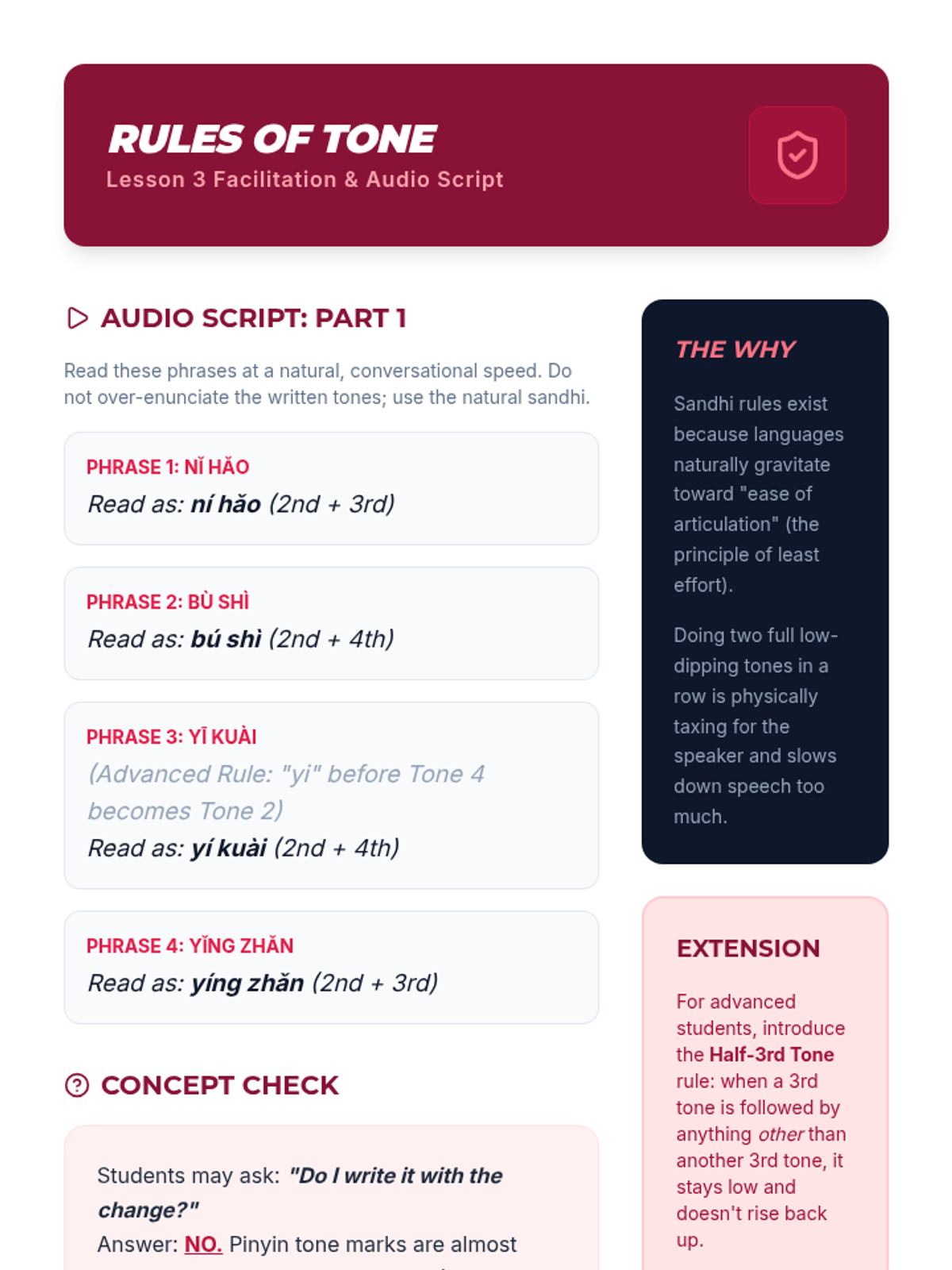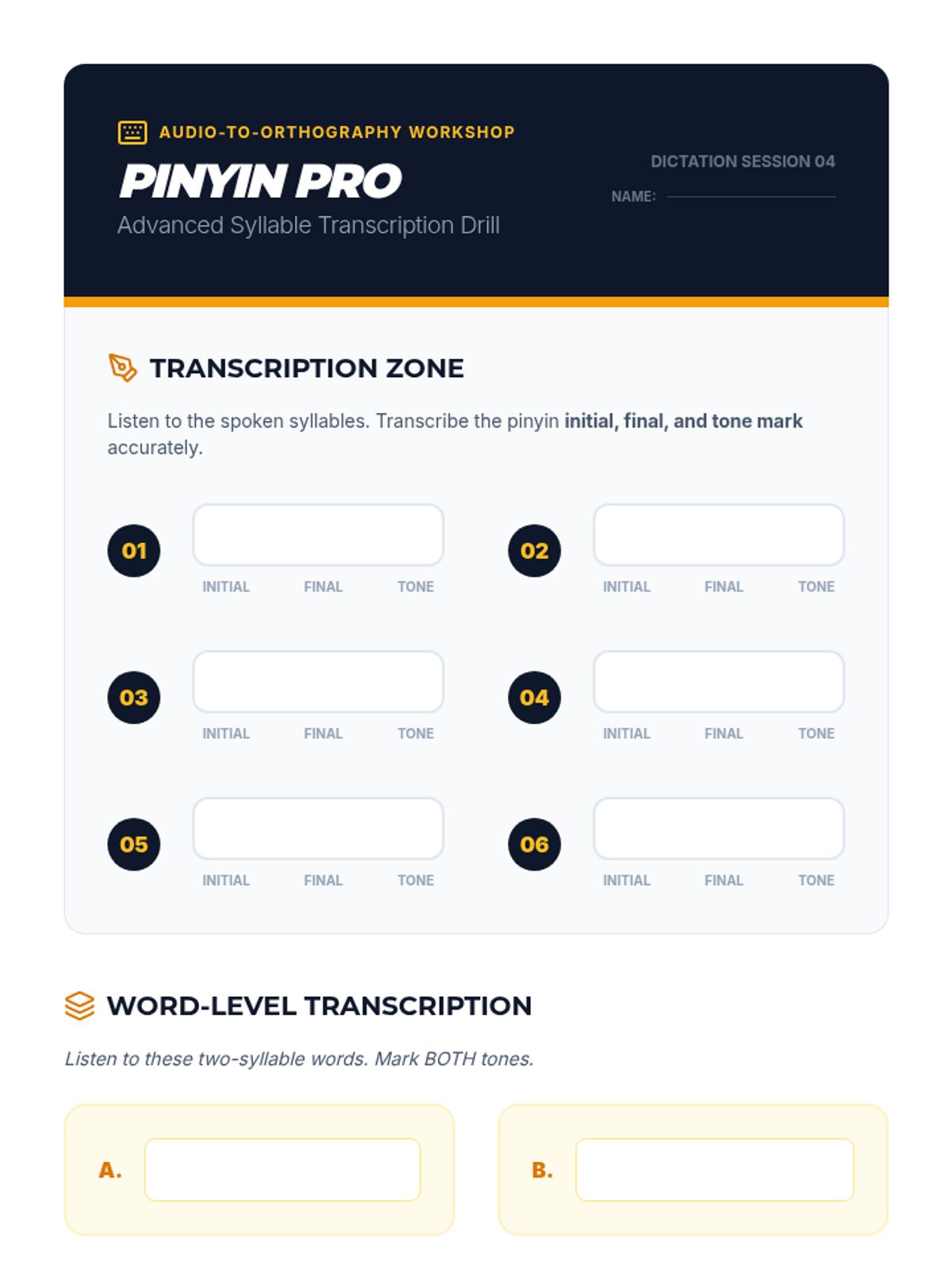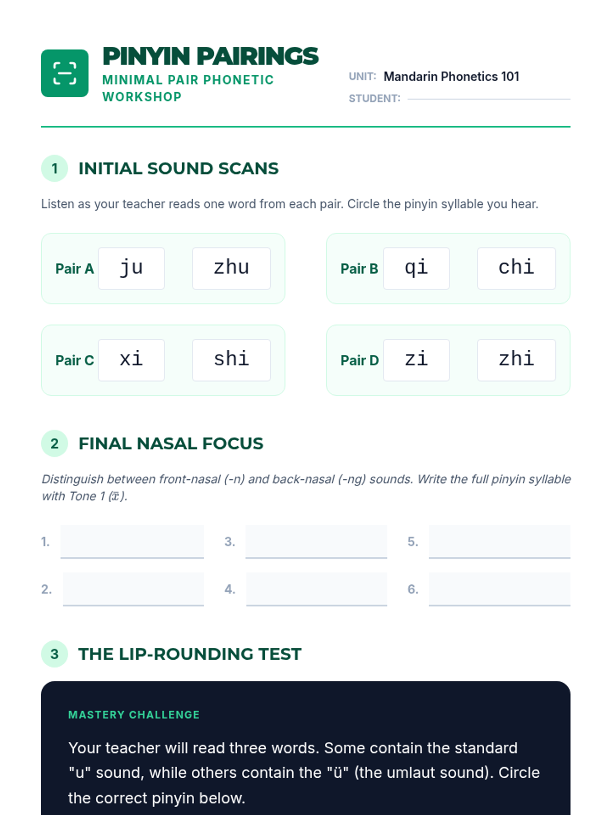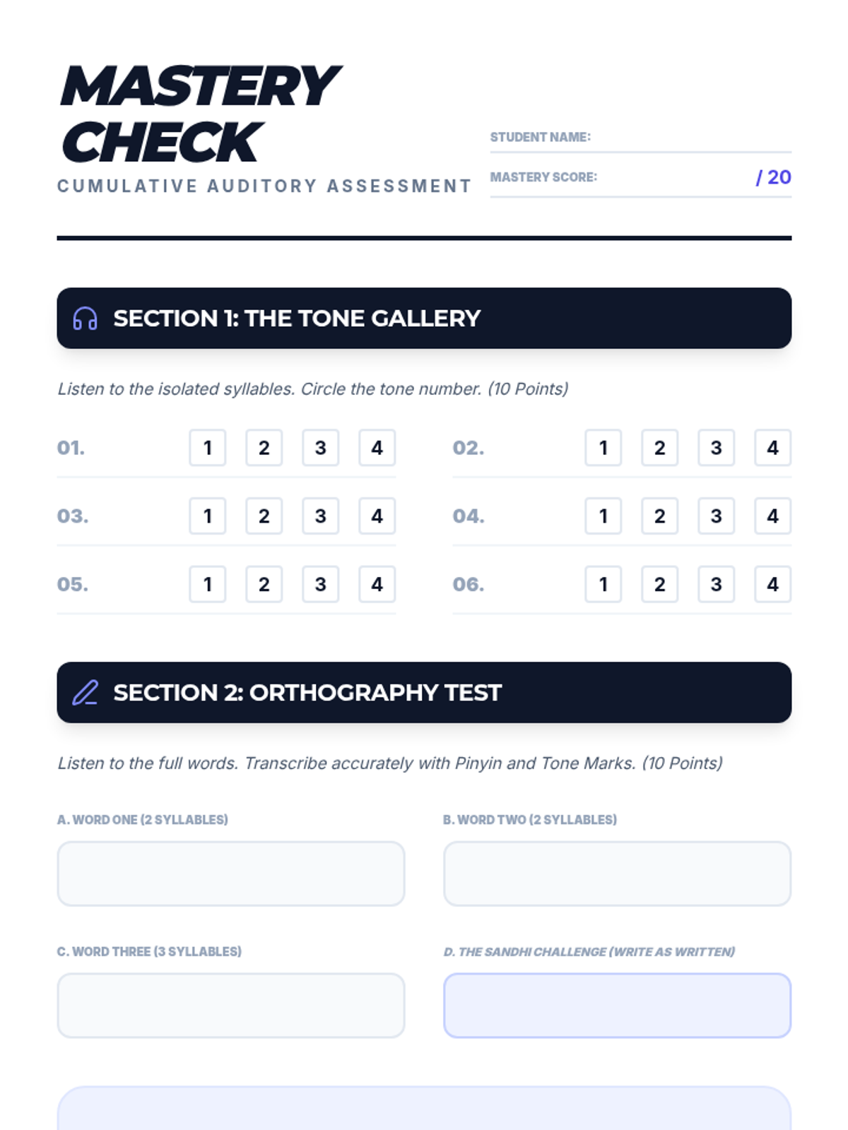 A foundational sequence for 12th-grade Mandarin students focusing on the auditory discrimination of the four tones, pinyin initials and finals, and tone sandhi rules. Students move from isolated sound recognition to full word transcription and auditory assessments.
