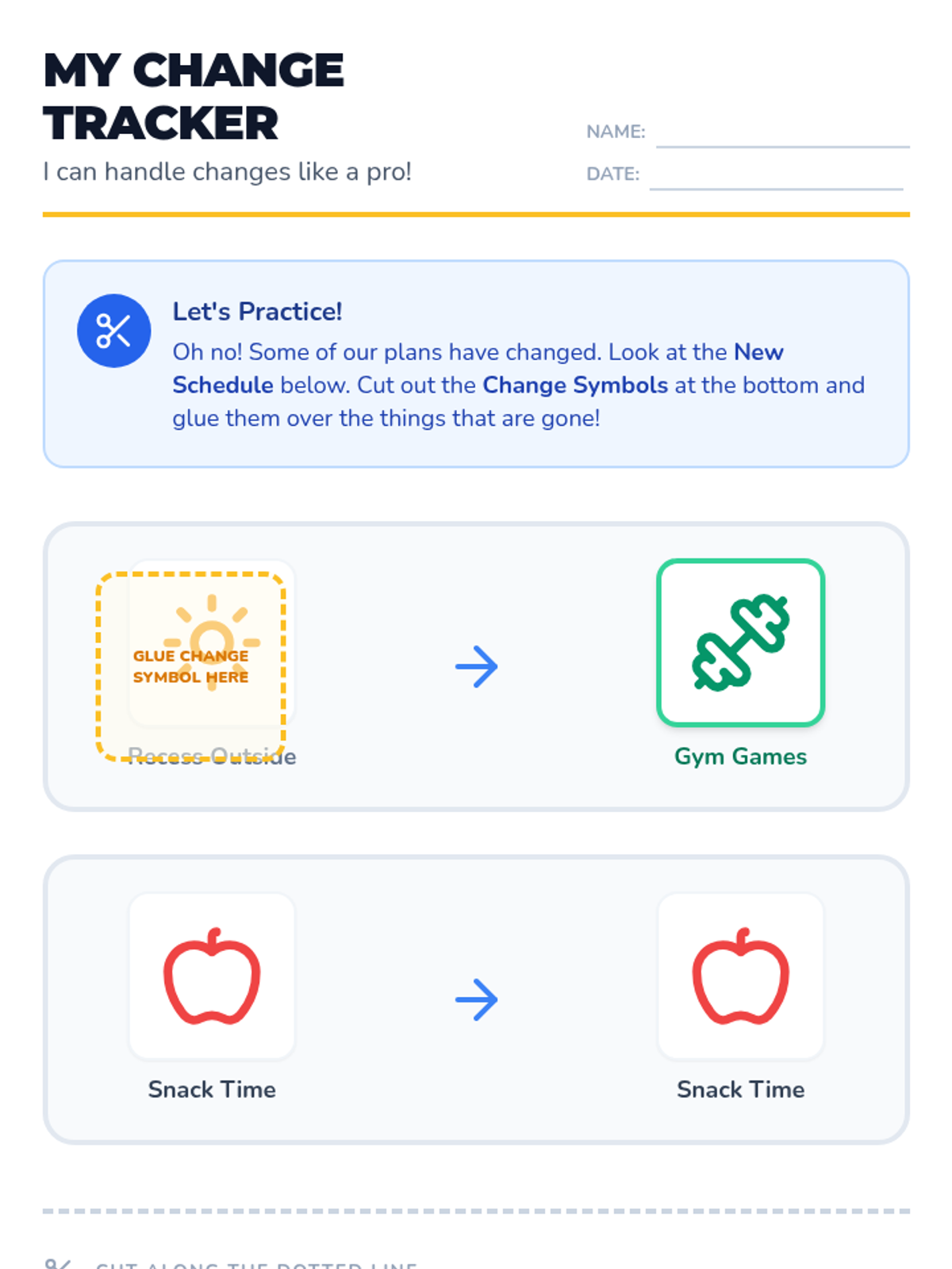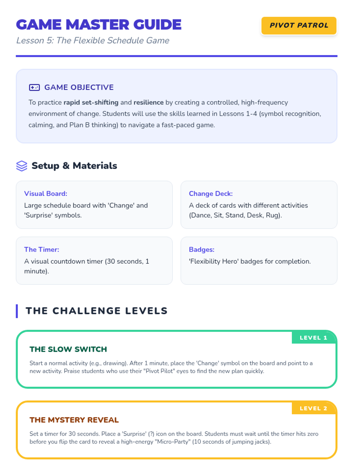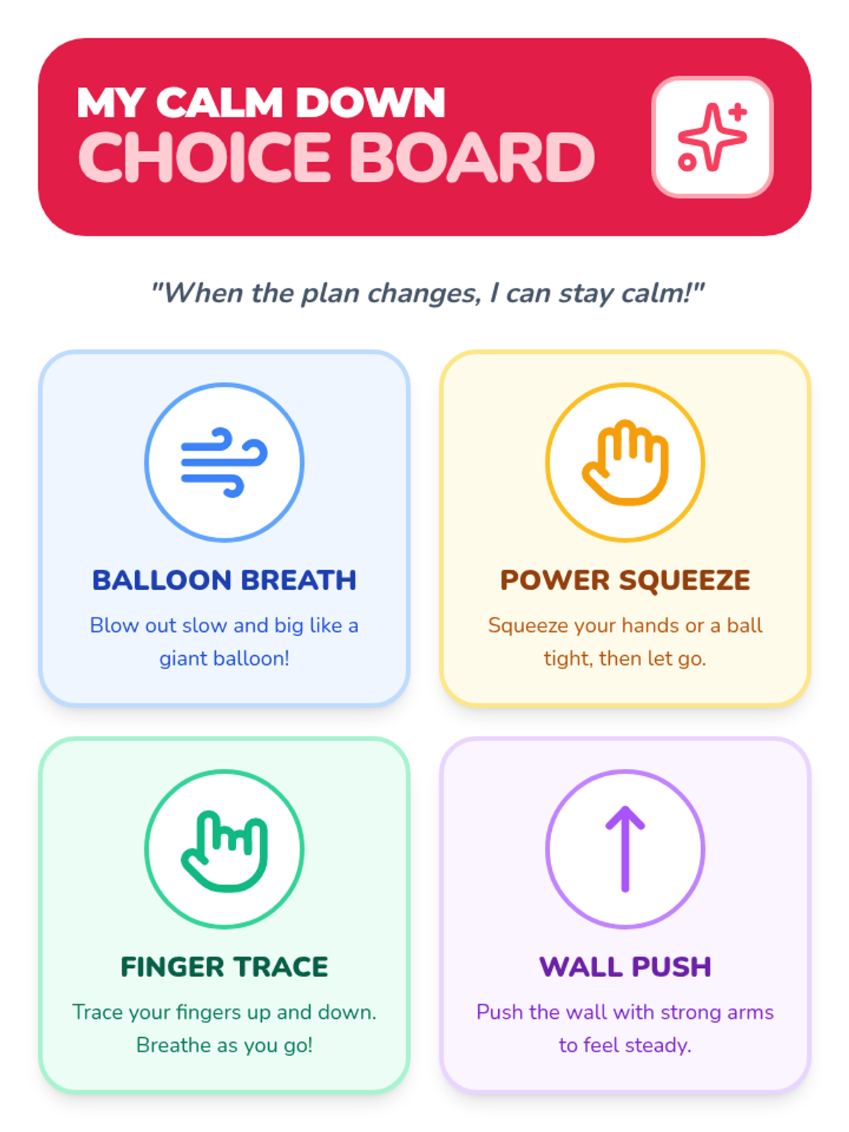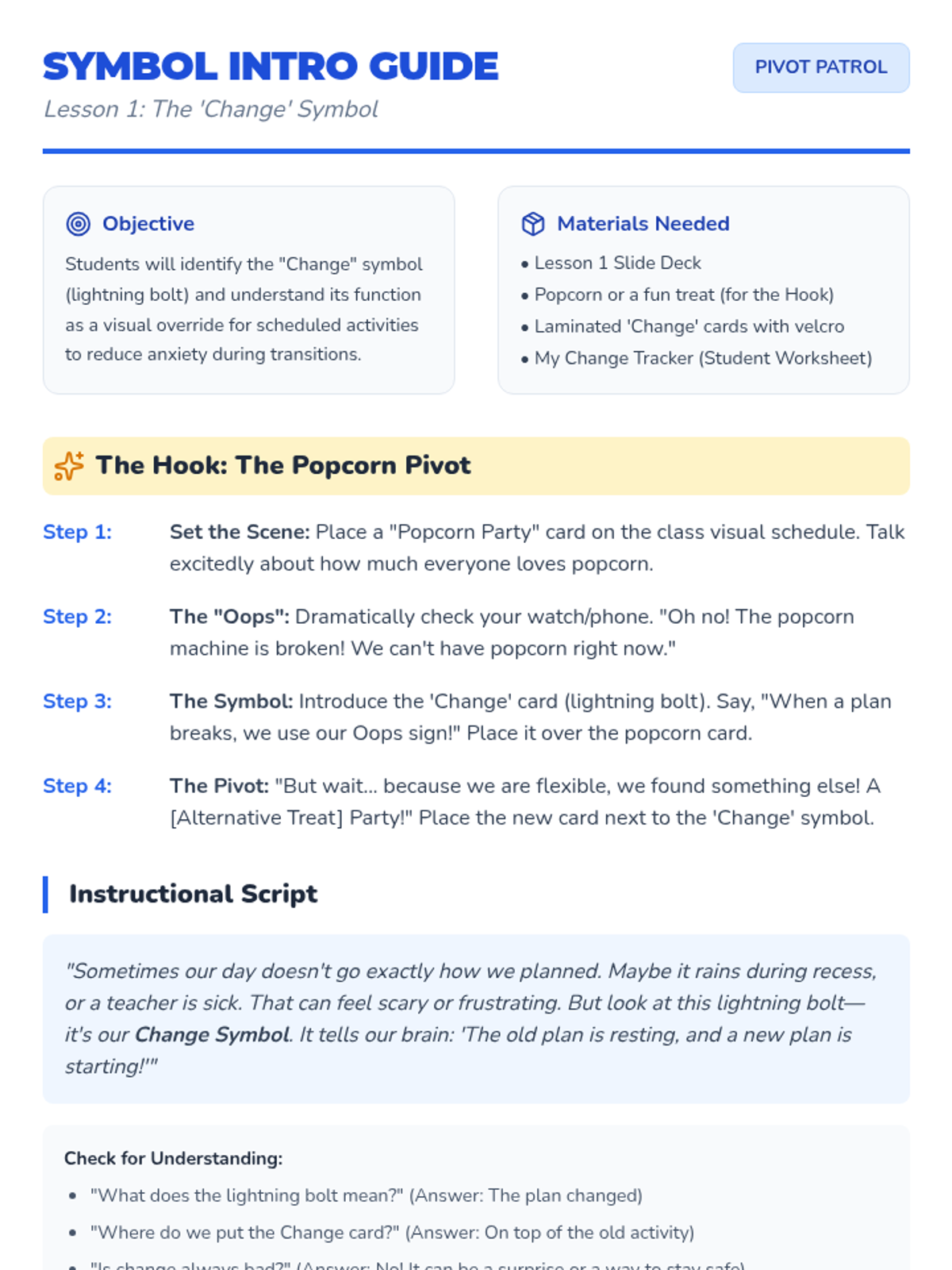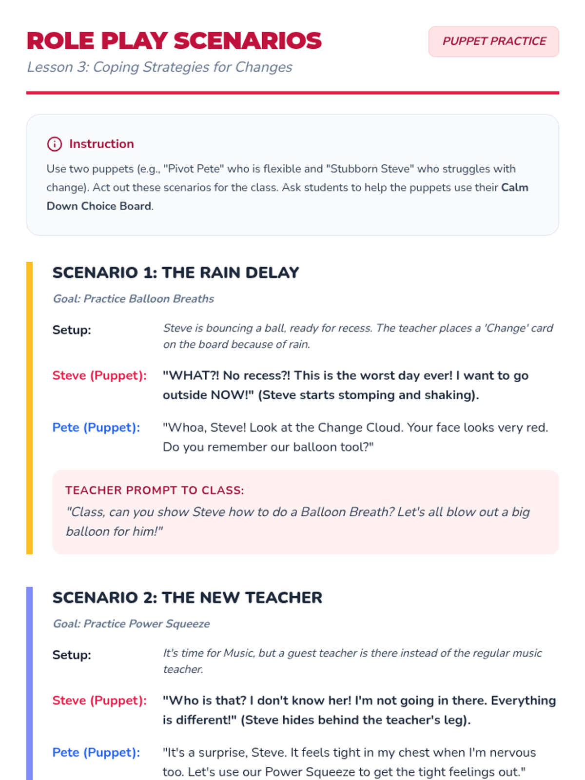 This sequence teaches 1st Grade students how to navigate unexpected schedule changes using visual supports and coping strategies. Students learn to recognize 'Change' and 'Surprise' symbols, practice self-regulation techniques, and develop the problem-solving skills needed to create alternative 'Plan B' options.