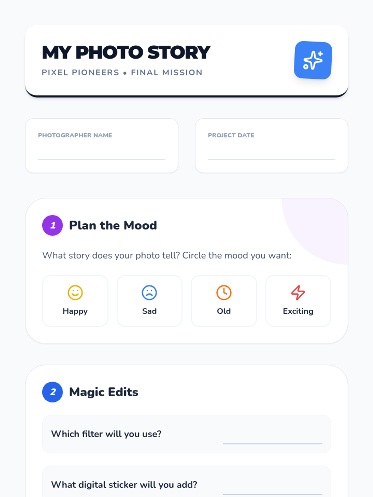 A discovery-based journey for 1st graders into digital photography and basic image editing, moving from device handling to creative storytelling through filters and digital elements.