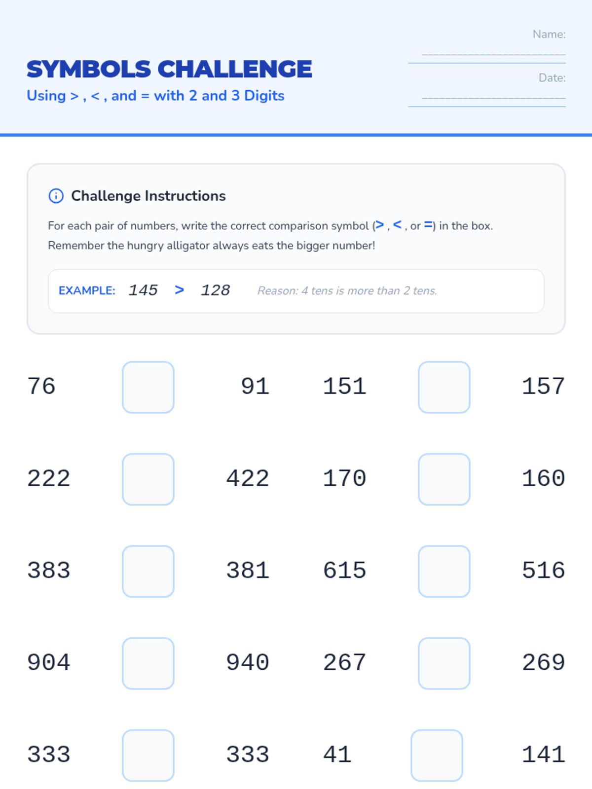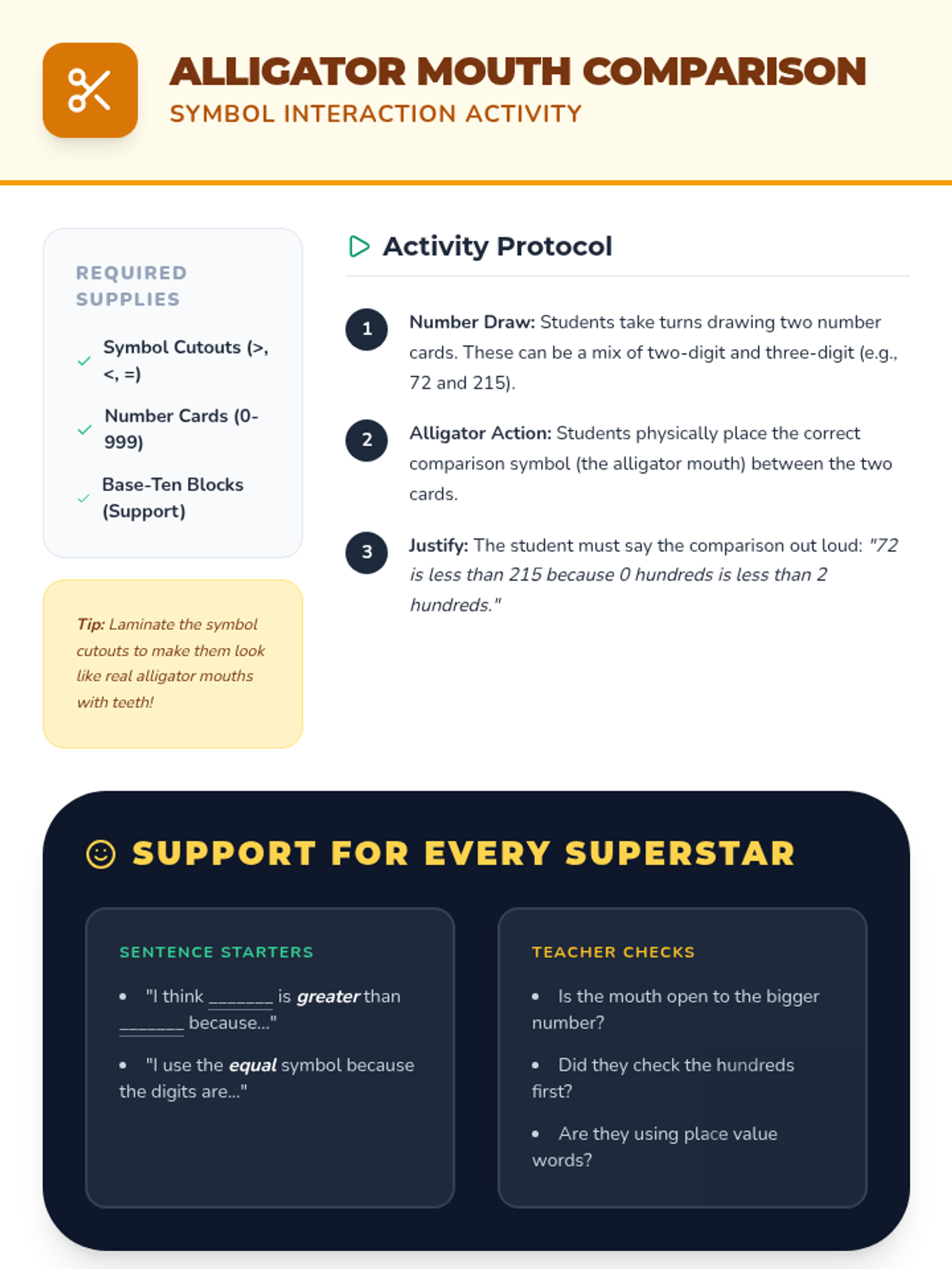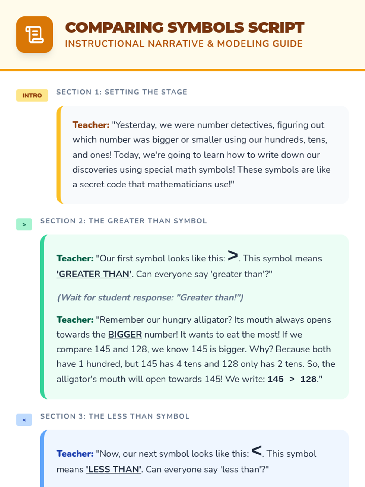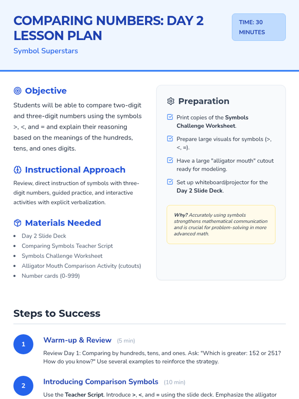 A three-day unit for 2nd and 3rd graders focused on comparing two and three-digit numbers using place value reasoning and comparison symbols (>, <, =). Students move from hands-on conceptual building with blocks to symbolic representation and independent assessment.