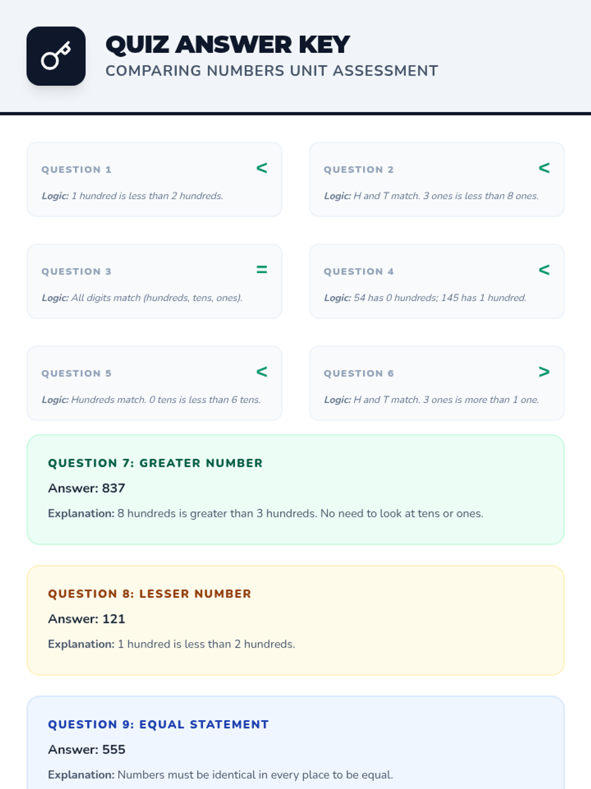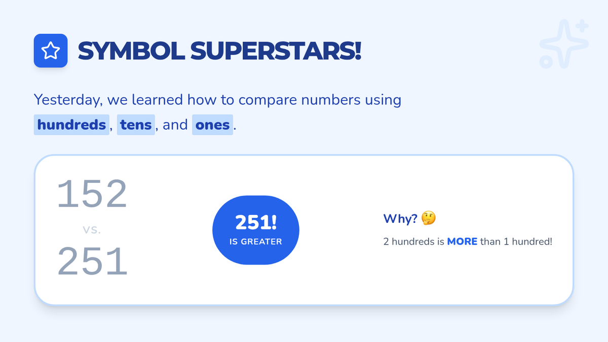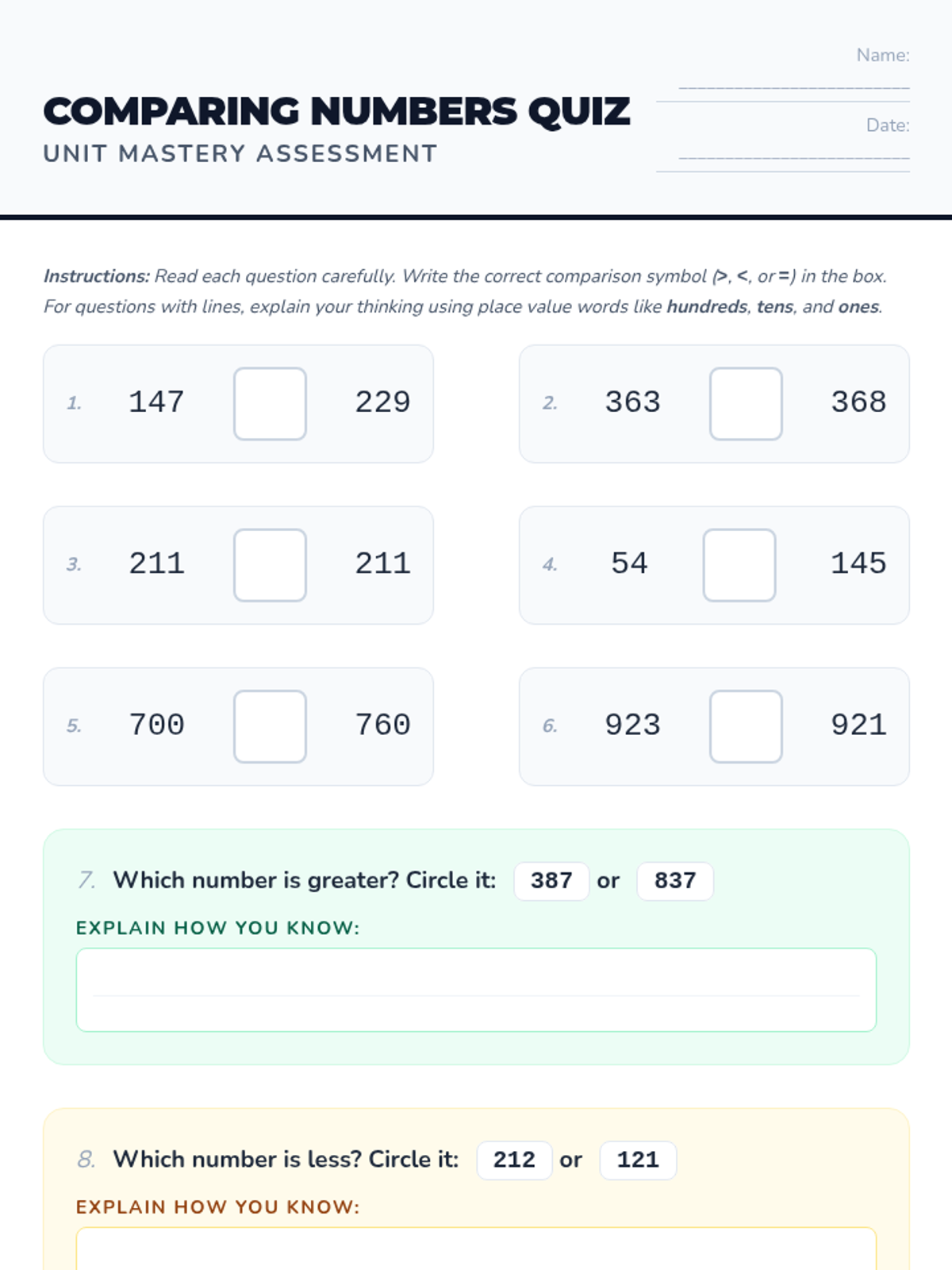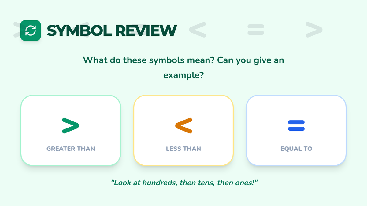 A three-day unit for 2nd and 3rd graders focused on comparing two and three-digit numbers using place value reasoning and comparison symbols (>, <, =). Students move from hands-on conceptual building with blocks to symbolic representation and independent assessment.