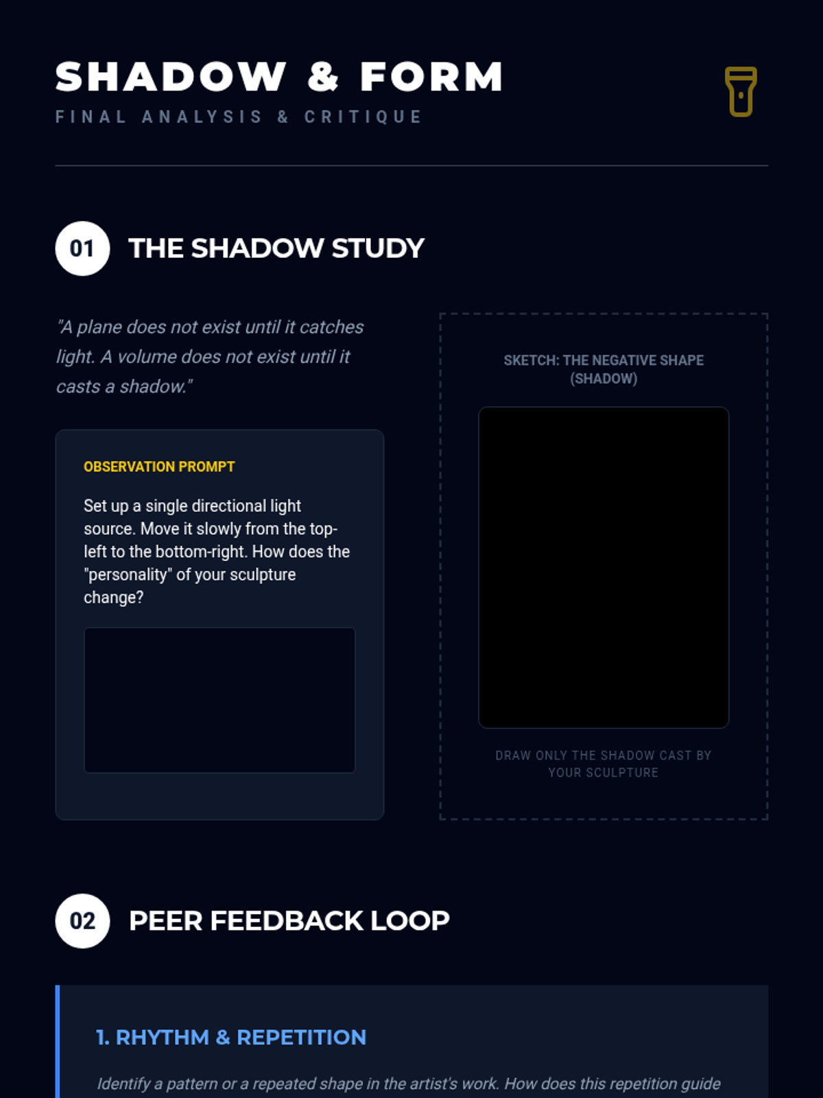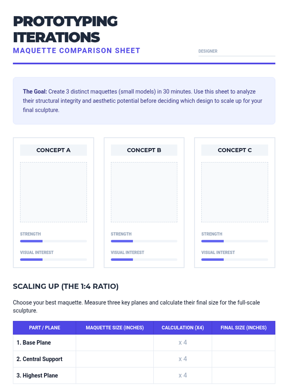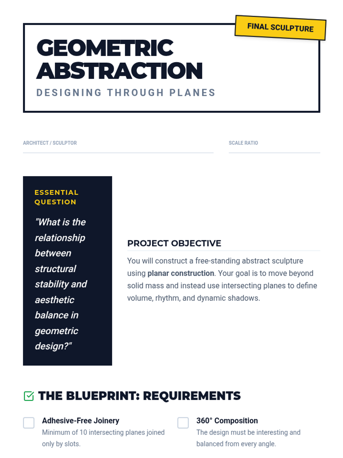 A comprehensive 9th-grade sculpture sequence focusing on planar construction using cardboard. Students transition from 2D geometric shapes to 3D volumes through scoring, folding, and slotting, culminating in a light-and-shadow-focused abstract sculpture.