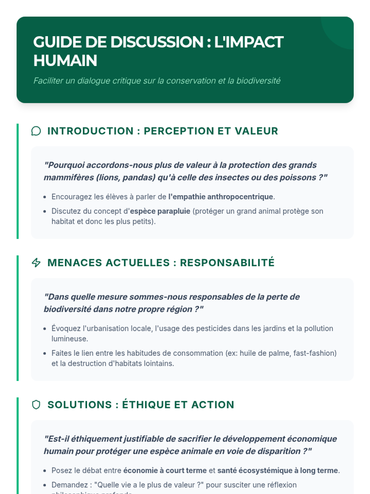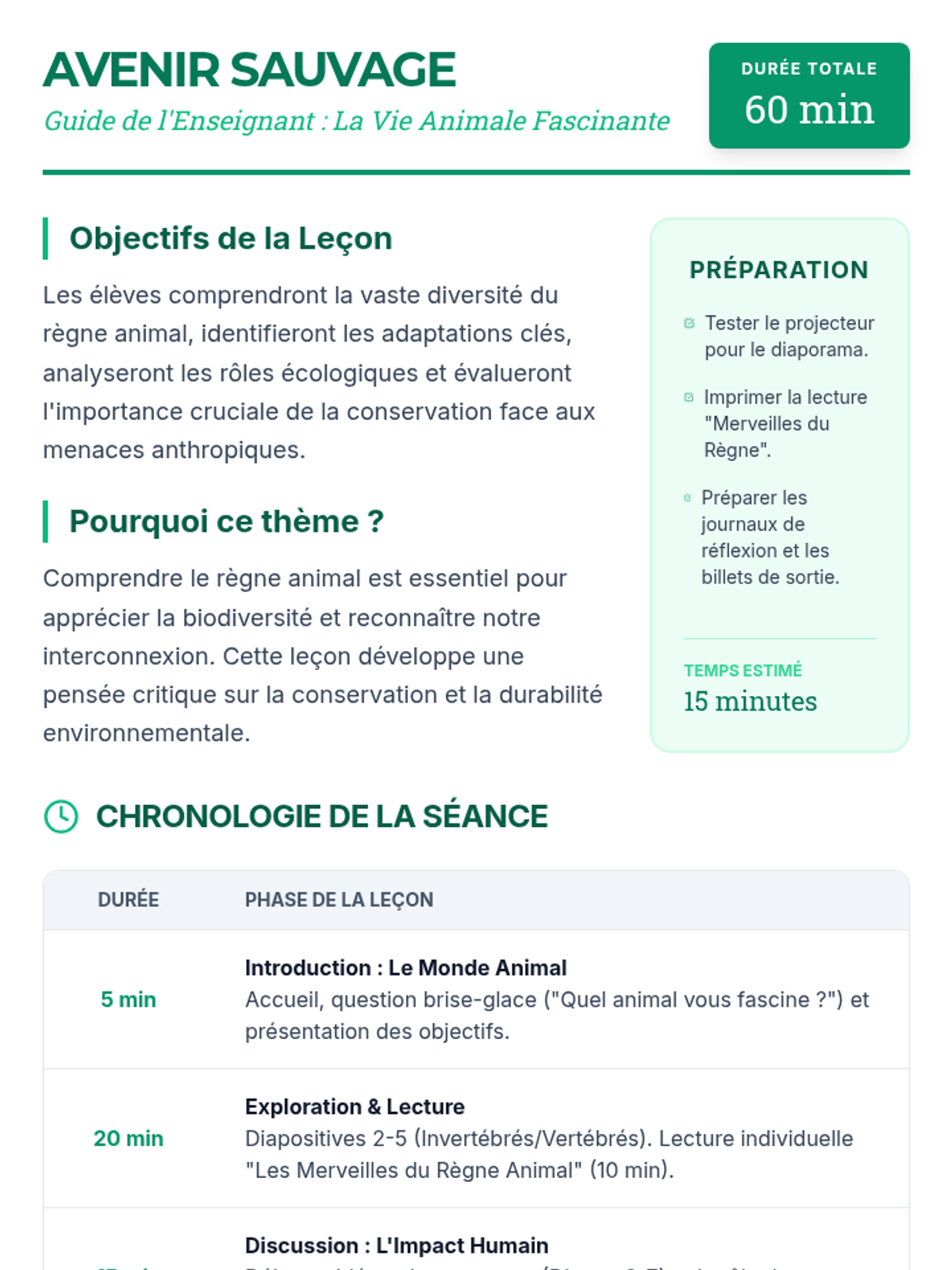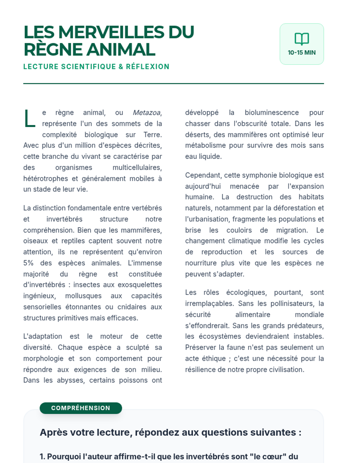 Cette séquence de deux leçons explore la complexité du règne animal, de sa classification taxonomique et son évolution biologique aux défis contemporains de la biodiversité et de la conservation environnementale.