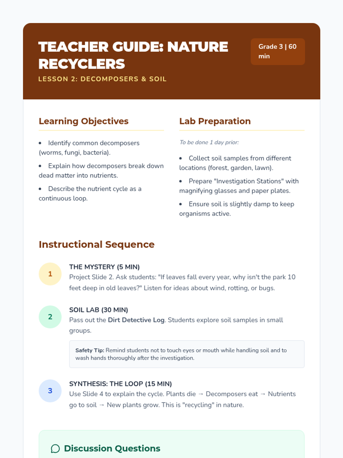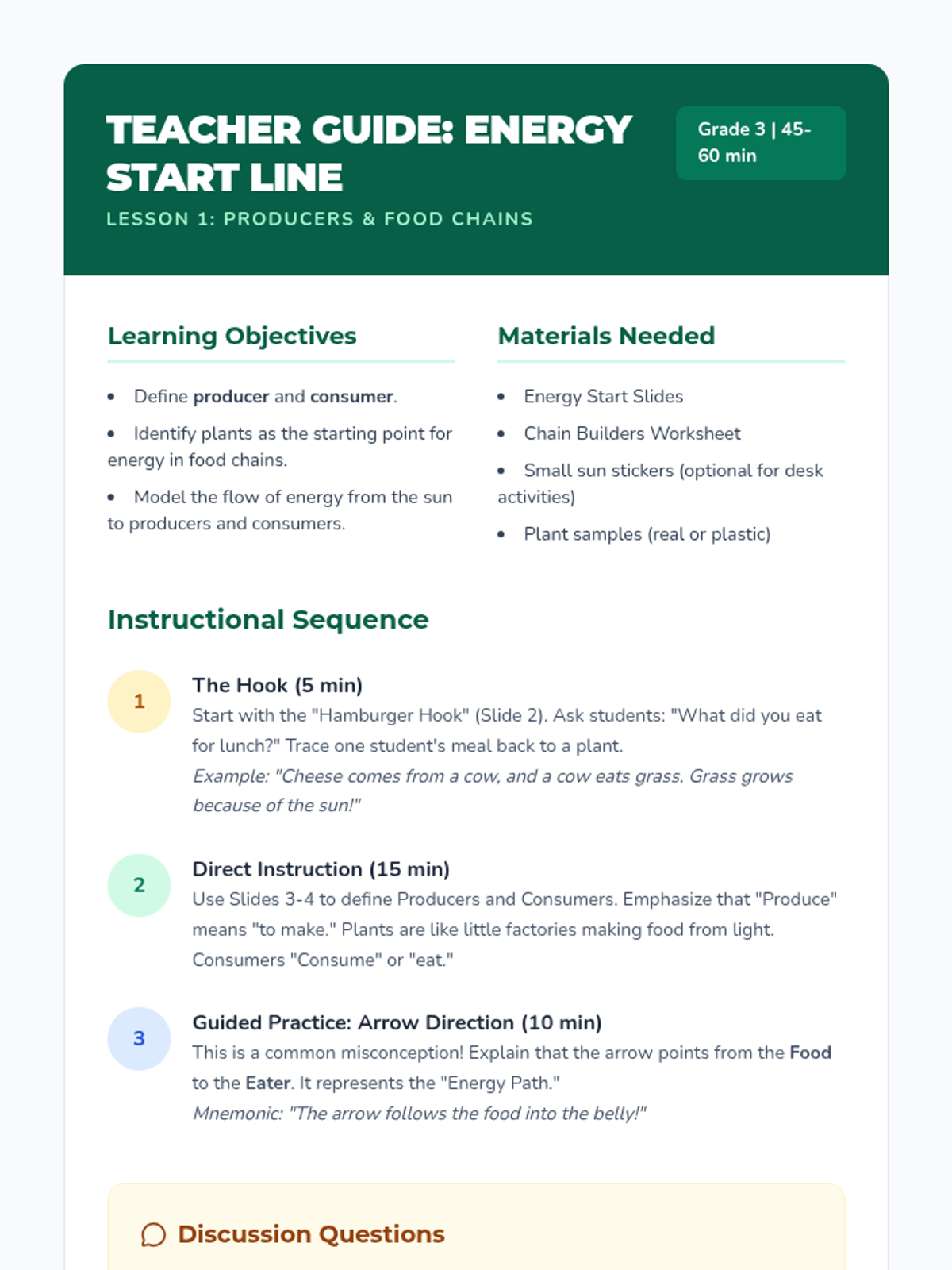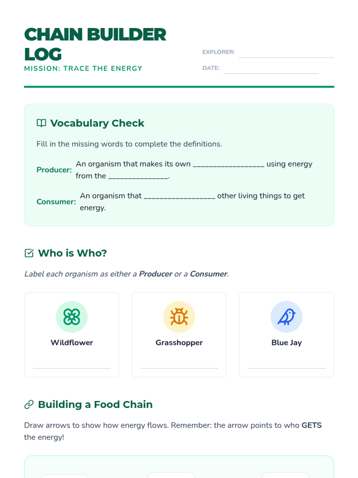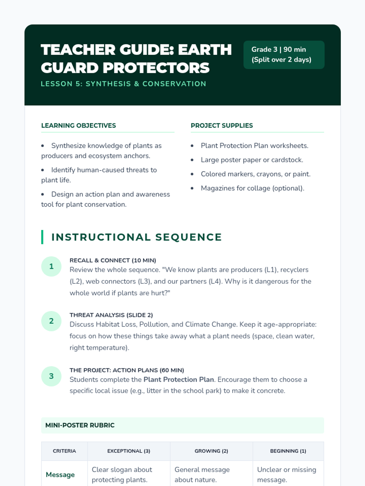 This sequence explores the vital role of plants as producers within ecosystems. Students investigate food chains, the nutrient cycle through decomposition, the complexity of food webs, human dependence on plant life, and their role as stewards of the environment.