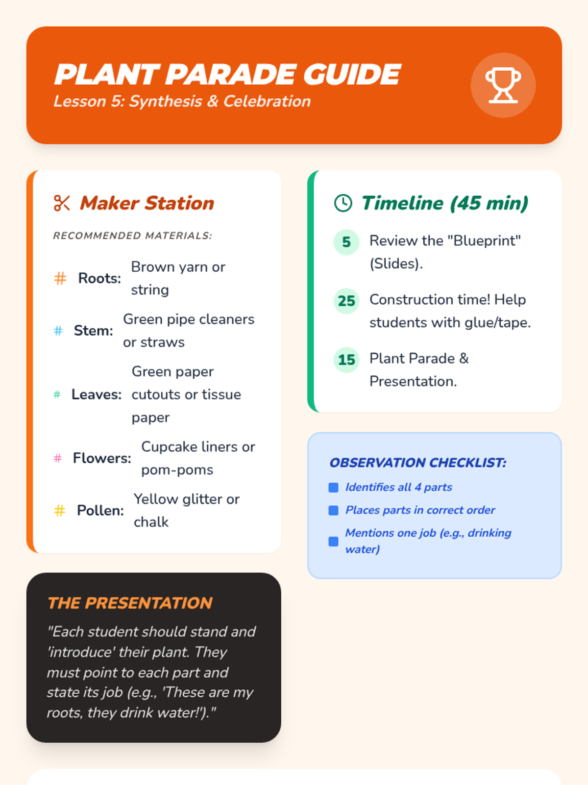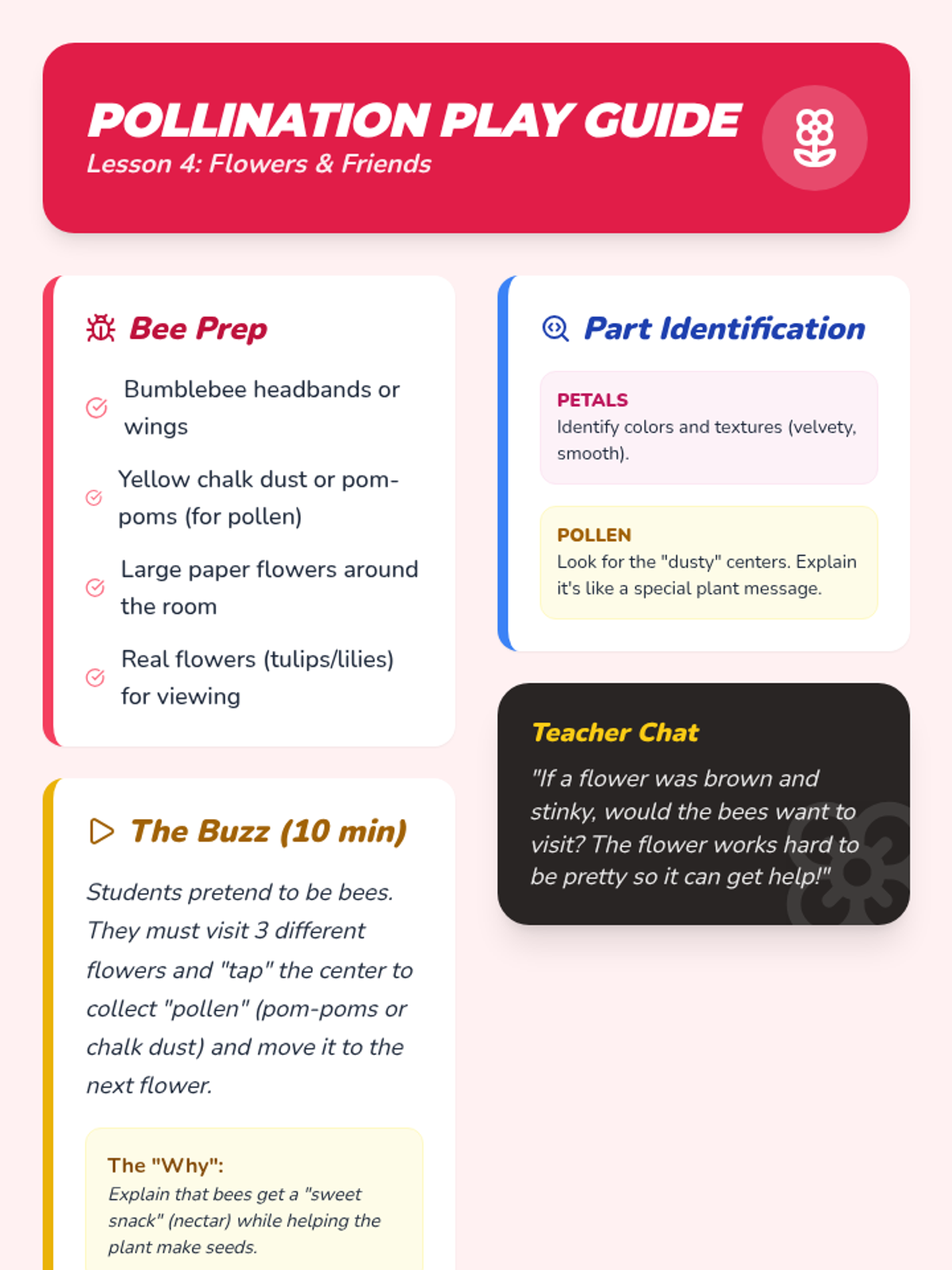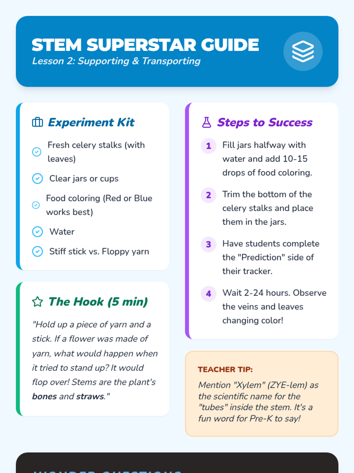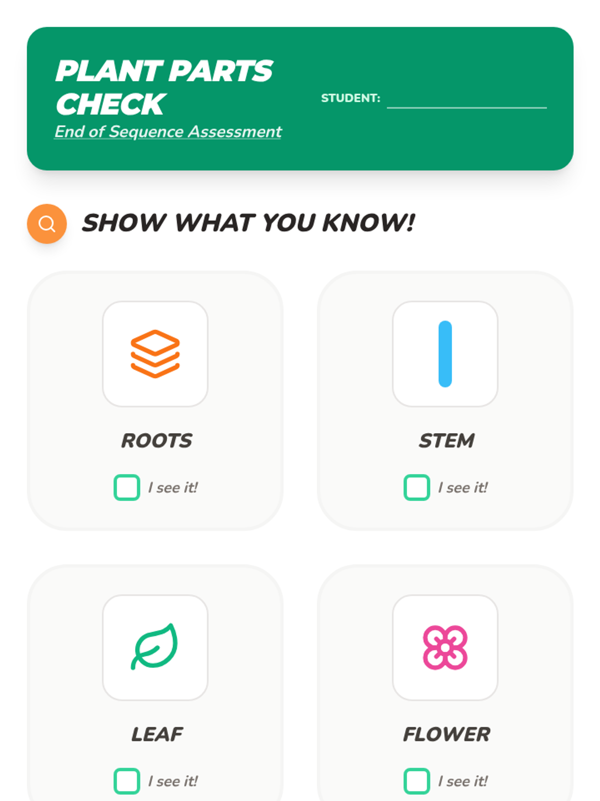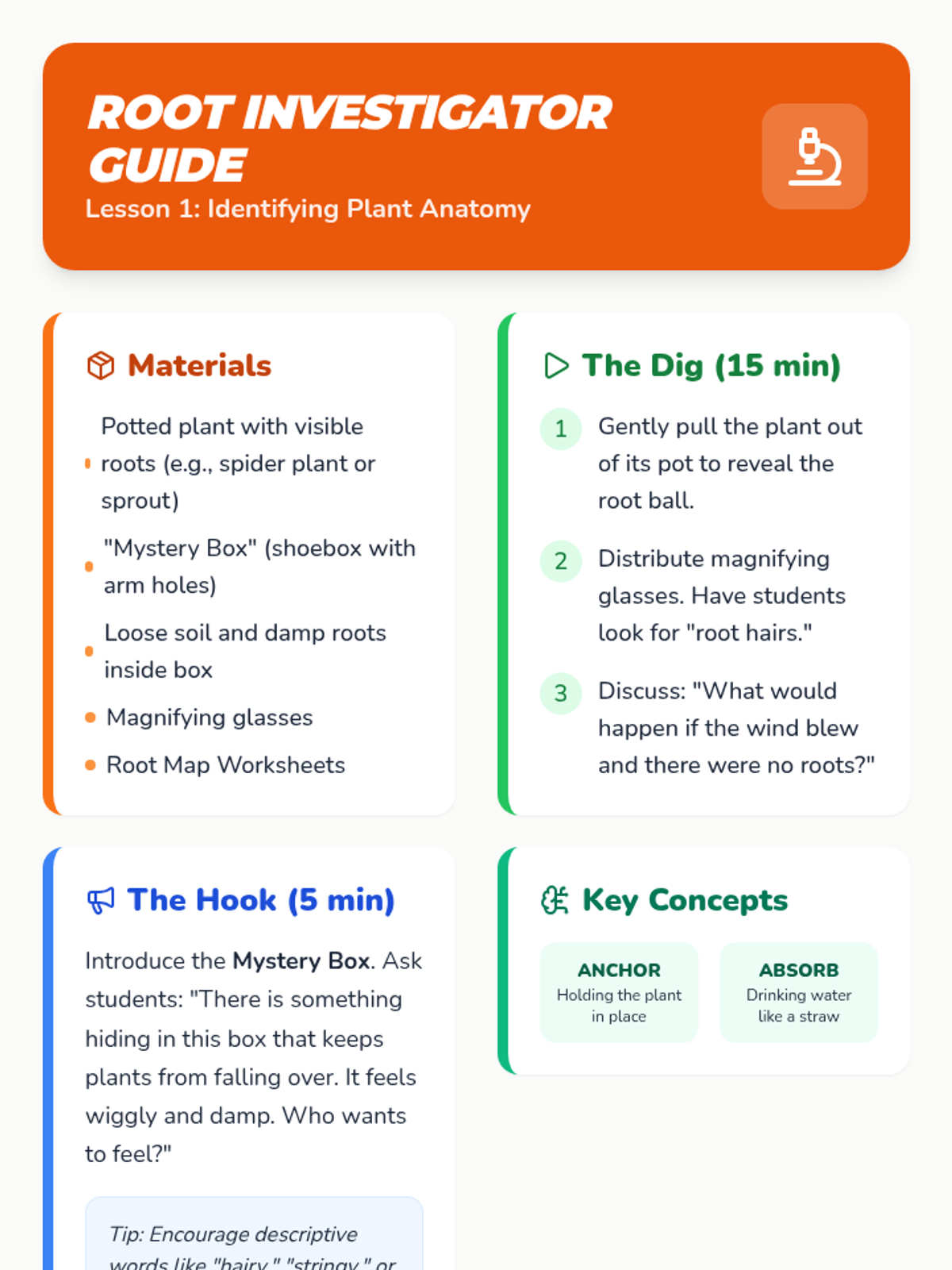 A hands-on inquiry sequence for Pre-K students to explore plant anatomy. Students use sensory exploration and simple experiments to understand the roles of roots, stems, leaves, and flowers.