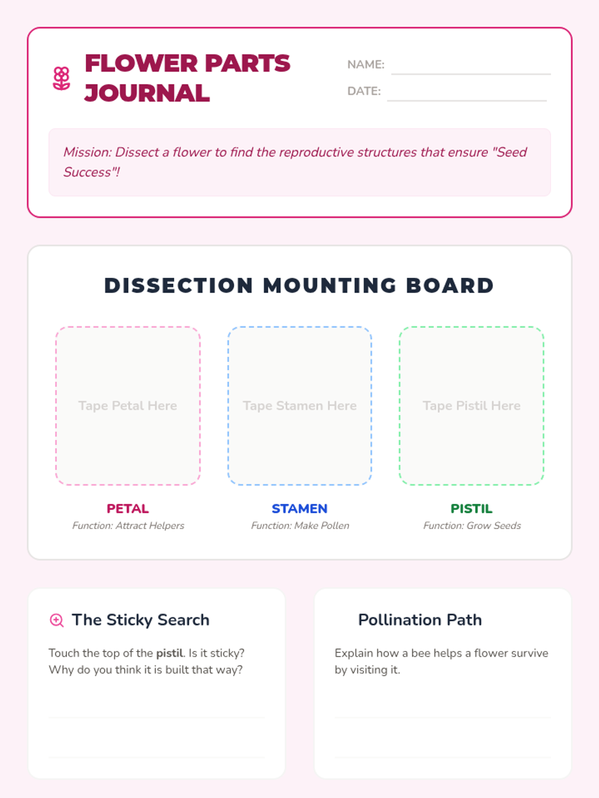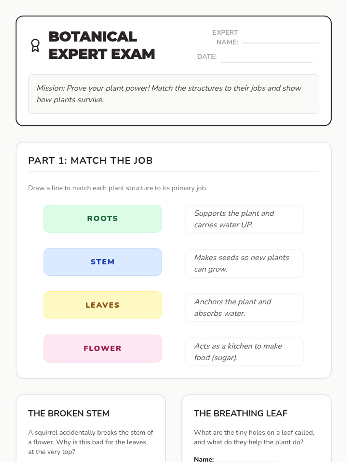 A 5-day unit for 3rd grade students exploring how plant structures like roots, stems, leaves, and flowers function together to ensure survival and growth. Students engage in hands-on investigations and observations to understand botanical systems.