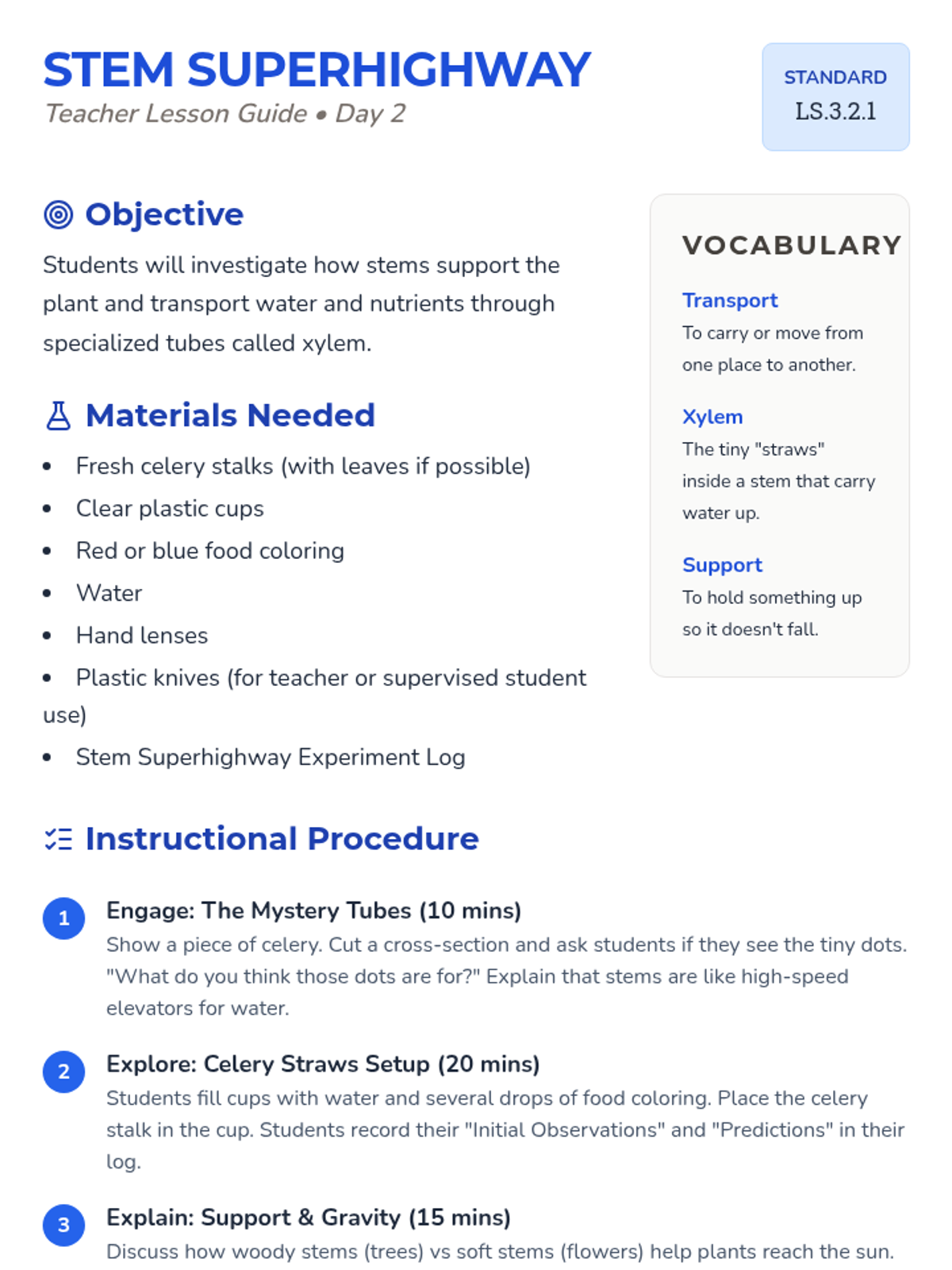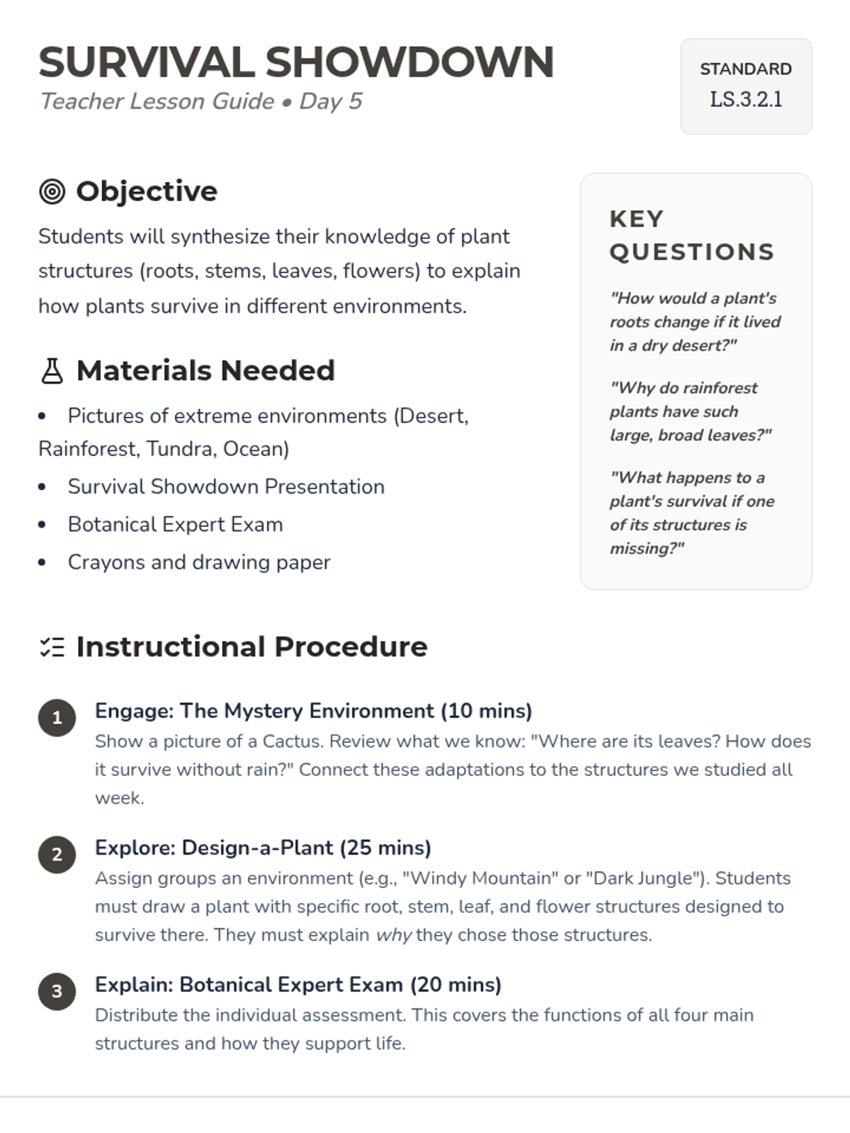 A comprehensive 3rd-grade science sequence exploring how plants grow, survive, and interact with their environment through systematic 20-minute daily lessons.