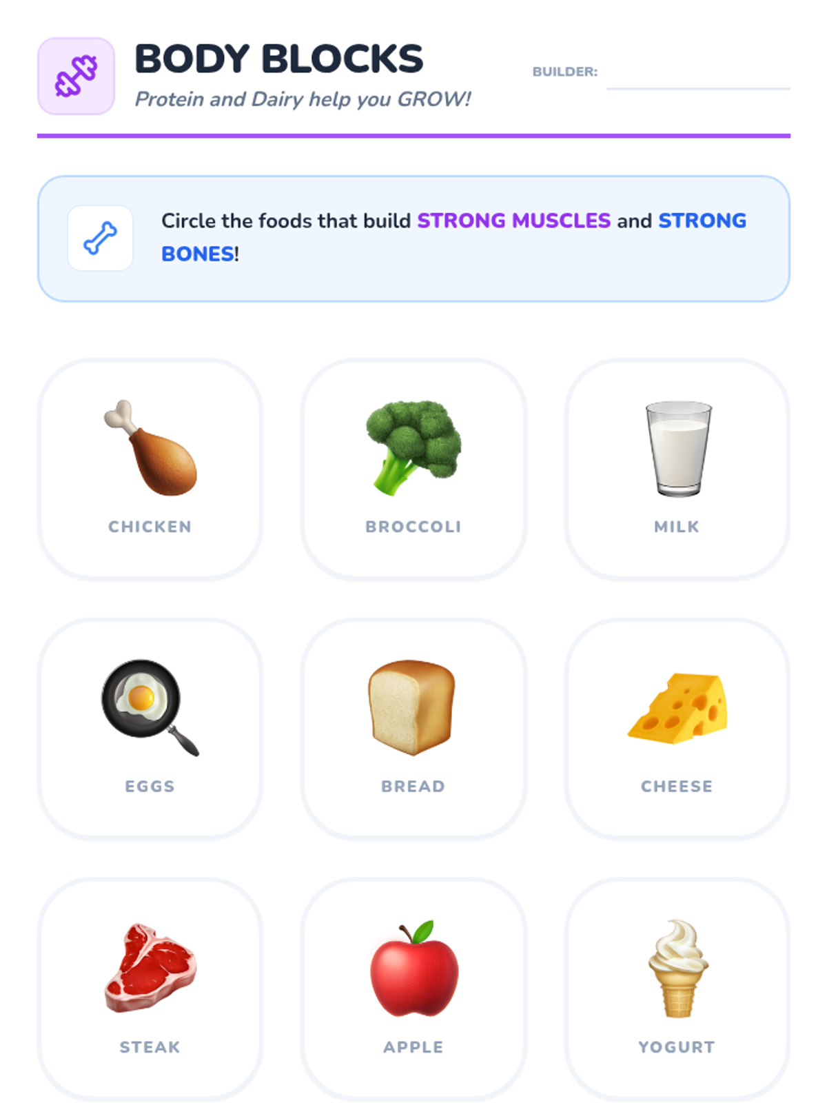 A hands-on exploration for Kindergarteners to identify and categorize the five food groups through games, sensory activities, and creative projects. Students learn the unique benefits of each group, from 'Go Energy' to 'Body Builders.'