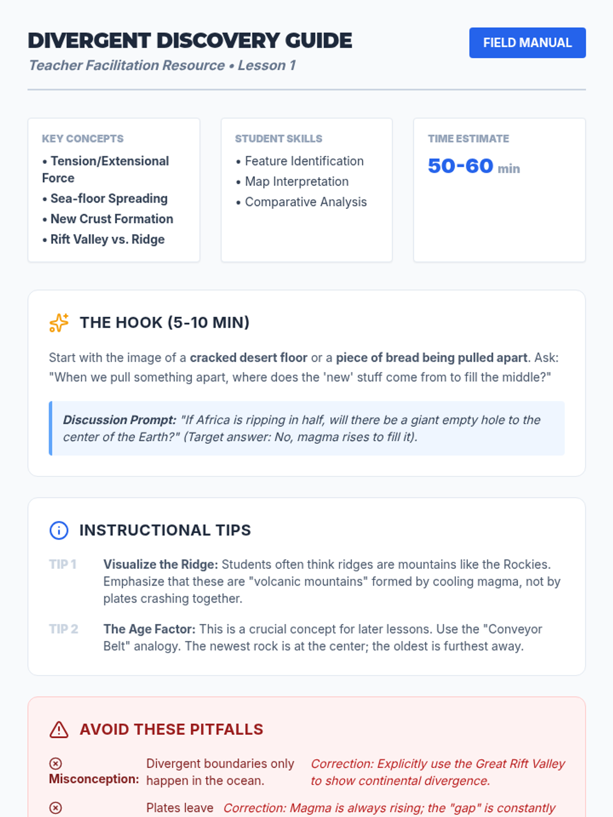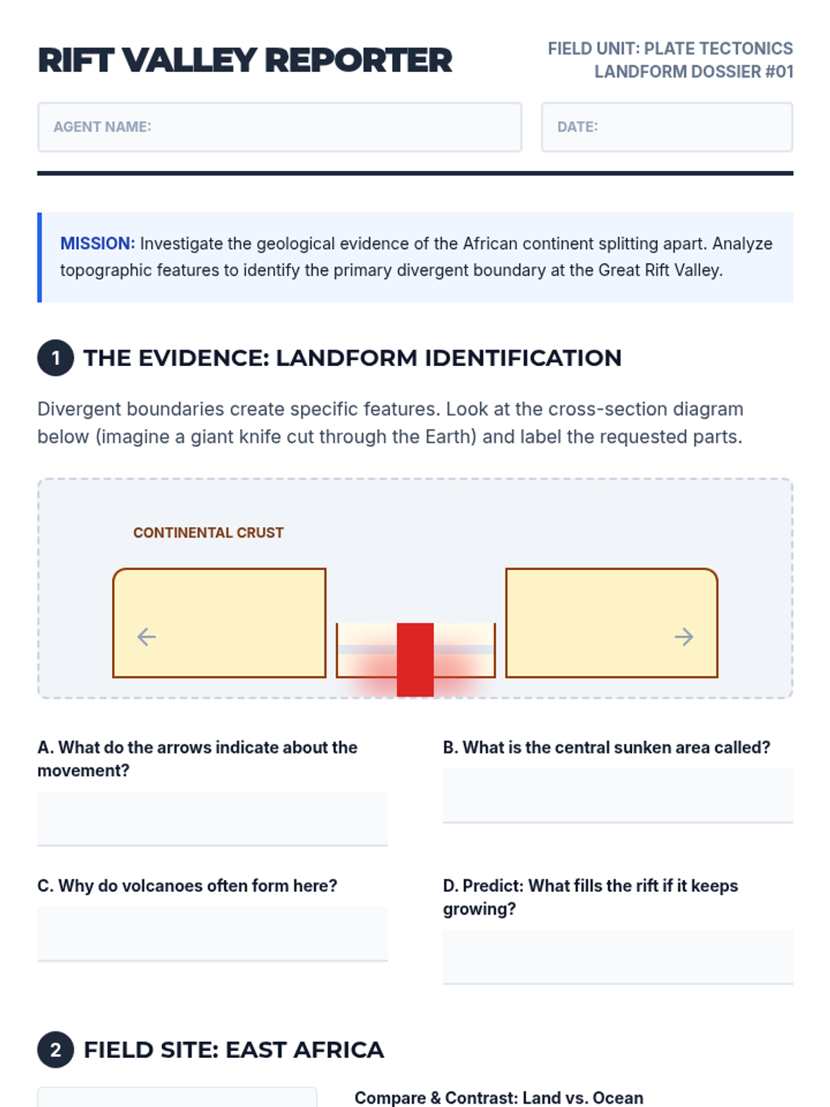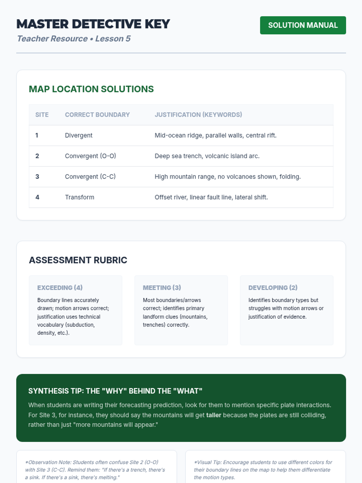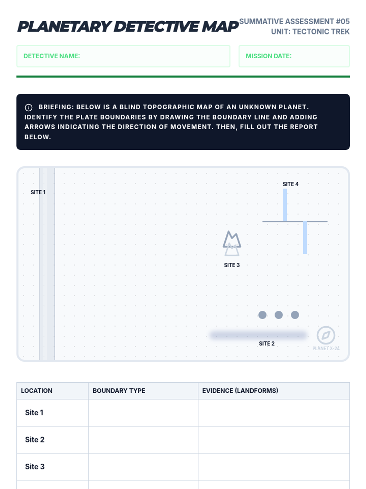 A comprehensive 7th-grade unit on tectonic plate boundaries, focusing on the identification of landforms and the geological processes that shape Earth's surface. Students move from individual boundary types to synthesizing map data.