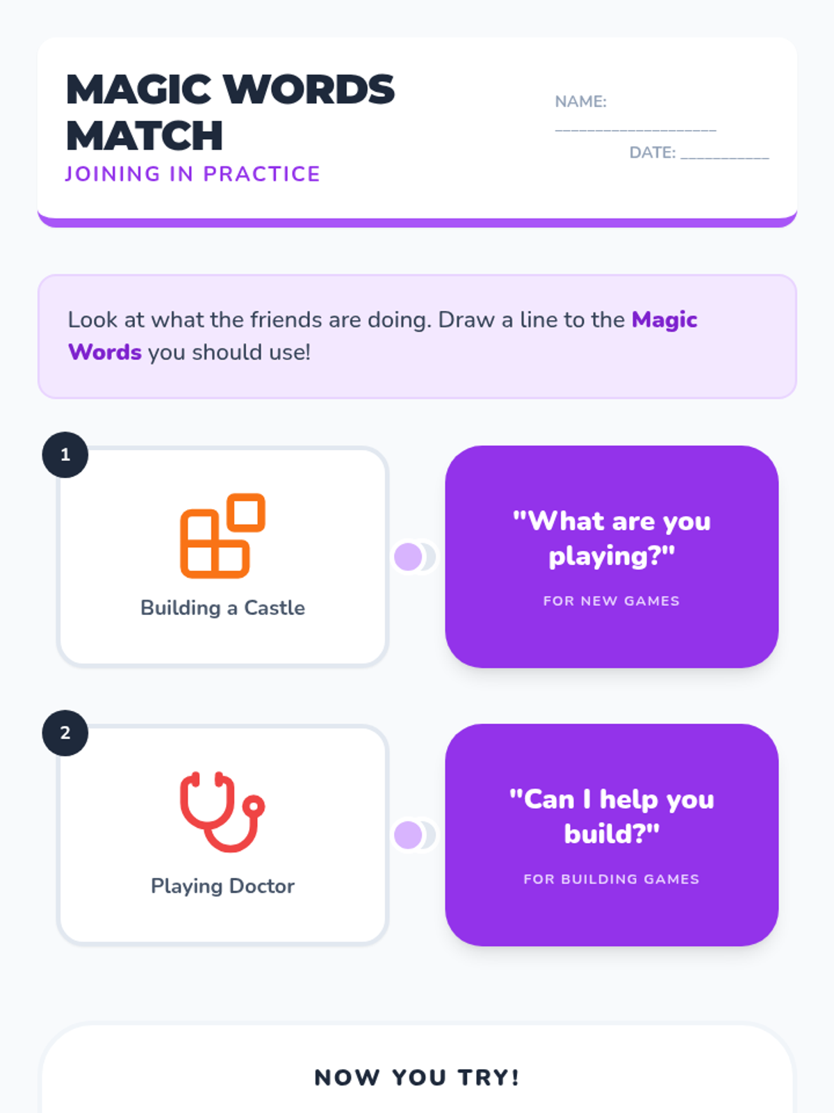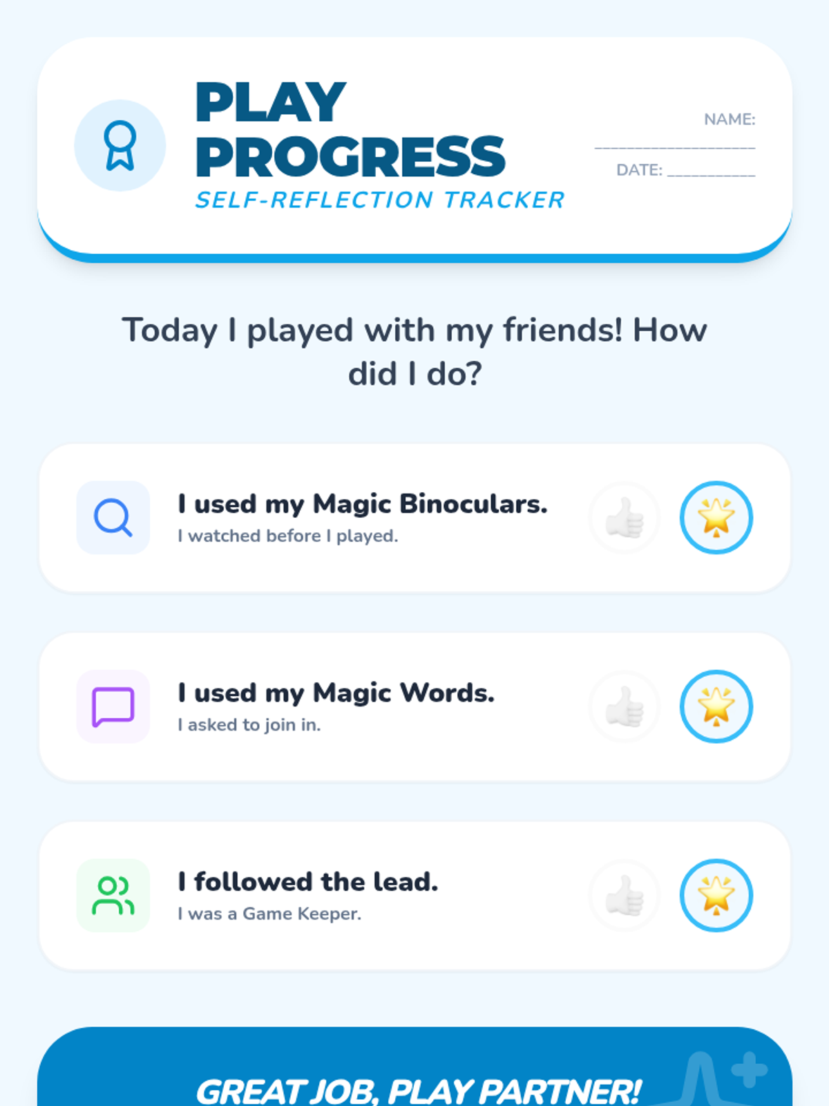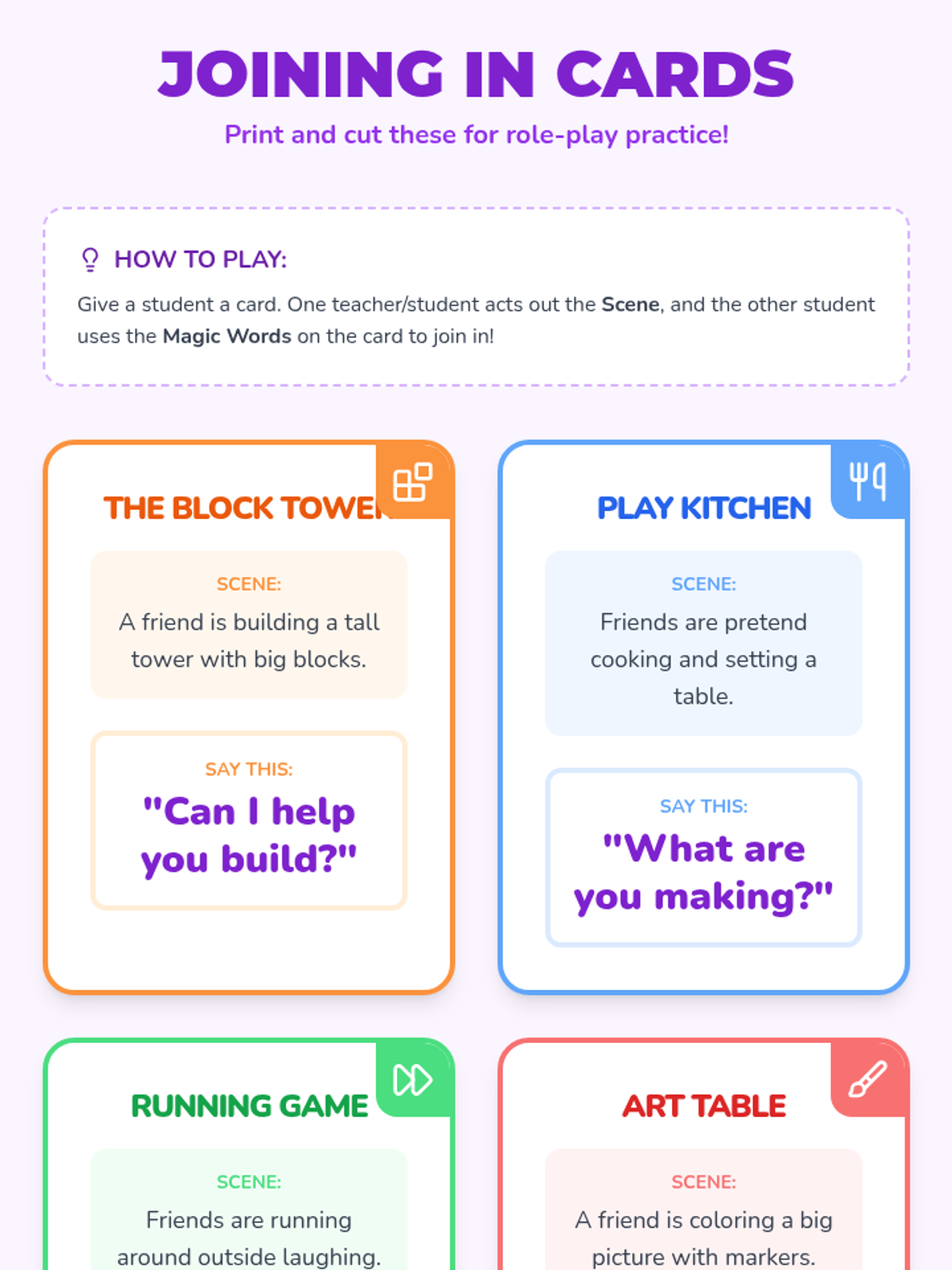 A Pre-K social communication sequence focused on observing, joining, and maintaining cooperative play. Students learn to evaluate play themes, use effective entry requests, identify roles, handle rejection, and sustain group activities.