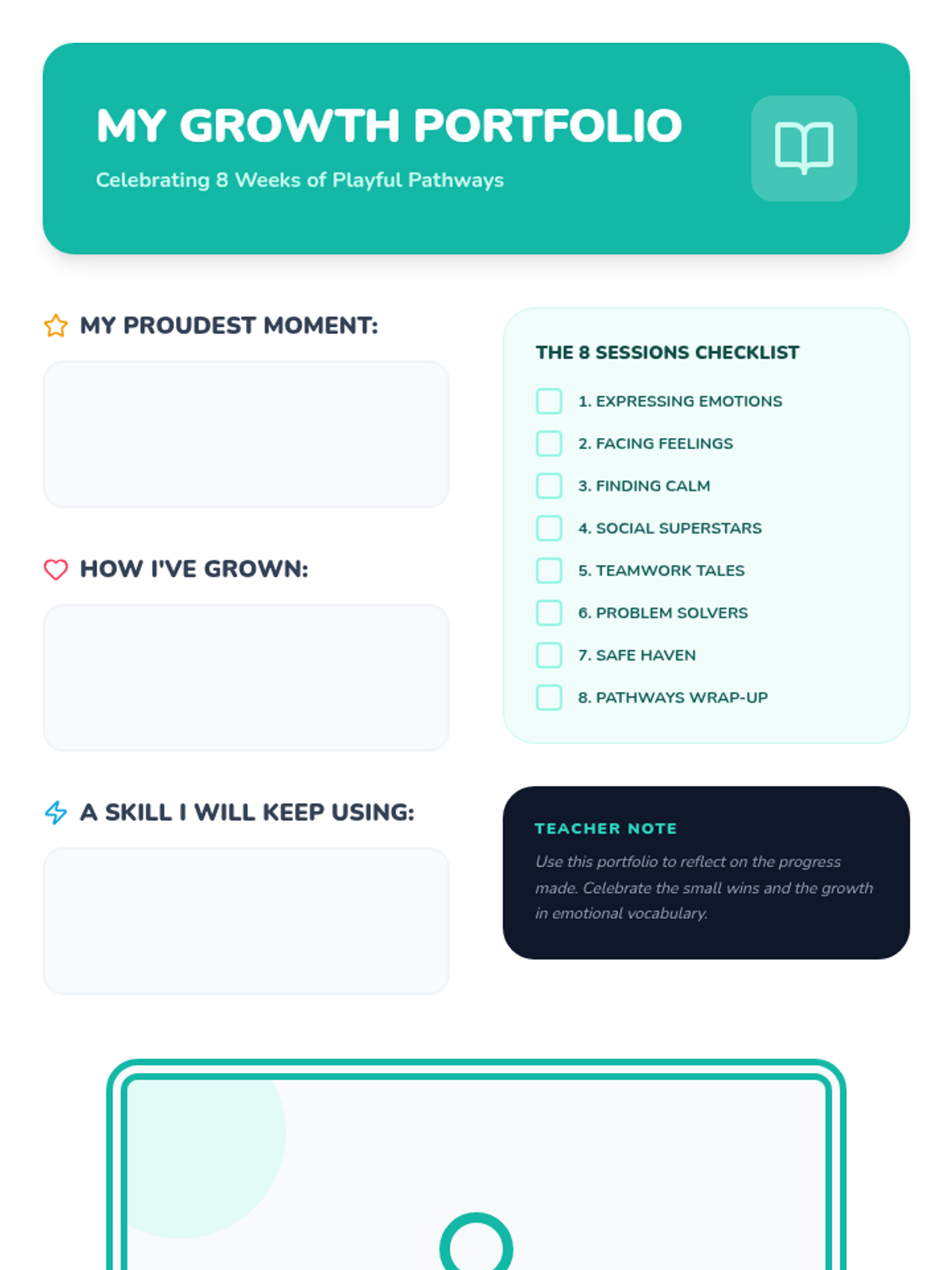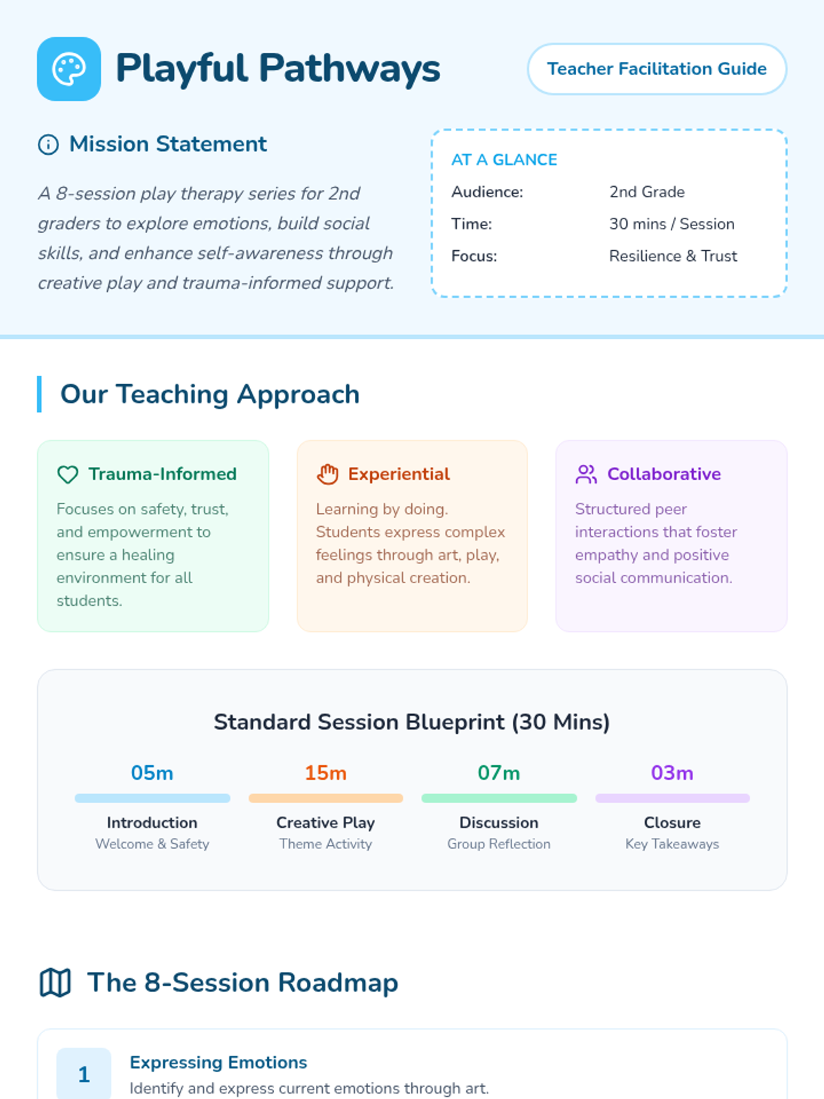 A series of 8 play therapy sessions for second graders to explore emotions, build social skills, and enhance self-awareness through creative and trauma-informed play. Each session focuses on safety, trust, and empowerment to foster emotional resilience.