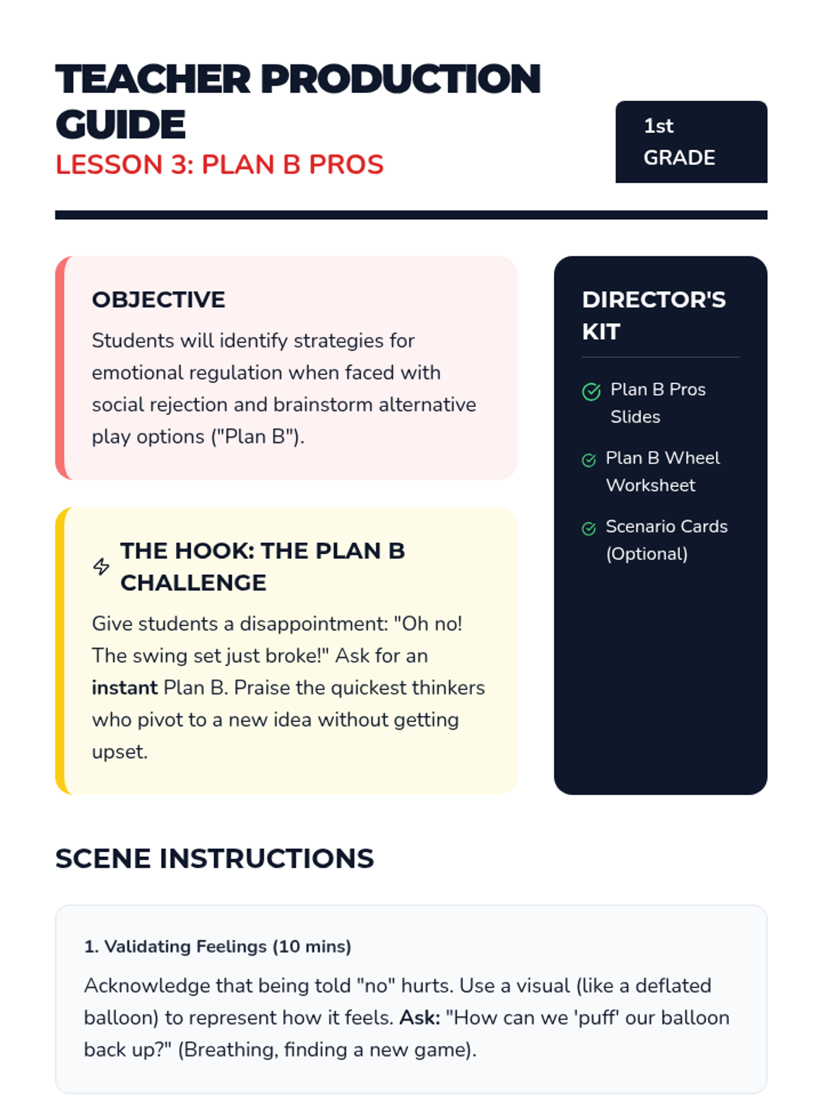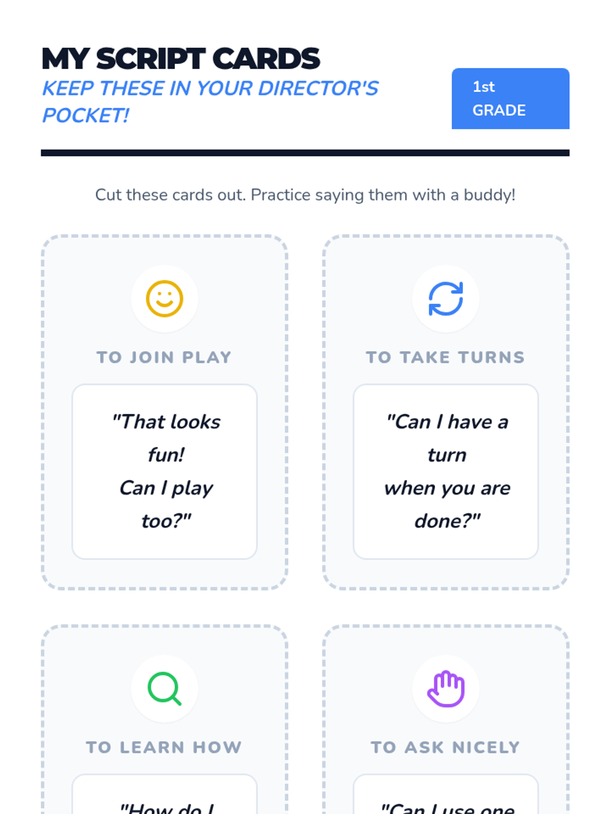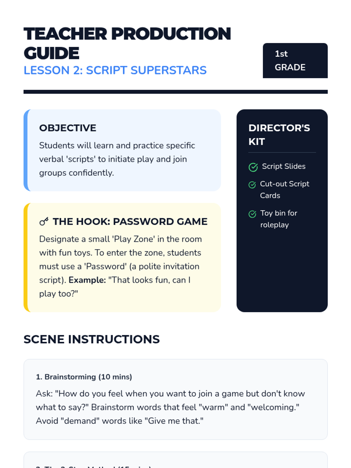 A 5-lesson sequence for 1st-grade students focusing on social skills through the lens of a movie studio. Students learn to identify social conflicts, develop verbal 'scripts' for play, handle rejection with 'Plan B' strategies, and create their own social storyboards to model positive peer interactions.
