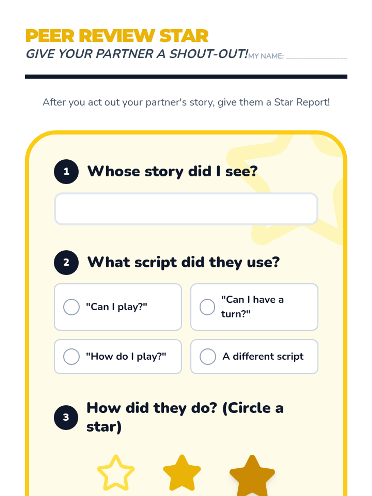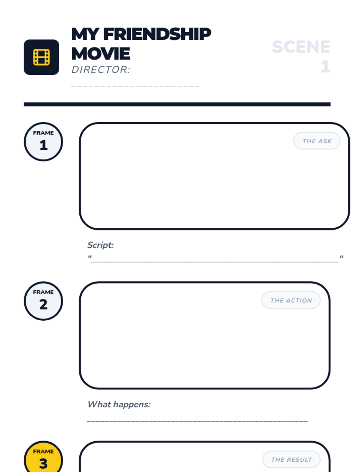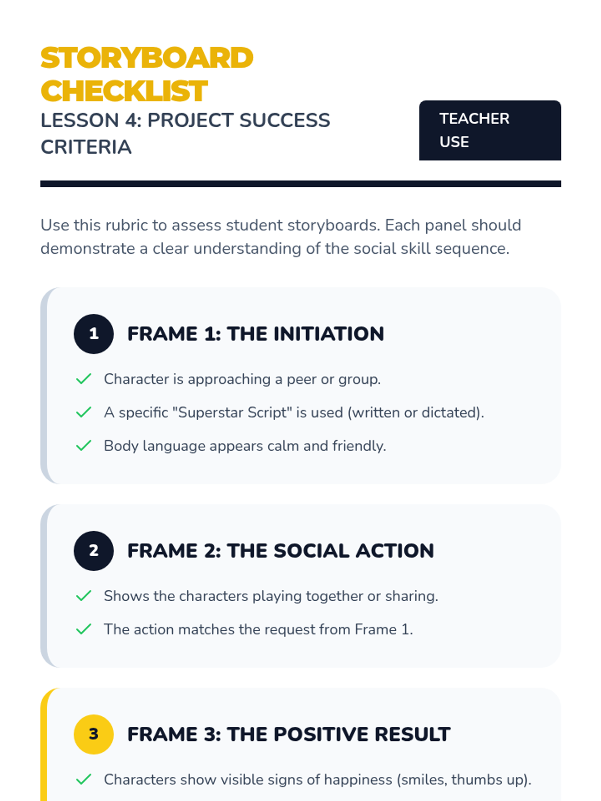 A 5-lesson sequence for 1st-grade students focusing on social skills through the lens of a movie studio. Students learn to identify social conflicts, develop verbal 'scripts' for play, handle rejection with 'Plan B' strategies, and create their own social storyboards to model positive peer interactions.