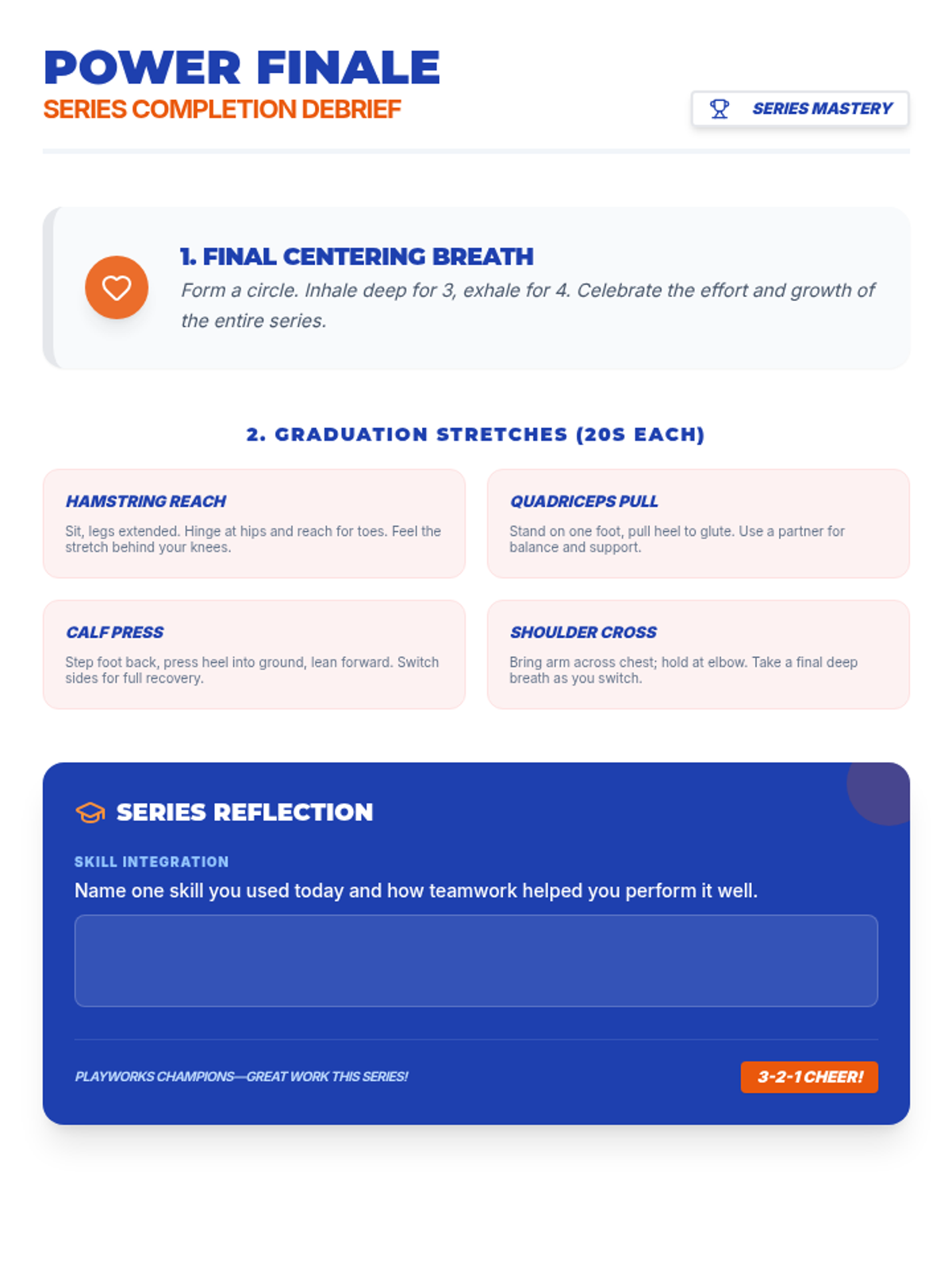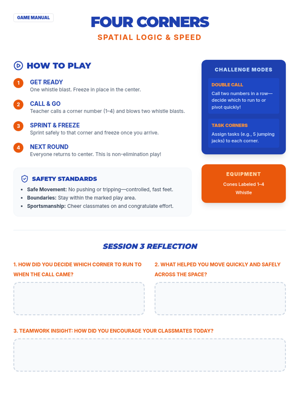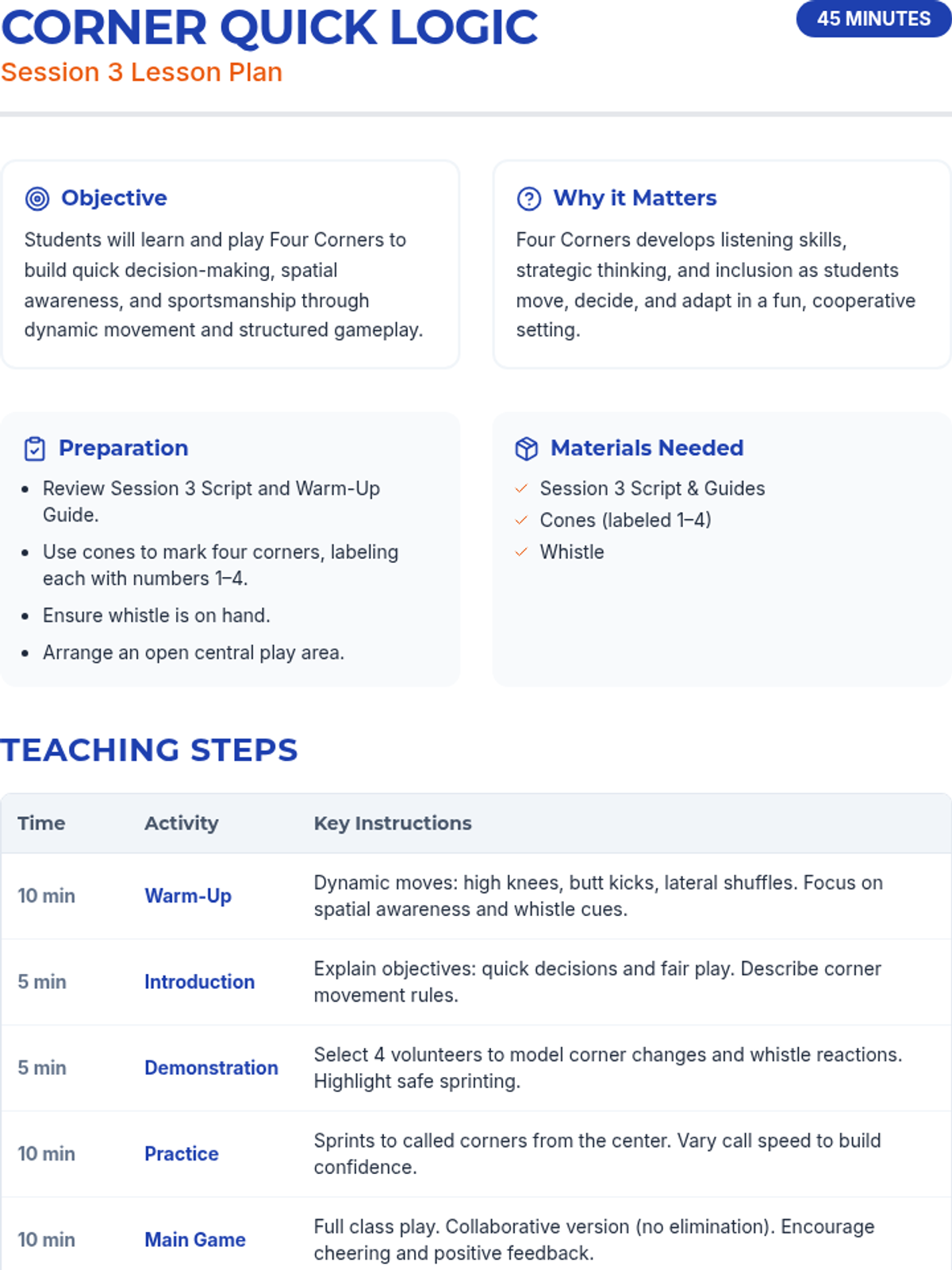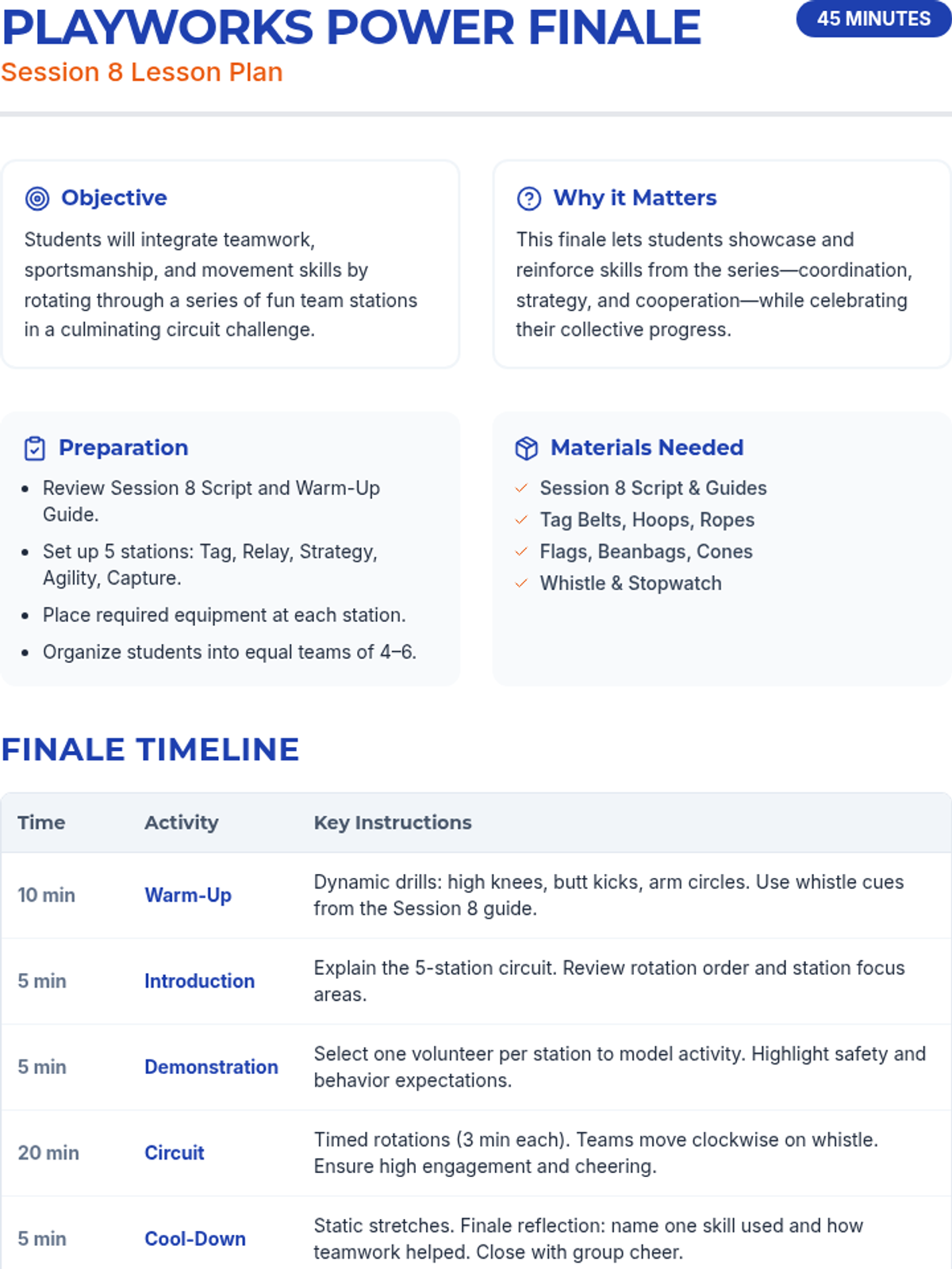 An 8-session middle school PE series focusing on teamwork, agility, and sportsmanship through structured Playworks games. Each session includes complete lesson plans, scripts, and guides to ensure a fun and active learning environment.