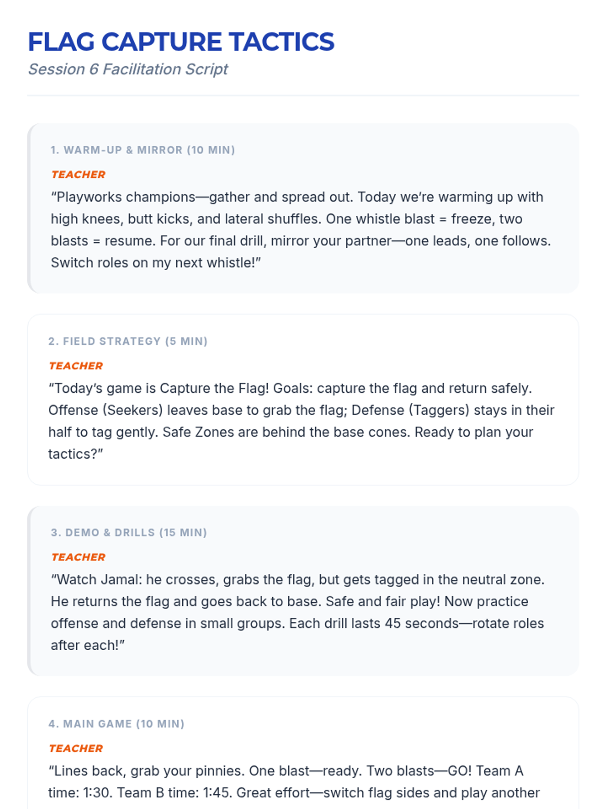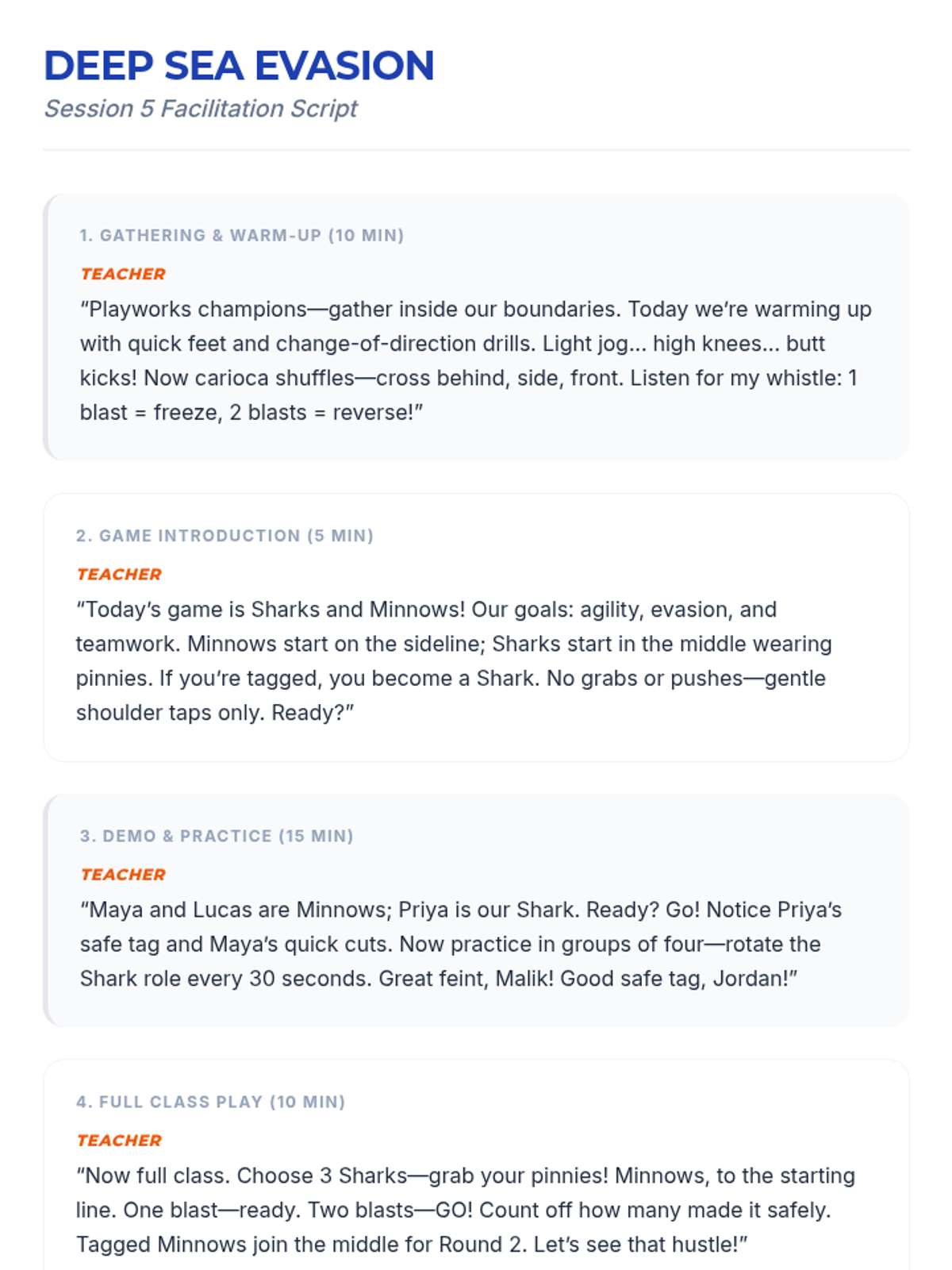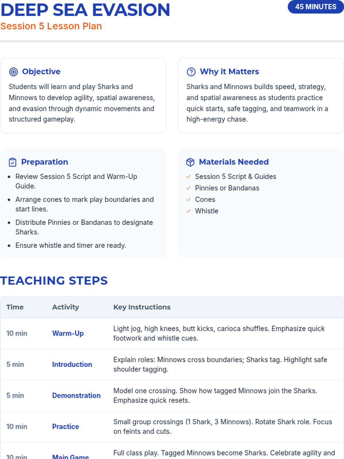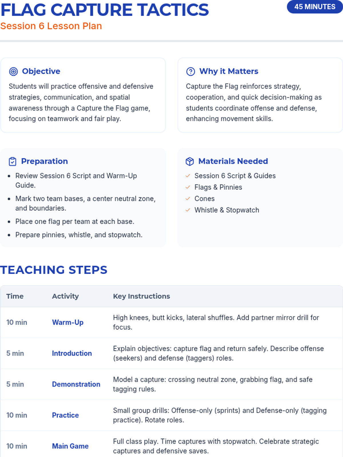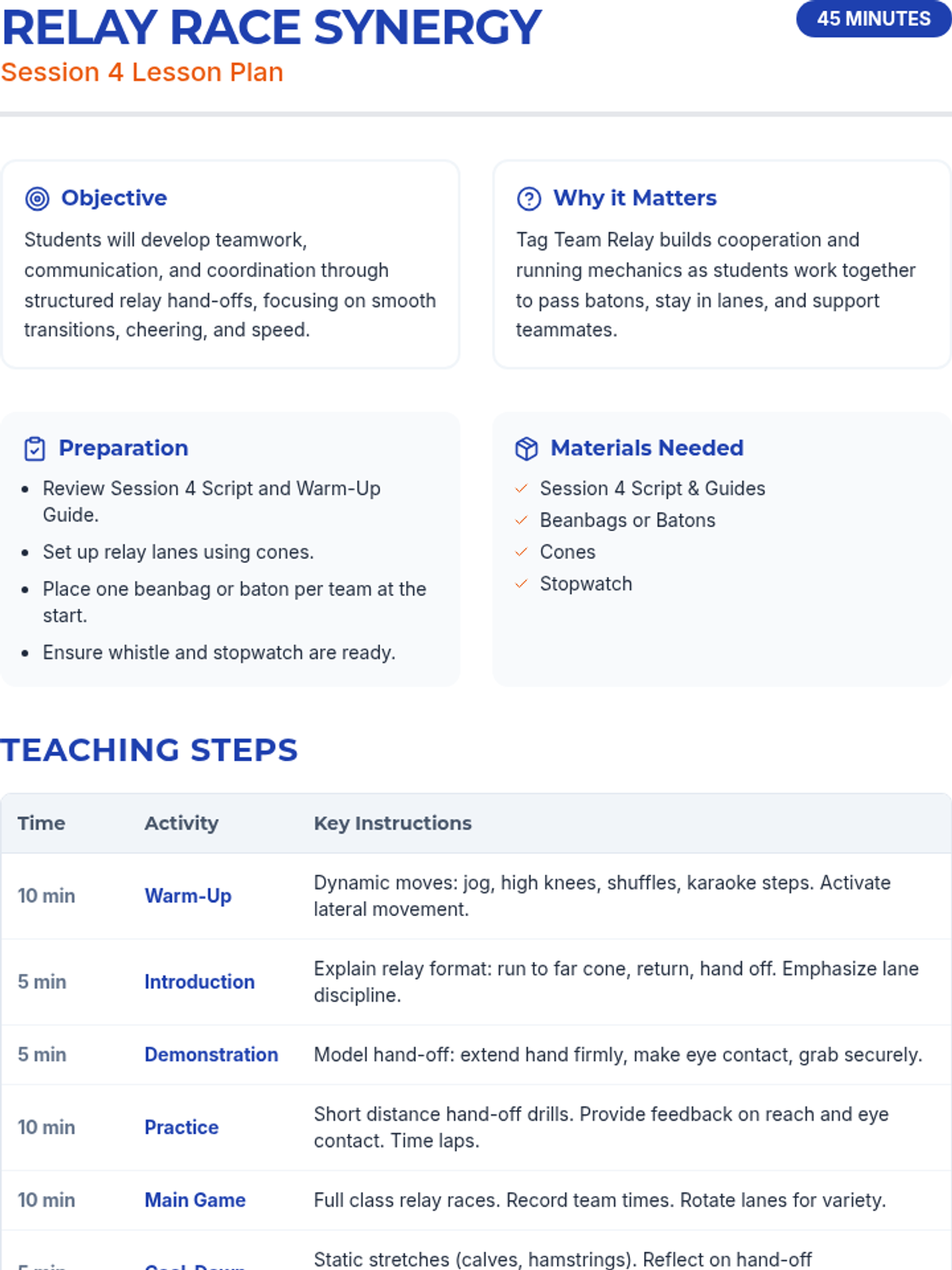 An 8-session middle school PE series focusing on teamwork, agility, and sportsmanship through structured Playworks games. Each session includes complete lesson plans, scripts, and guides to ensure a fun and active learning environment.