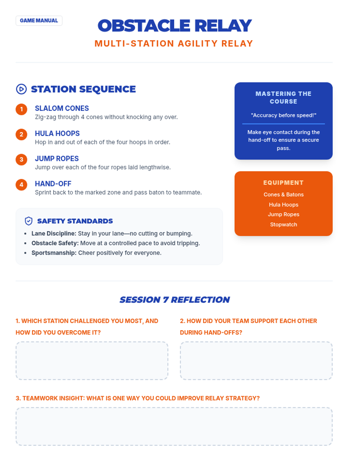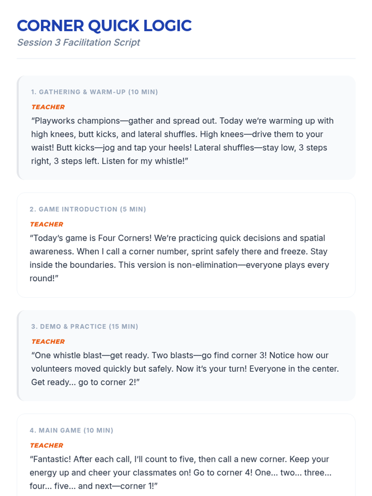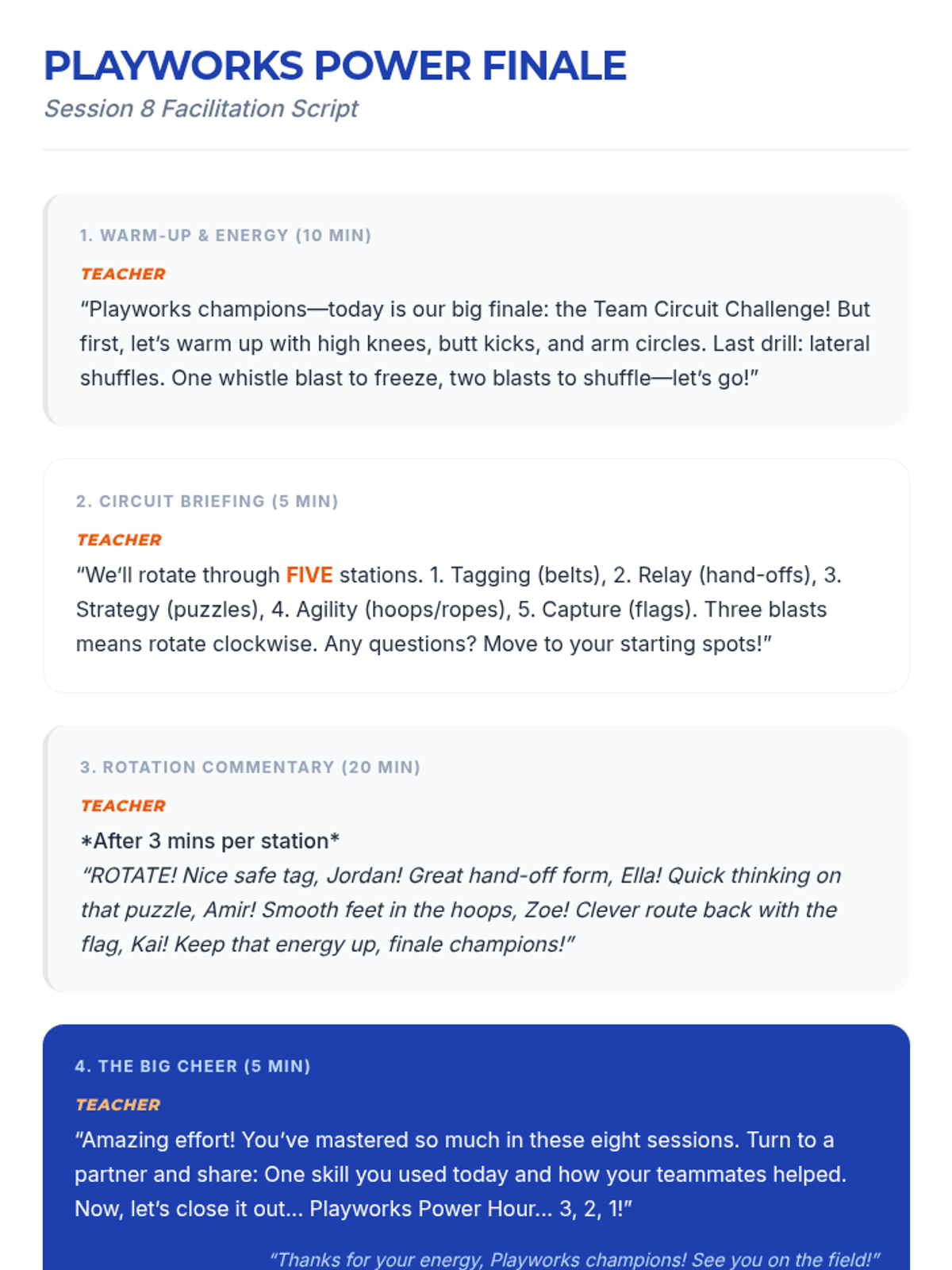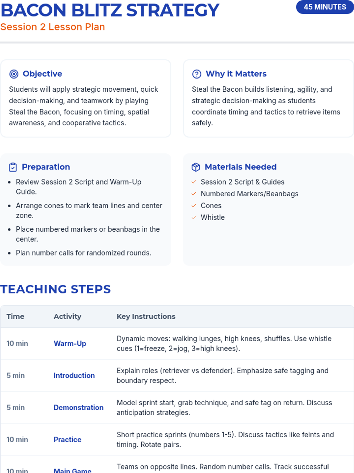 An 8-session middle school PE series focusing on teamwork, agility, and sportsmanship through structured Playworks games. Each session includes complete lesson plans, scripts, and guides to ensure a fun and active learning environment.