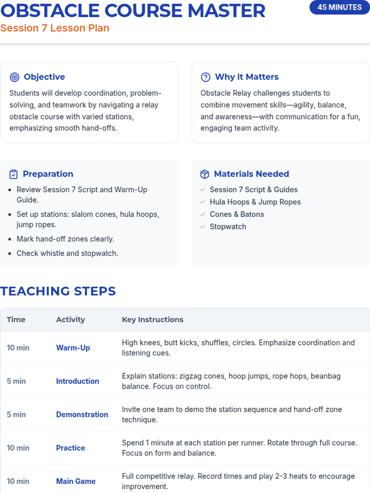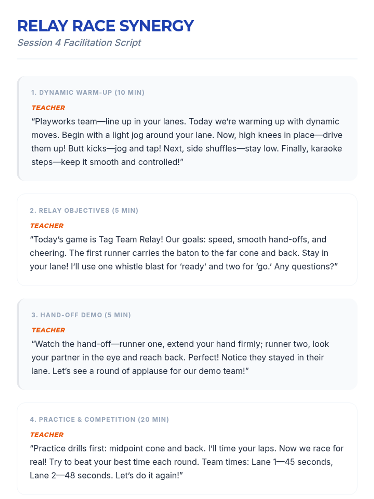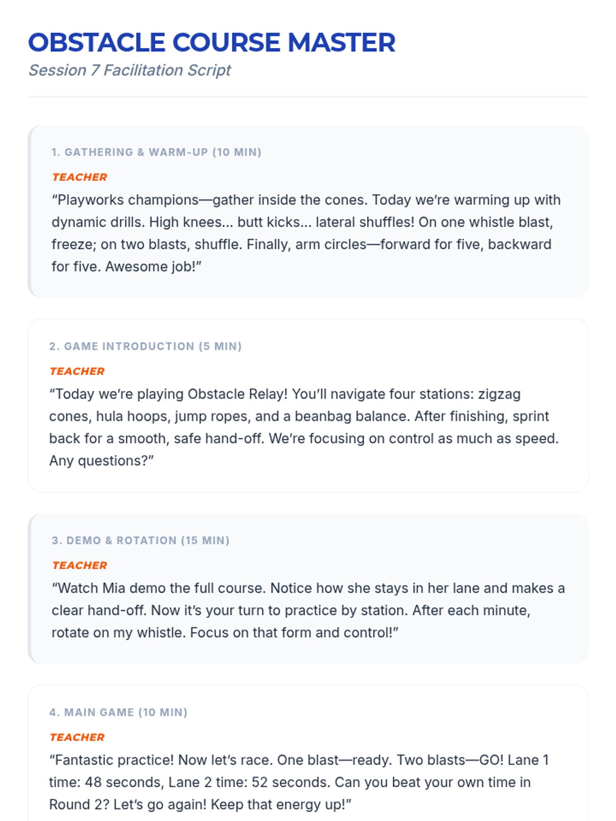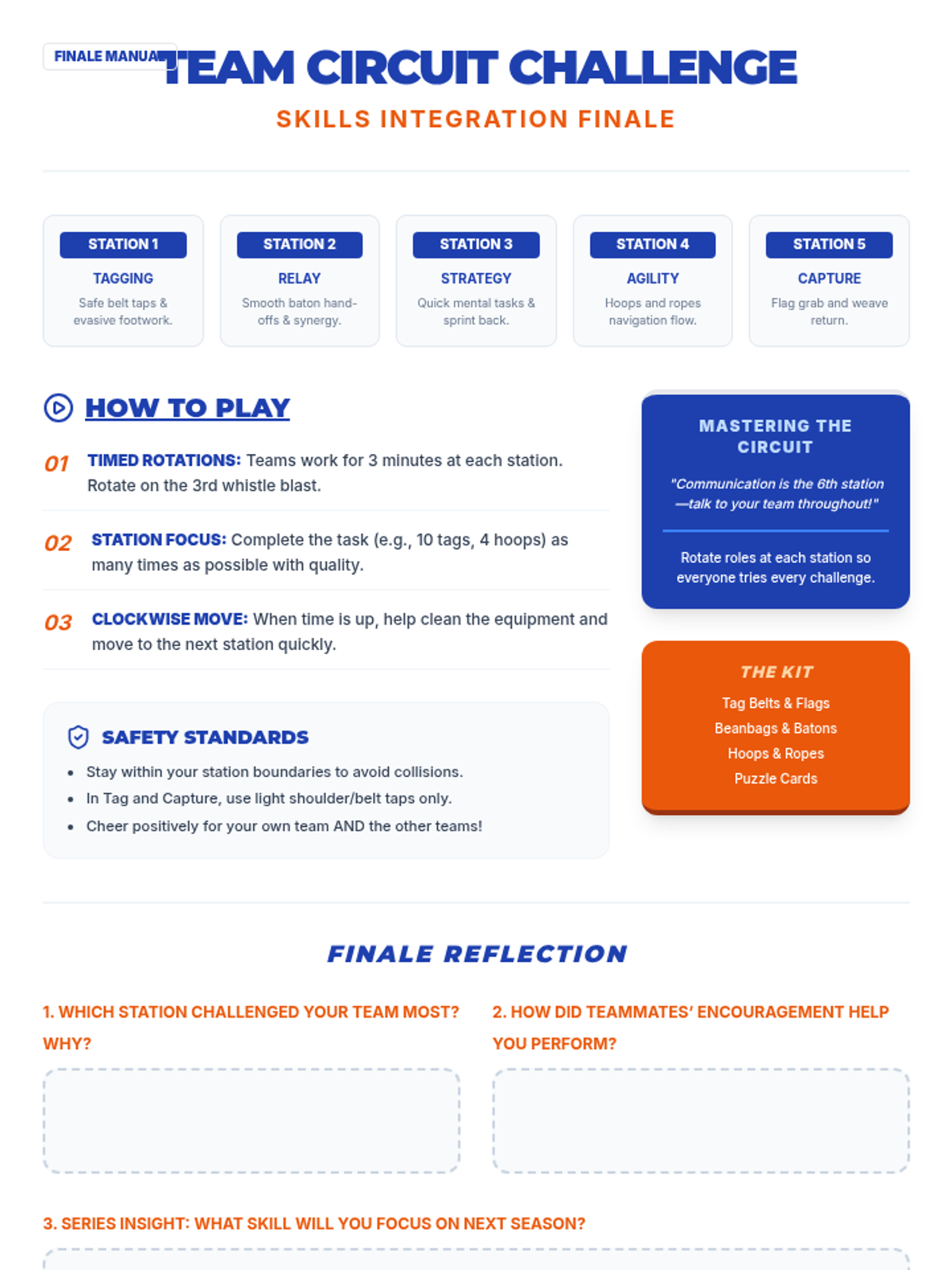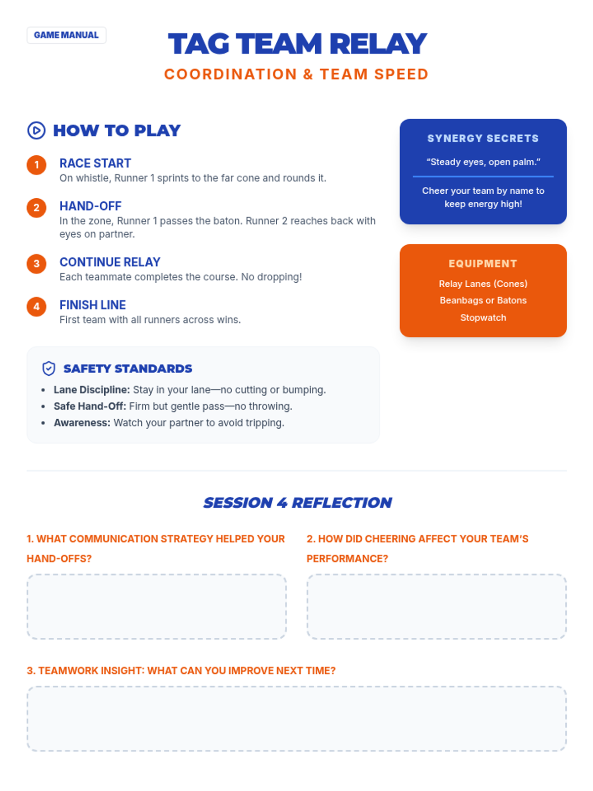 An 8-session middle school PE series focusing on teamwork, agility, and sportsmanship through structured Playworks games. Each session includes complete lesson plans, scripts, and guides to ensure a fun and active learning environment.