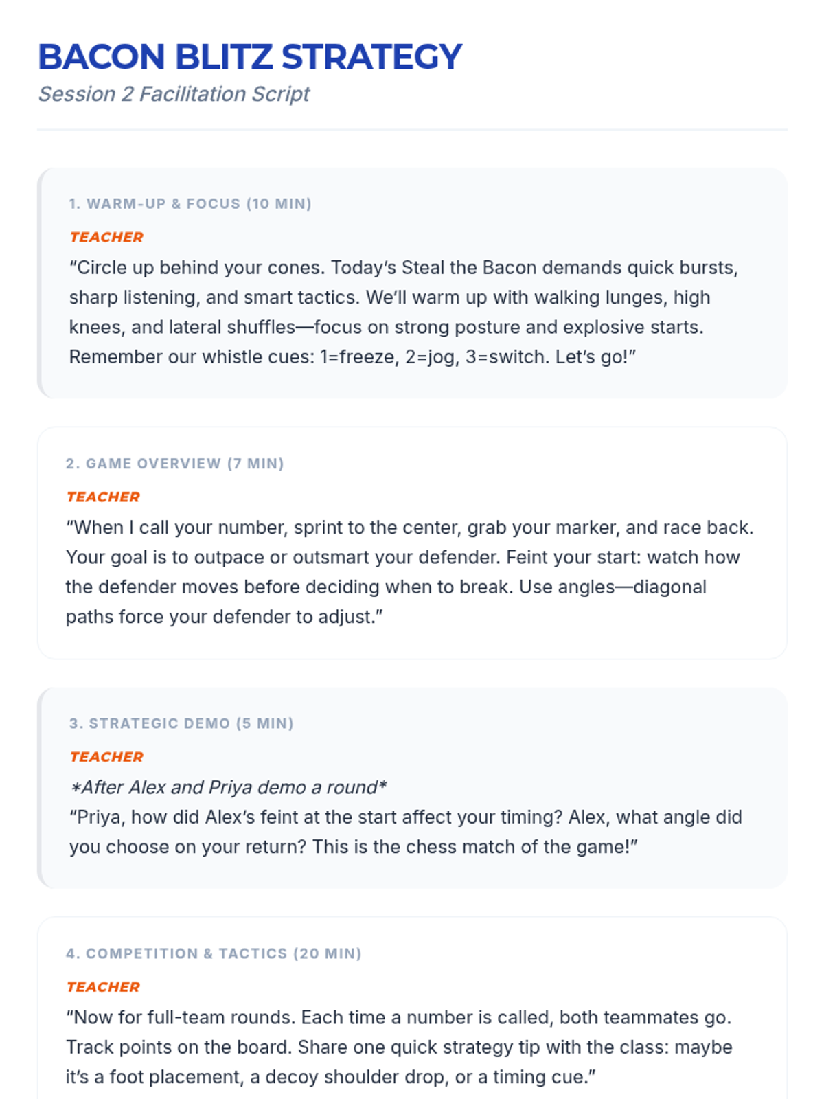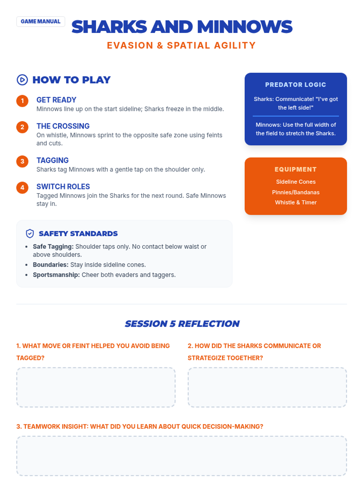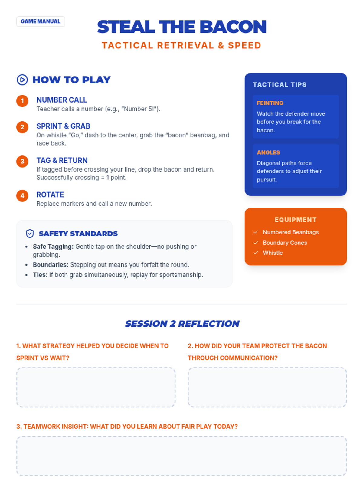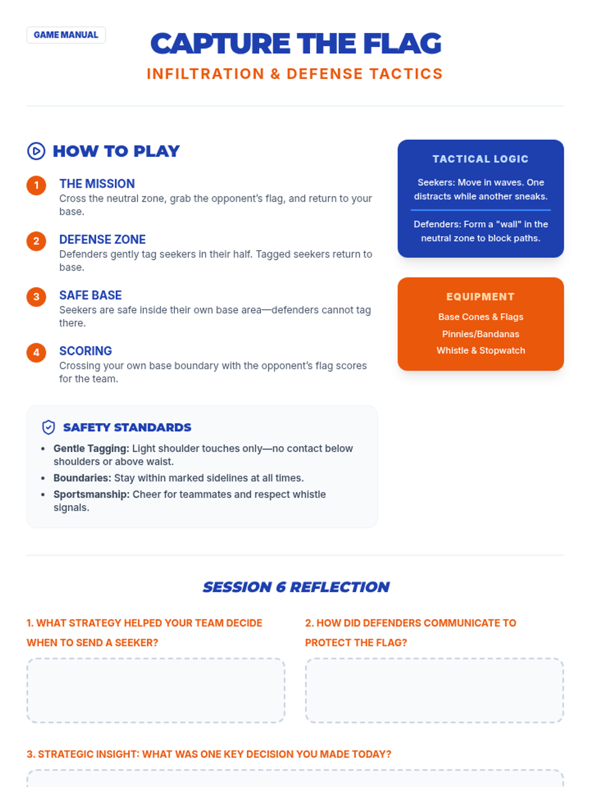 An 8-session middle school PE series focusing on teamwork, agility, and sportsmanship through structured Playworks games. Each session includes complete lesson plans, scripts, and guides to ensure a fun and active learning environment.