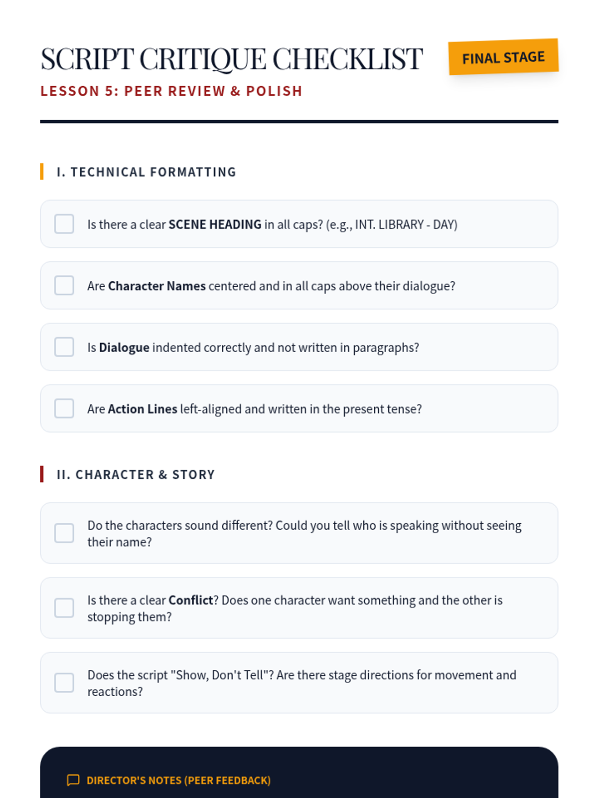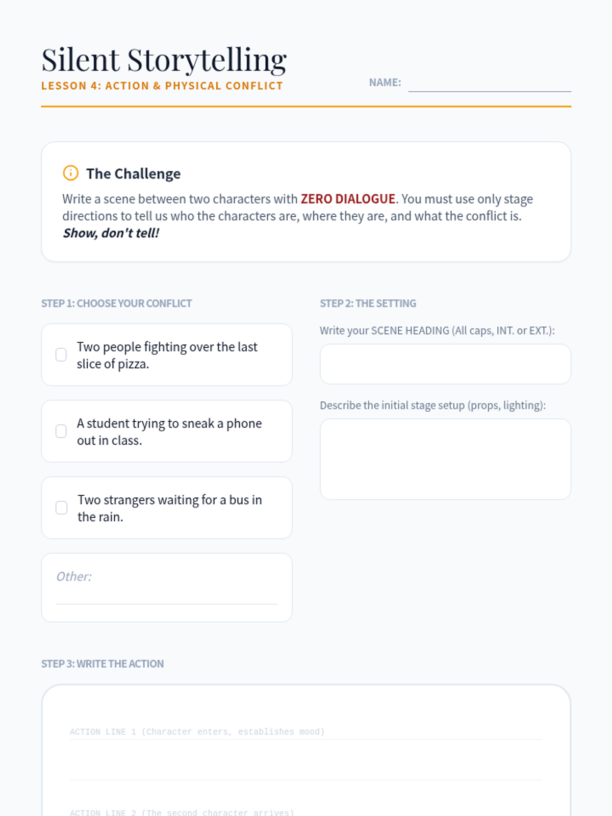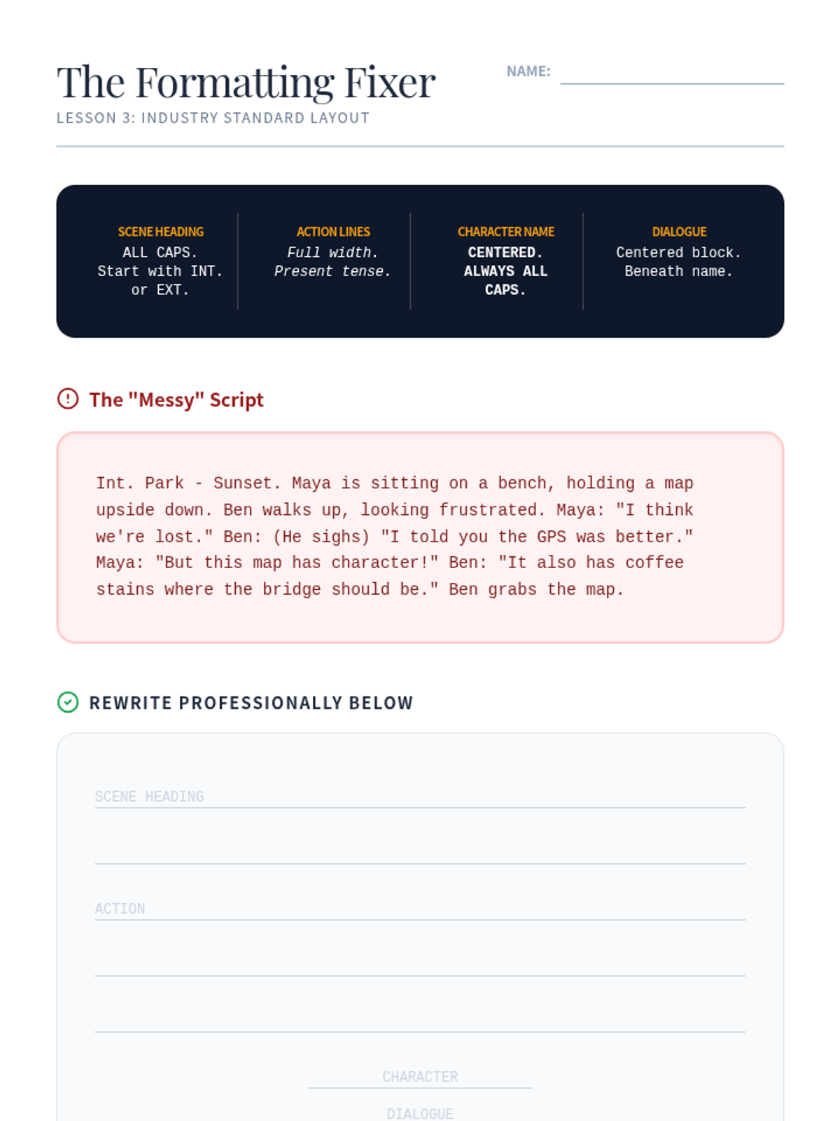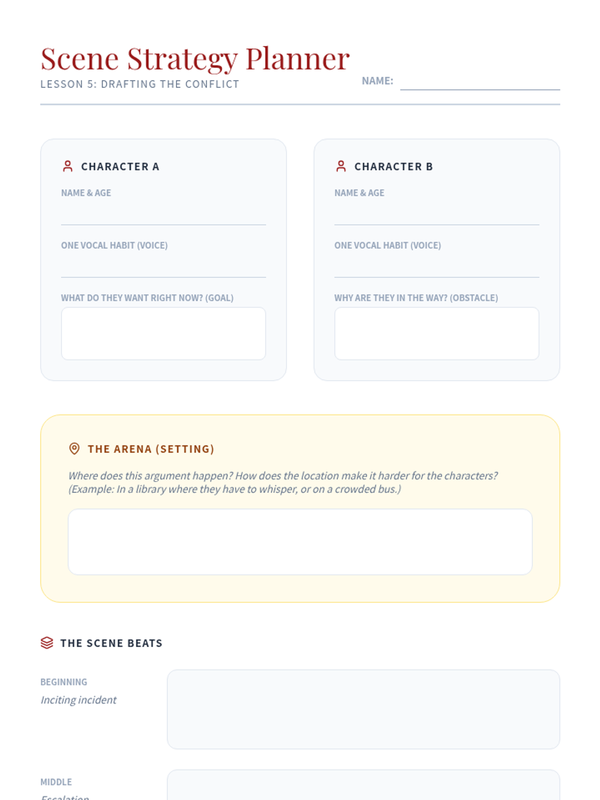 A foundational unit for 6th-grade students introducing the mechanics and creativity of playwriting. Students explore the differences between prose and drama, master character voice, learn standard script formatting, and craft original conflict-driven scenes.