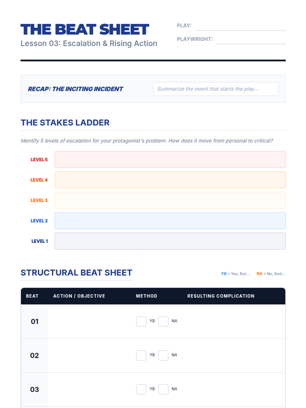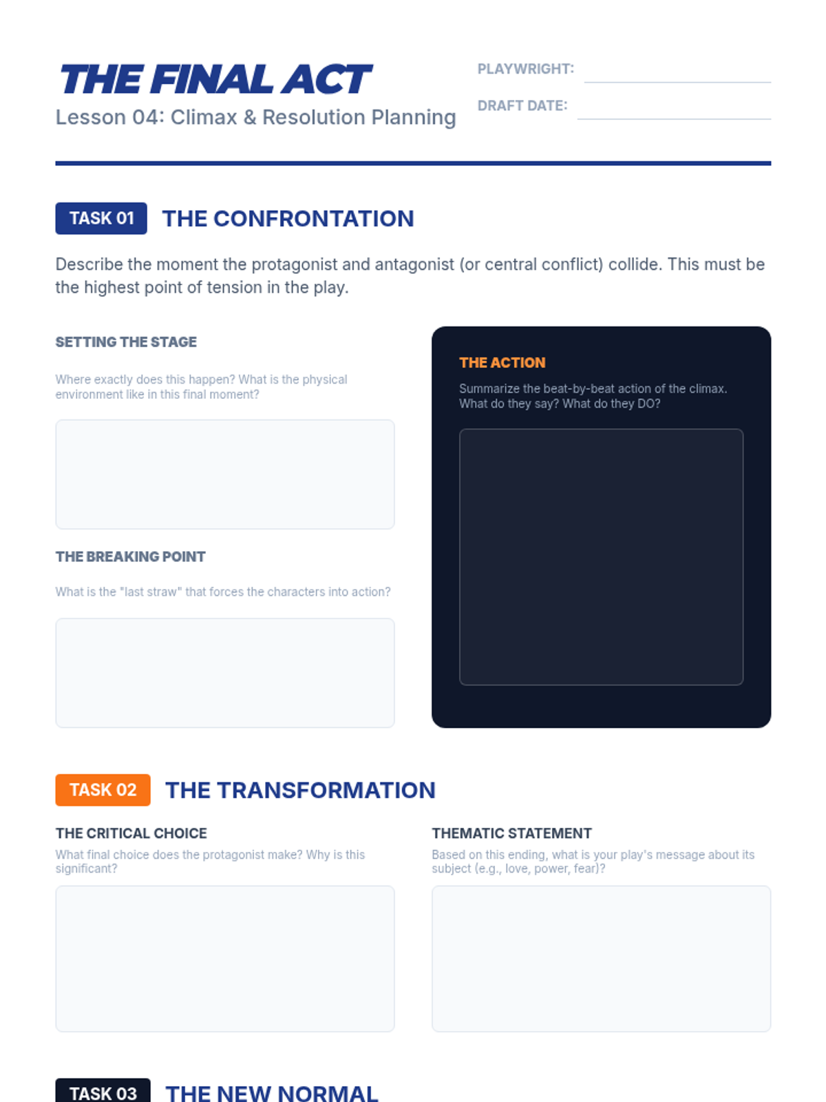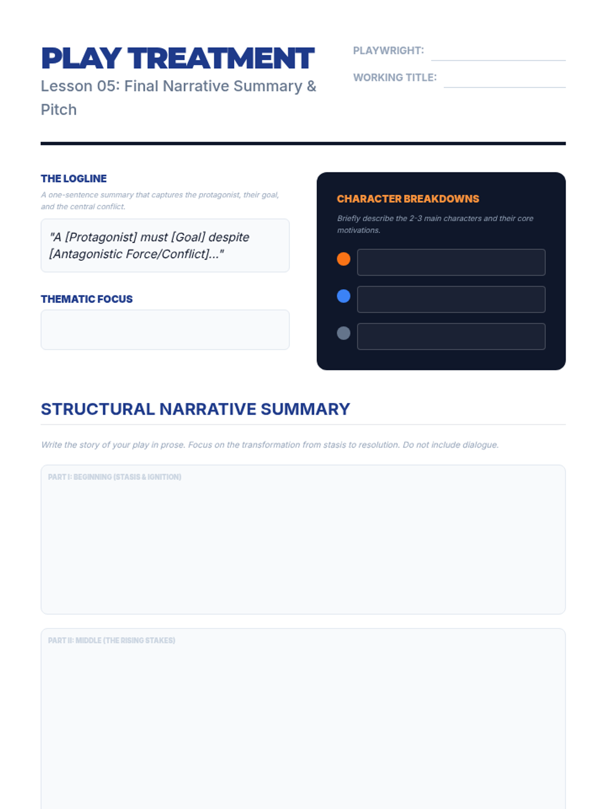 A project-based sequence for 11th-grade students focusing on the macro-level engineering of a one-act play. Students transition from deconstructing dramatic structures to drafting a complete narrative treatment, emphasizing conflict, stakes, and structural integrity.