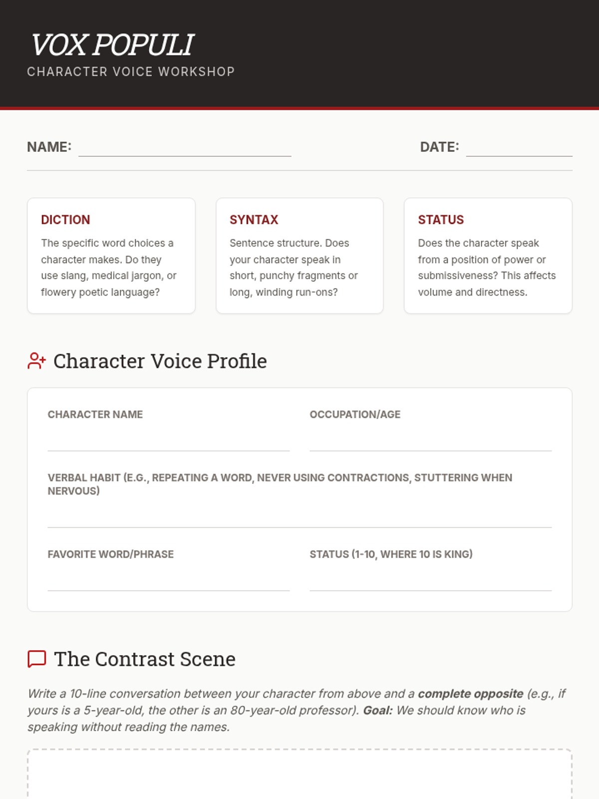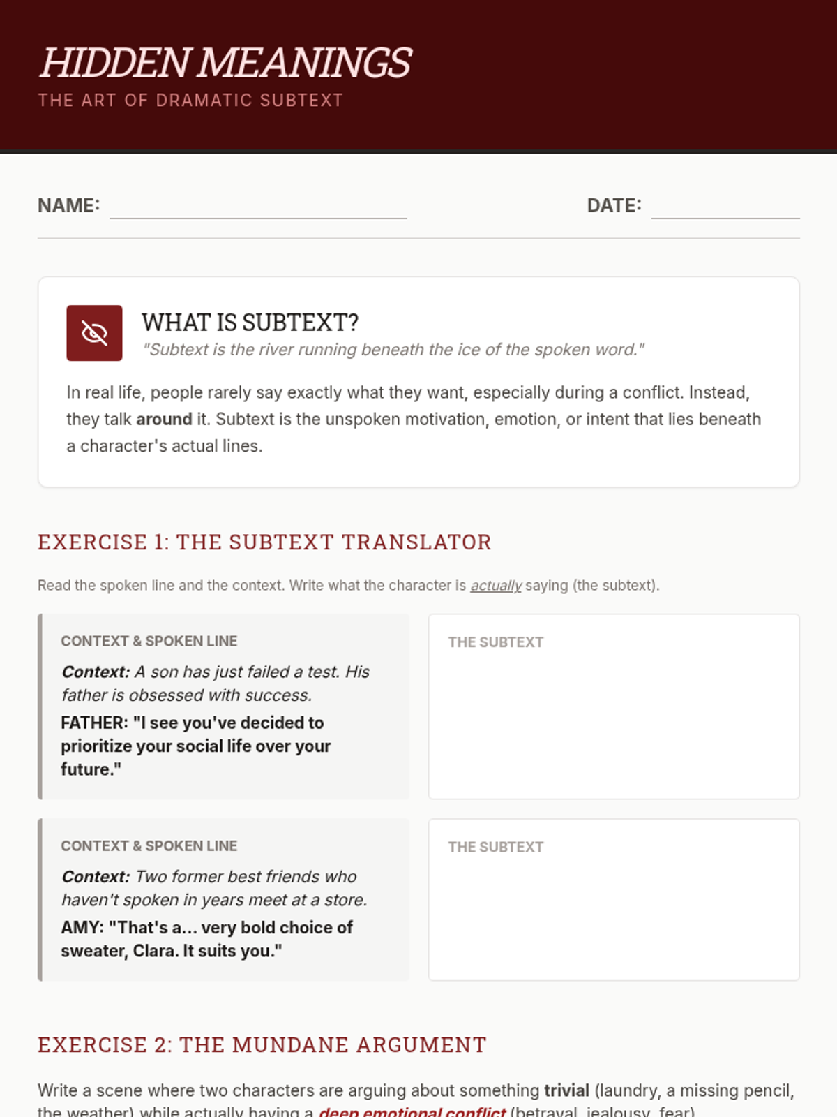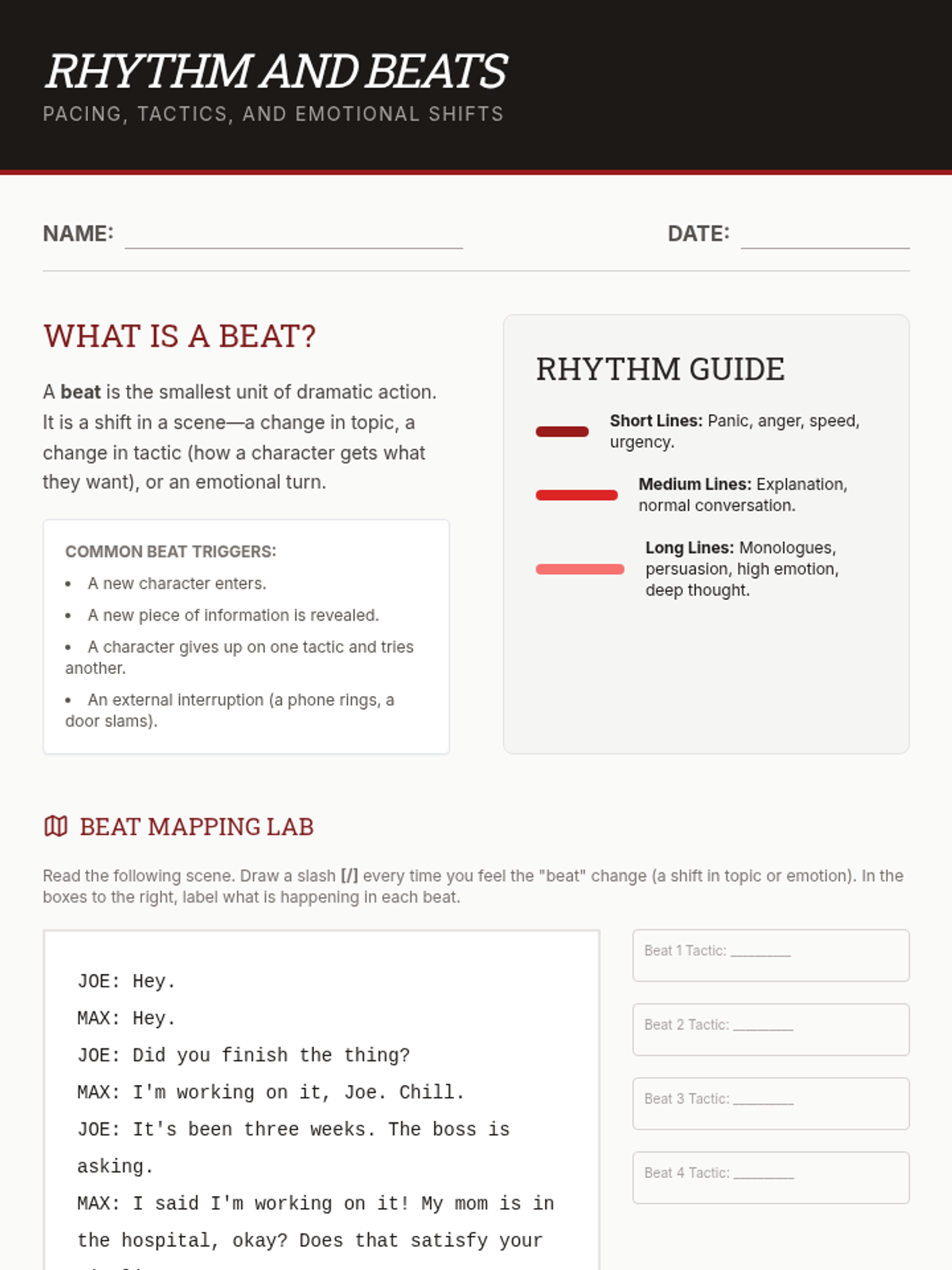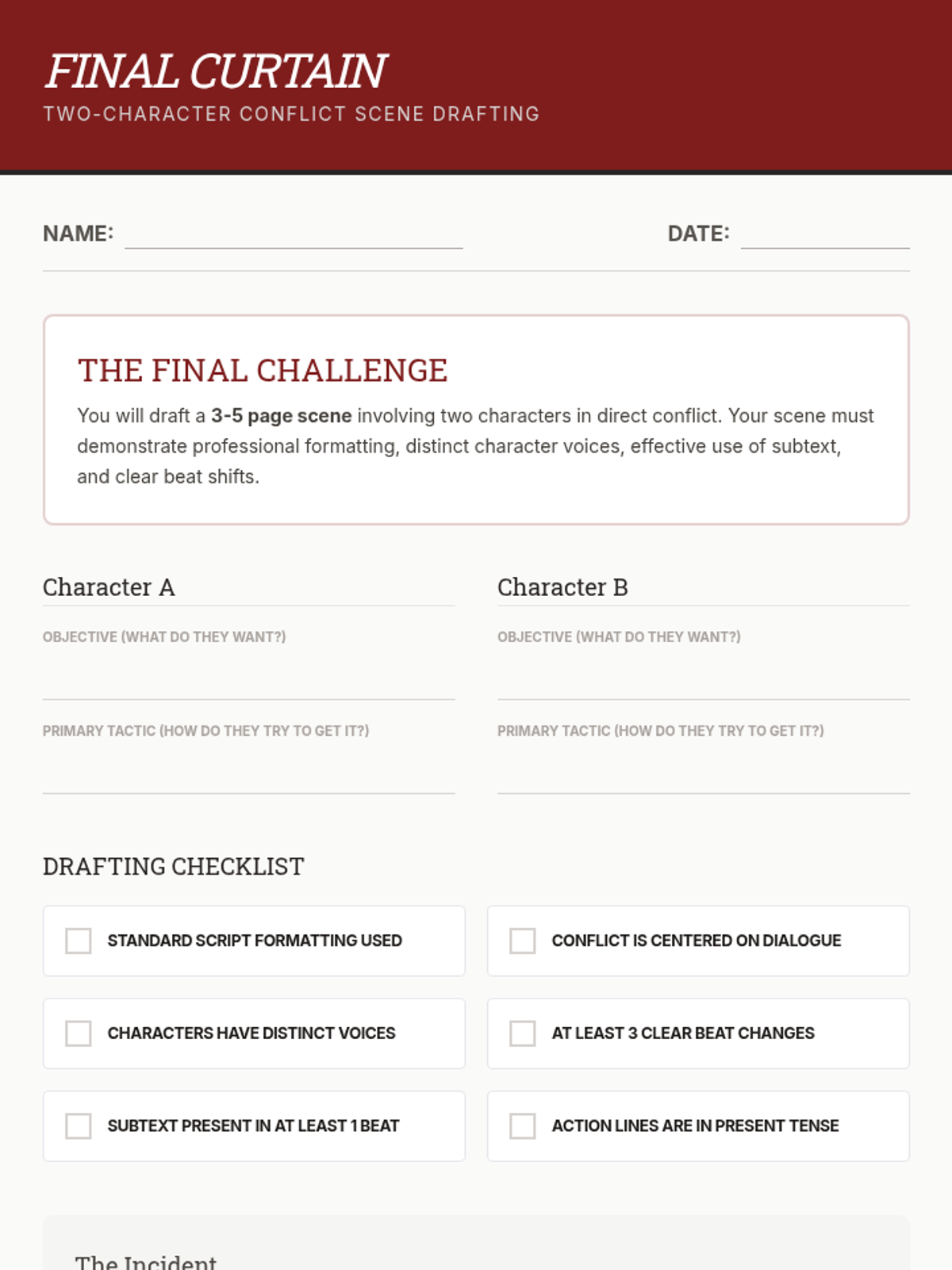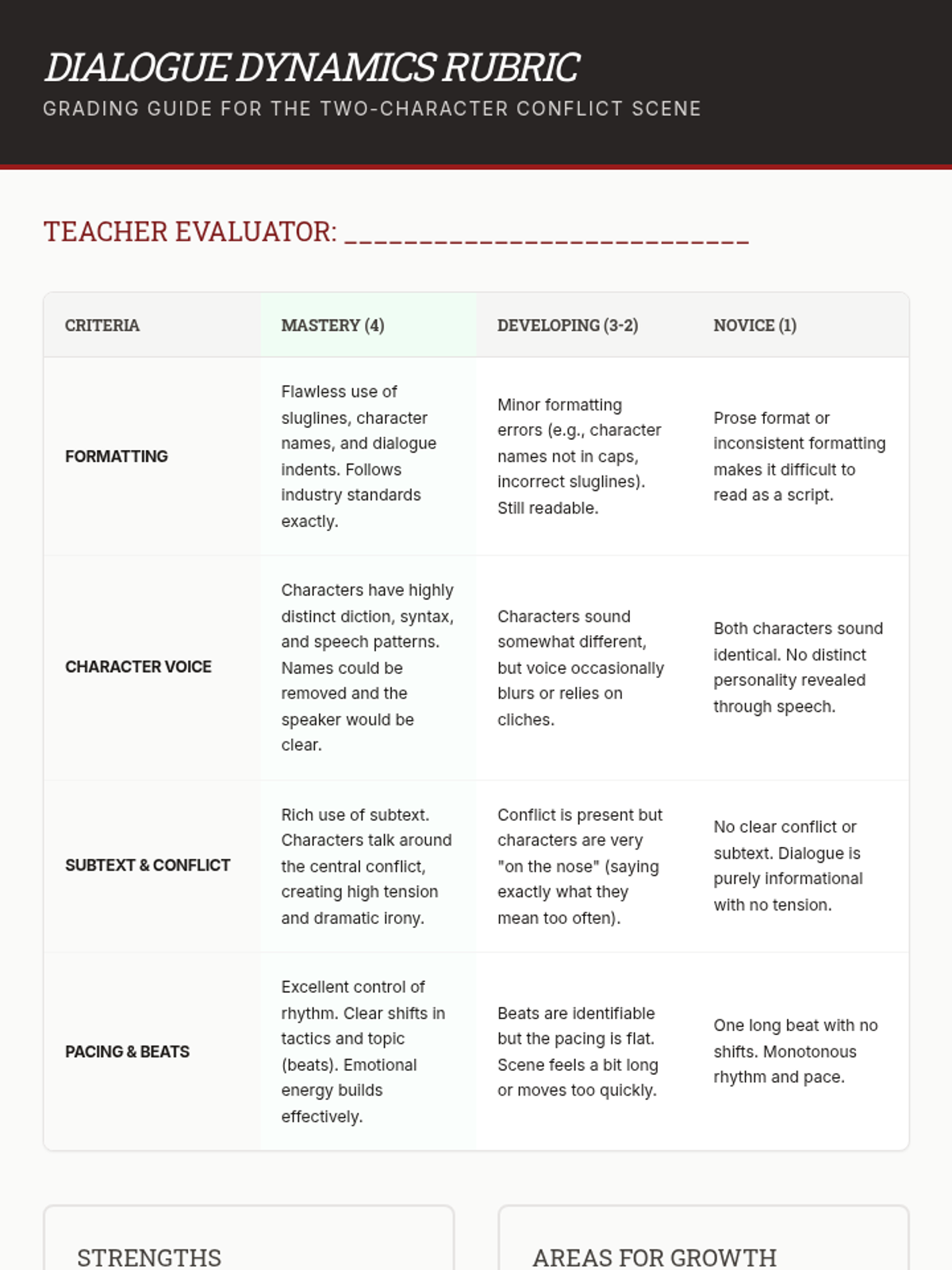 This sequence guides 9th-grade students through the technical and creative aspects of playwriting, from professional script formatting to mastering character voice, subtext, and pacing. Students will conclude the unit by drafting a polished two-character conflict scene.