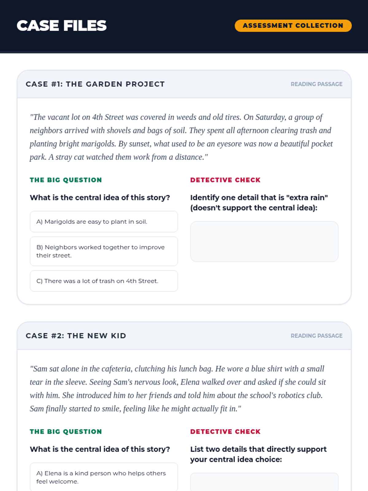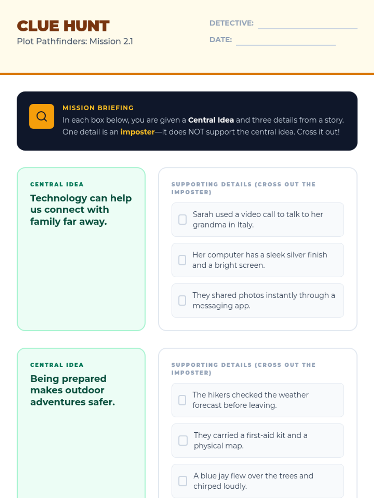 A three-lesson unit focused on identifying central ideas in short stories by distinguishing them from supporting details. Students will use the 'Plot Pathfinders' adventure theme to navigate narratives and uncover the core messages of texts.
