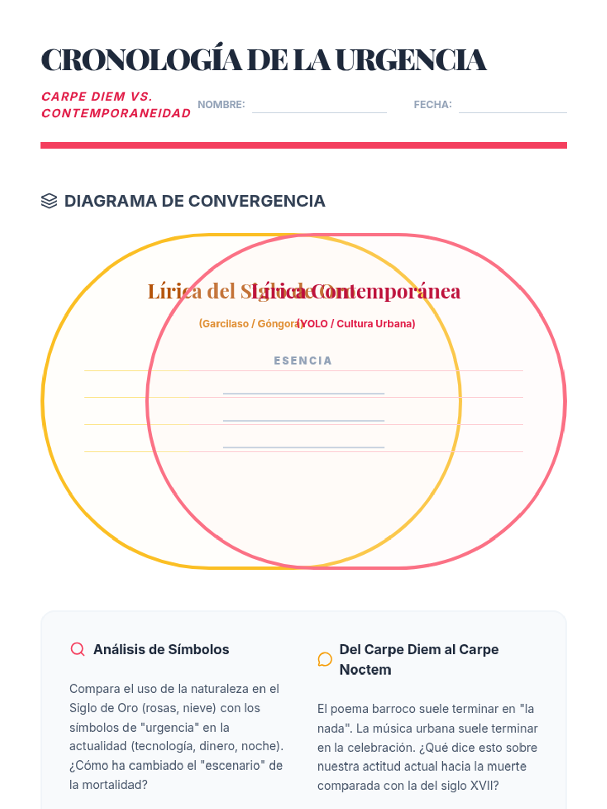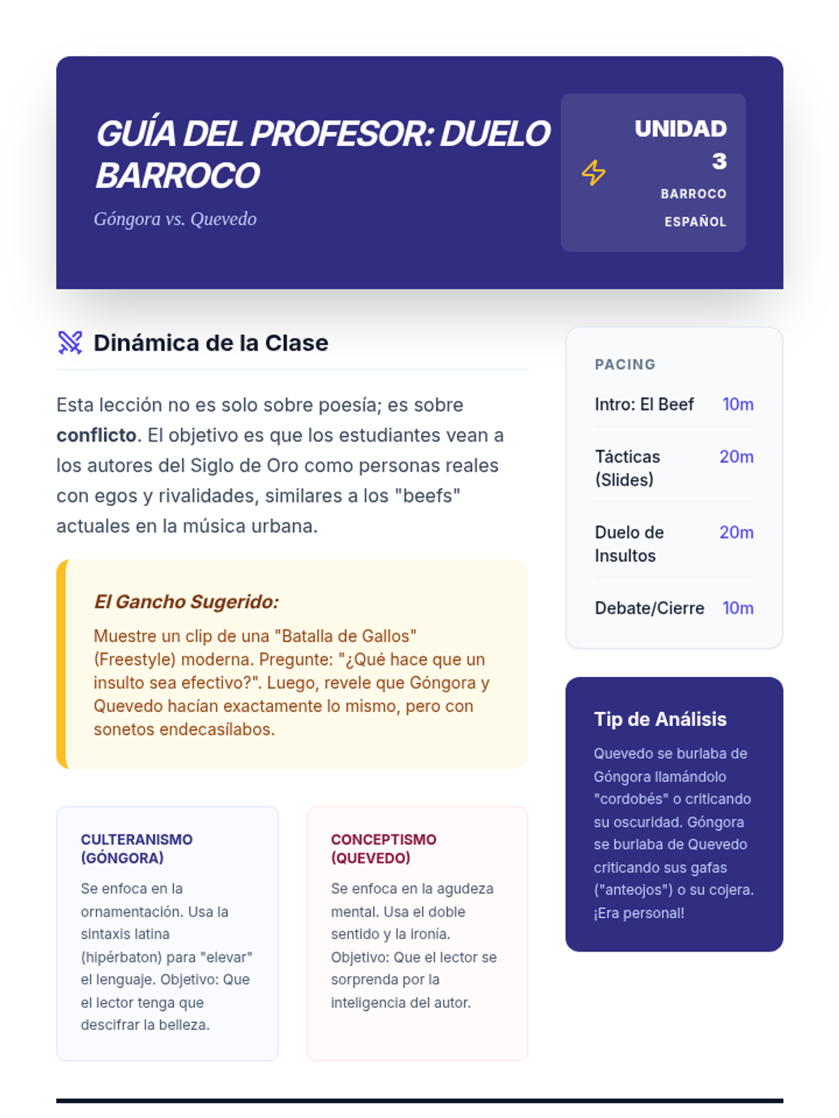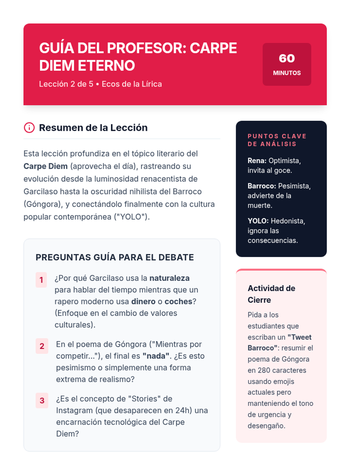 This advanced Spanish reading sequence explores the evolution of poetic voice from the Spanish Golden Age to the modern era, focusing on the sonnet structure, Baroque rivalries, and the shift from 'Carpe Diem' to modern expressions of time.
