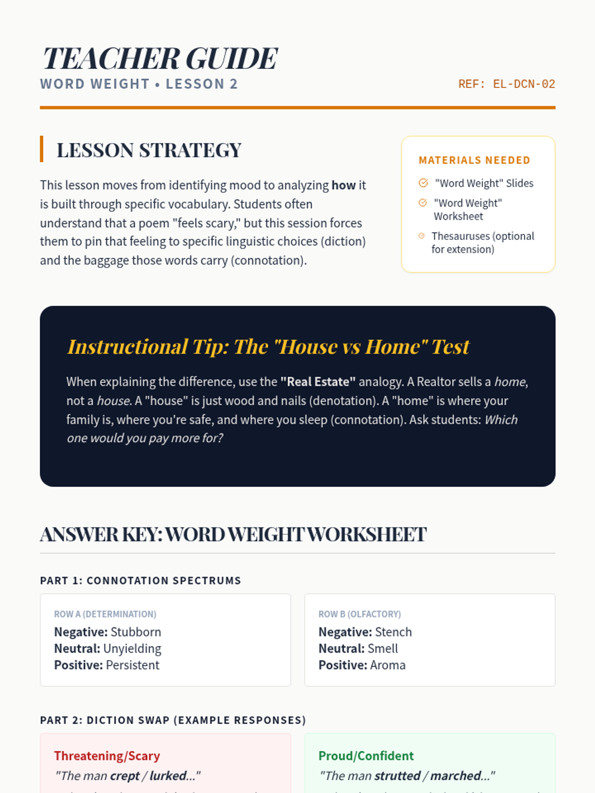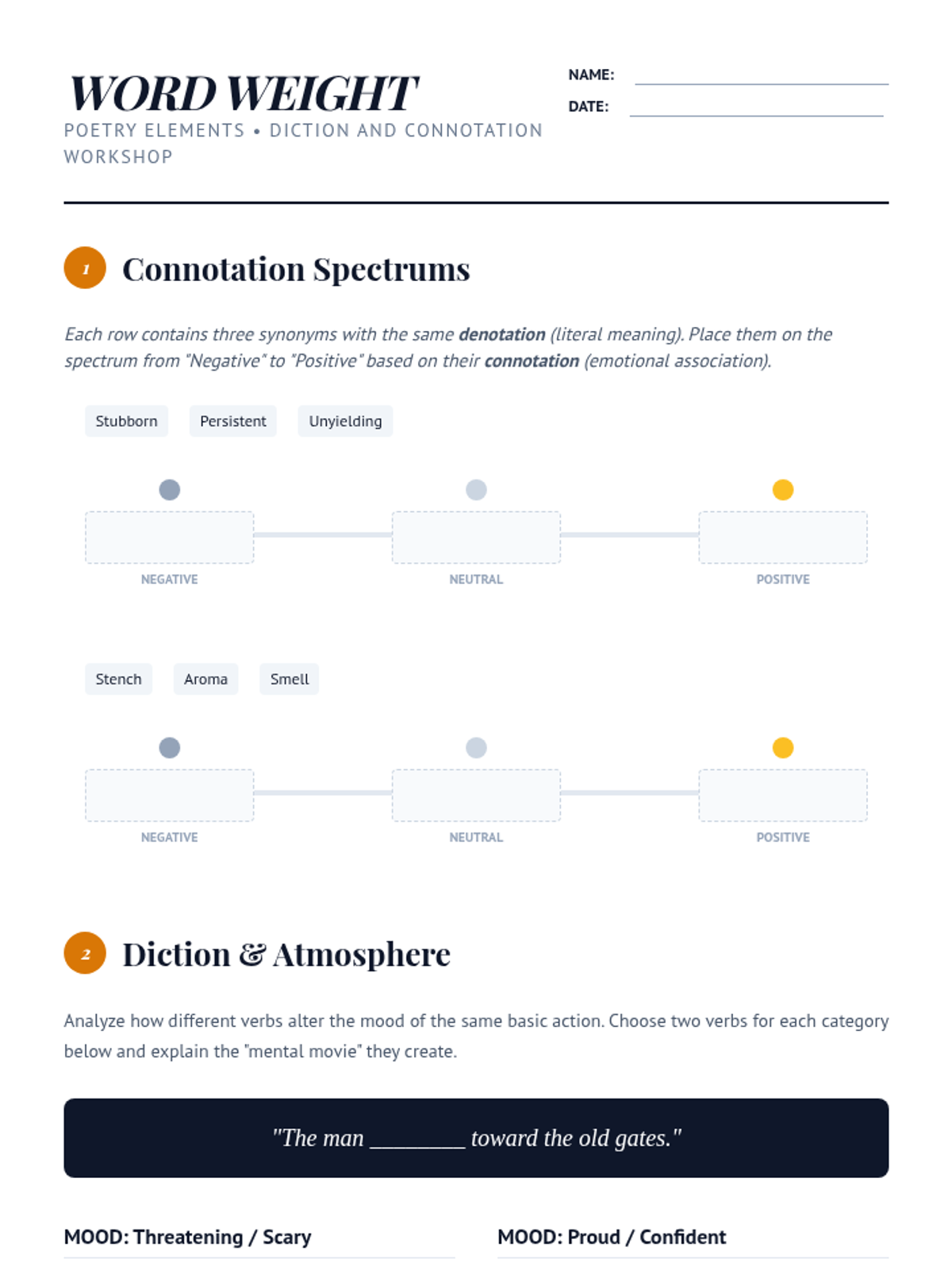 This sequence explores how poetic elements like diction, imagery, and sound devices work together to create tone and mood. Students move from technical identification to emotional interpretation through a case study of Edgar Allan Poe and comparative analysis.