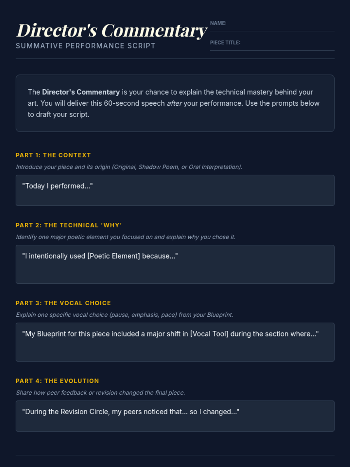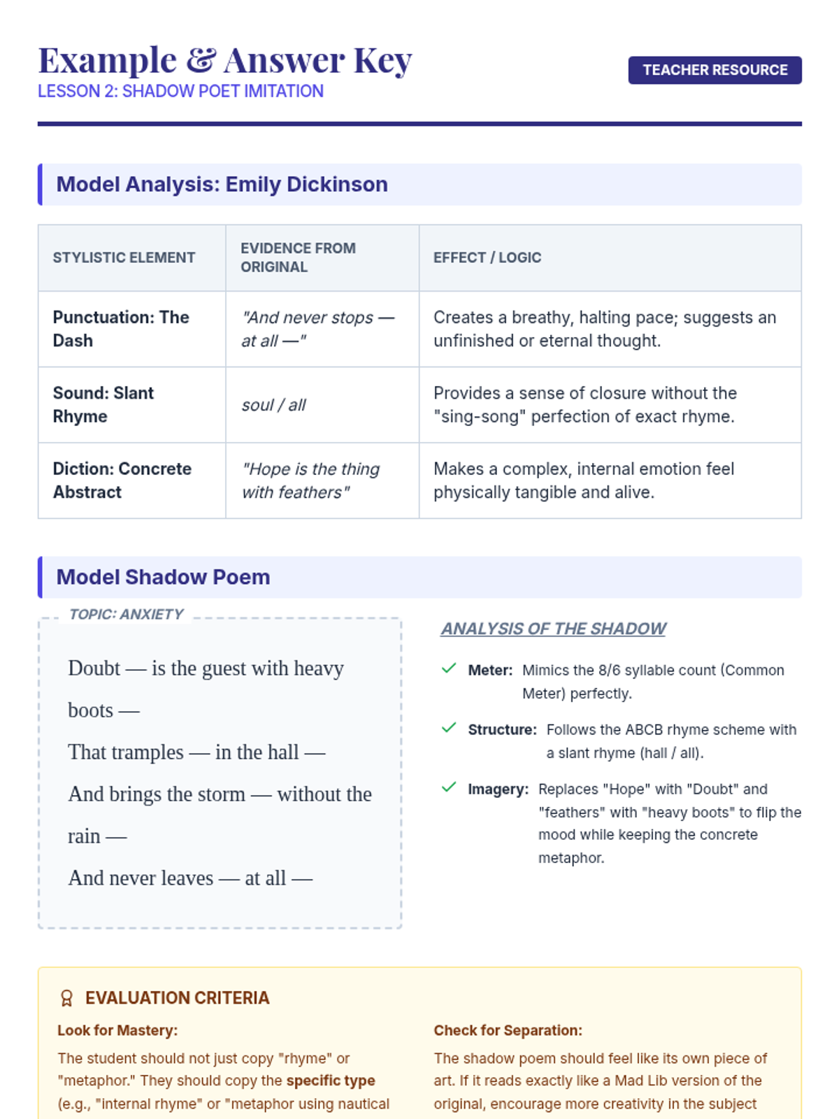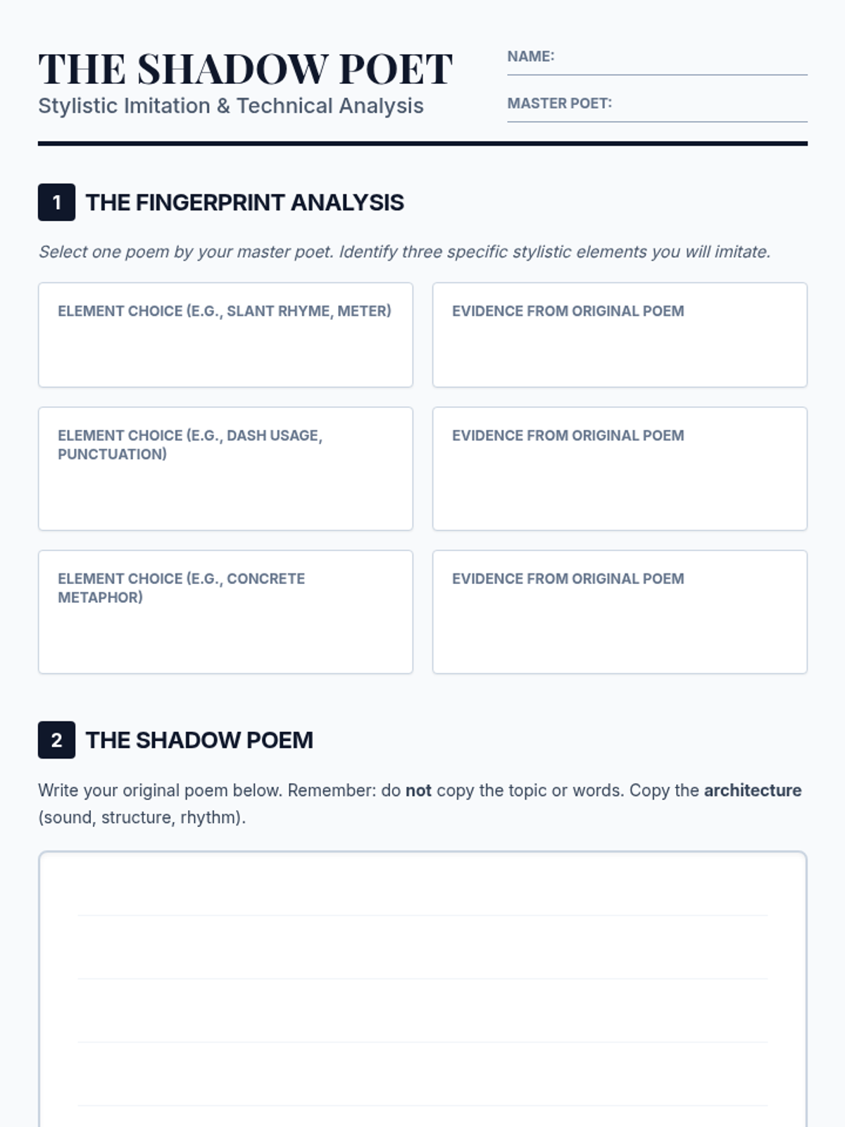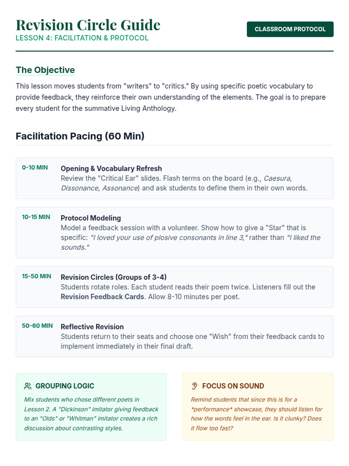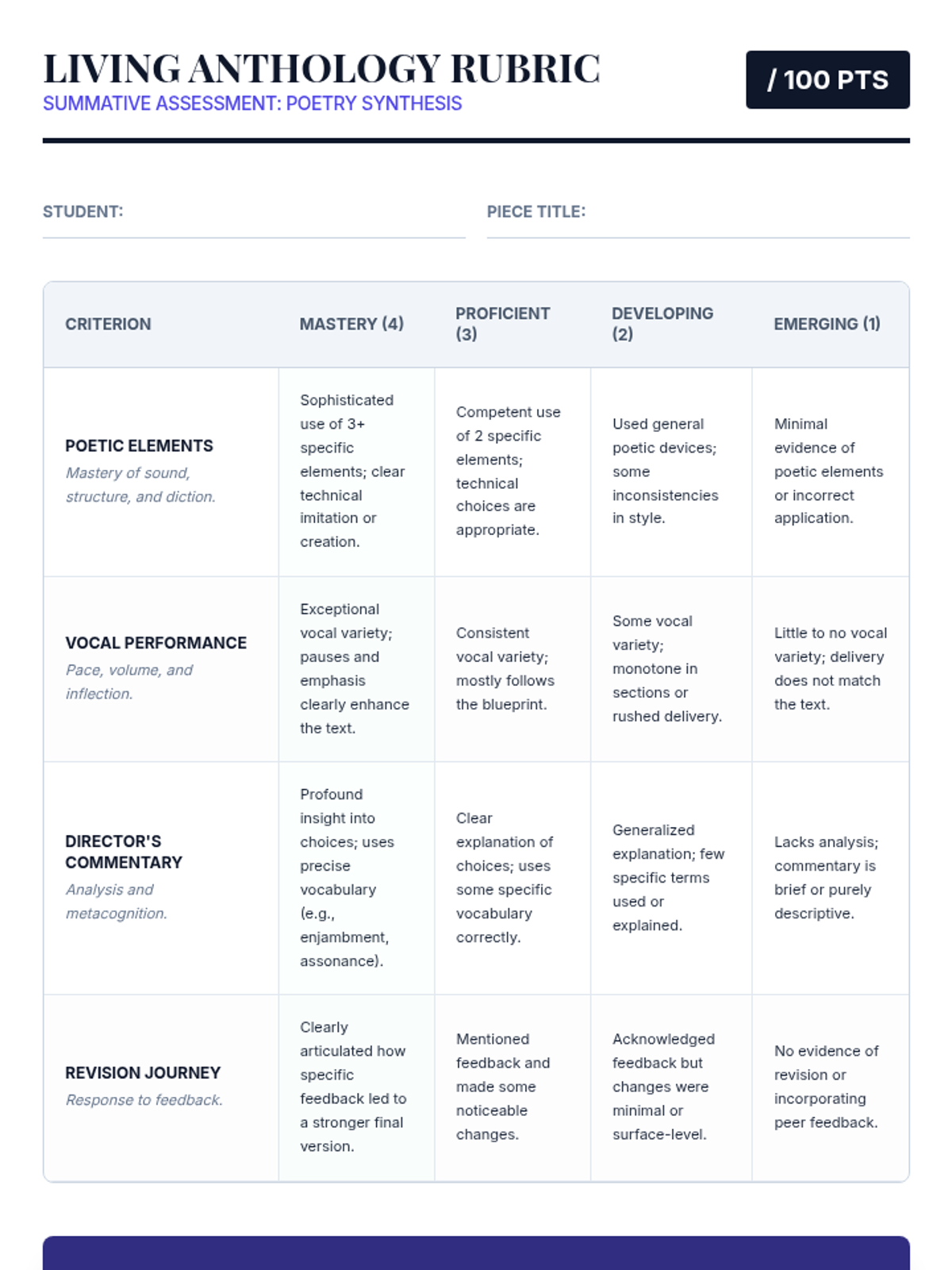A project-based sequence for 10th Grade ELA where students analyze, imitate, and perform poetry to demonstrate mastery of poetic elements like sound, structure, and figurative language. The unit culminates in a 'Living Anthology' showcase.