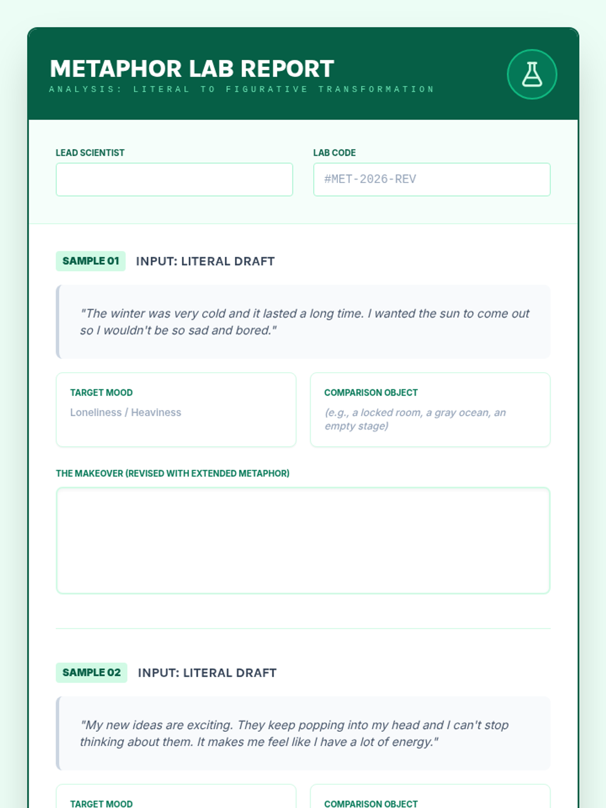 A comprehensive unit on figurative language, taking students from basic comparisons like similes and metaphors to complex devices like oxymorons and symbolism. Students act as 'Language Scientists' in a literary lab to synthesize and analyze text.