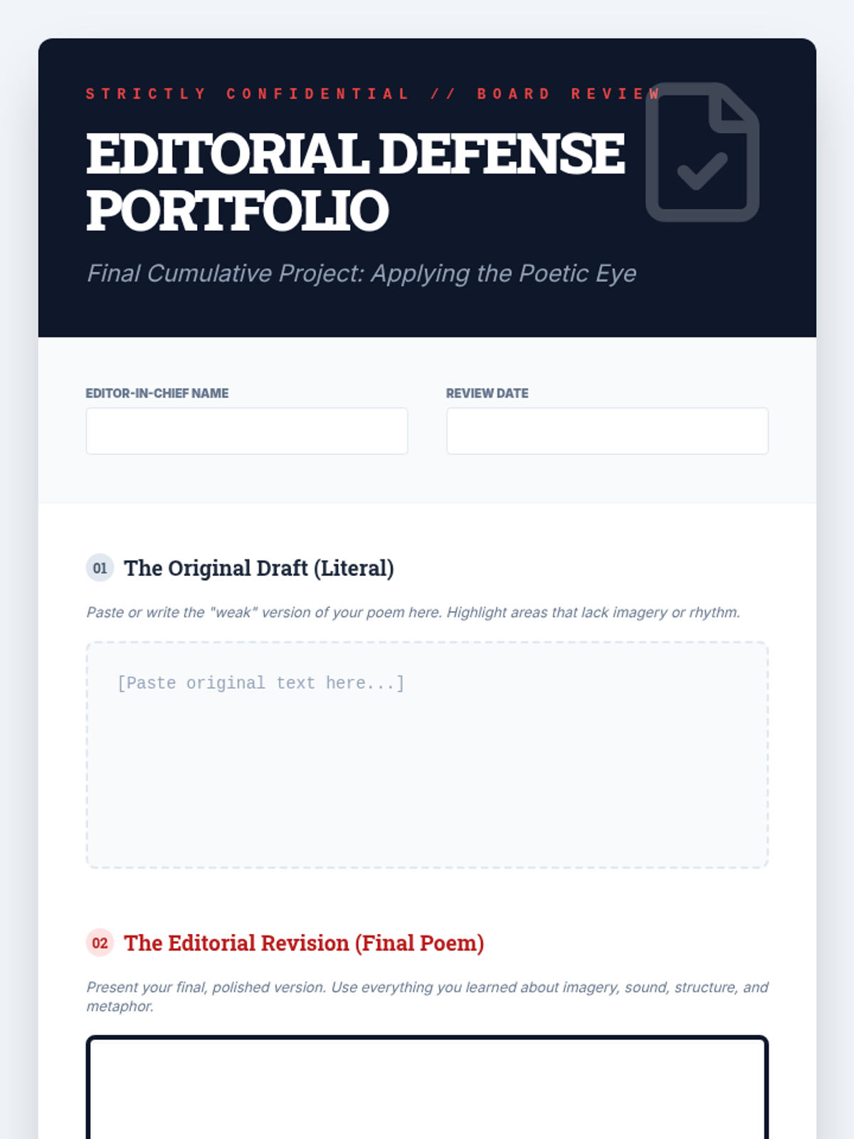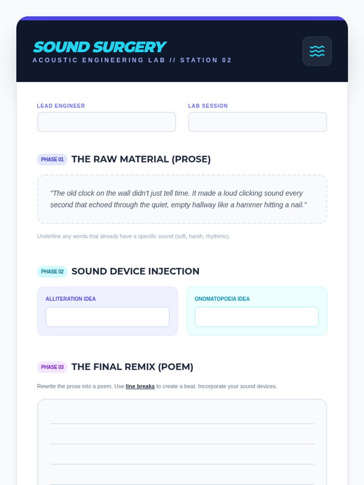 A simulation-based sequence where 8th-grade students act as poetry editors. Students master poetic elements like imagery, sound, structure, and figurative language by revising 'weak' drafts into polished poems.