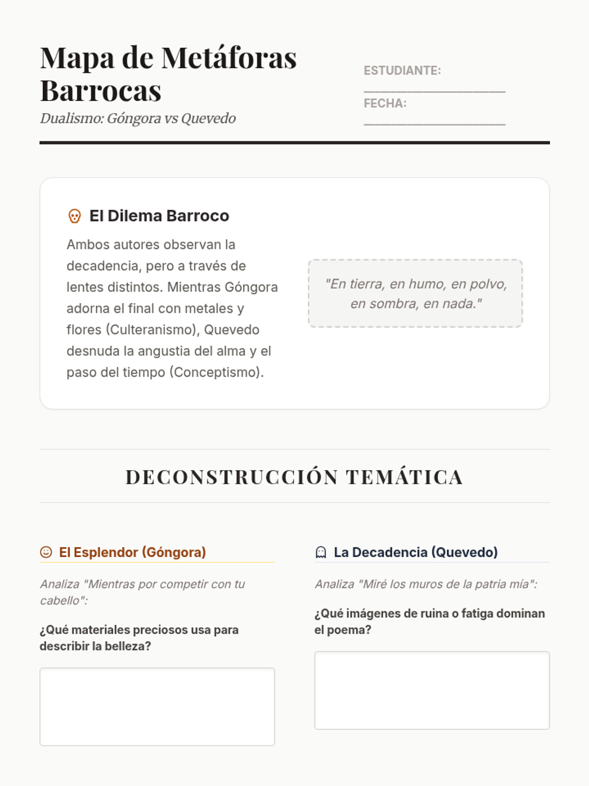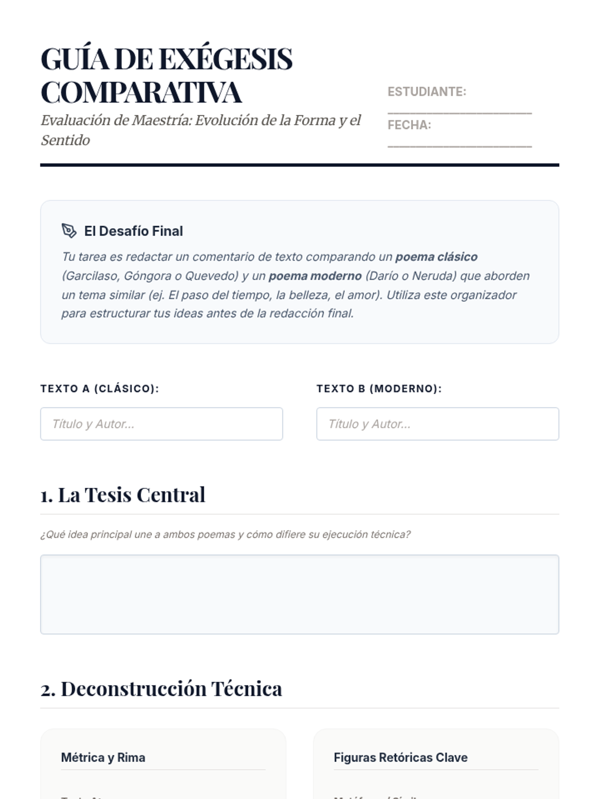 This sequence explores the evolution of Spanish poetry from the Golden Age to Modernism, focusing on the technical deconstruction of stylistic devices, meter, and metaphor. Students analyze works by Garcilaso, G\u00f3ngora, Quevedo, Dar\u00edo, and Neruda to understand how form and content reflect changing worldviews.