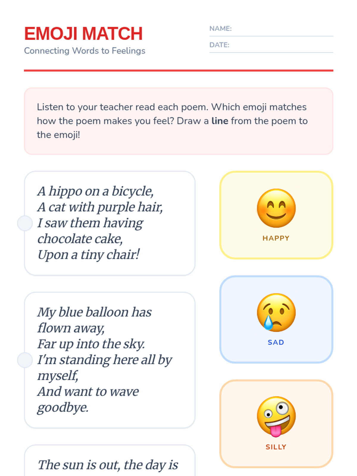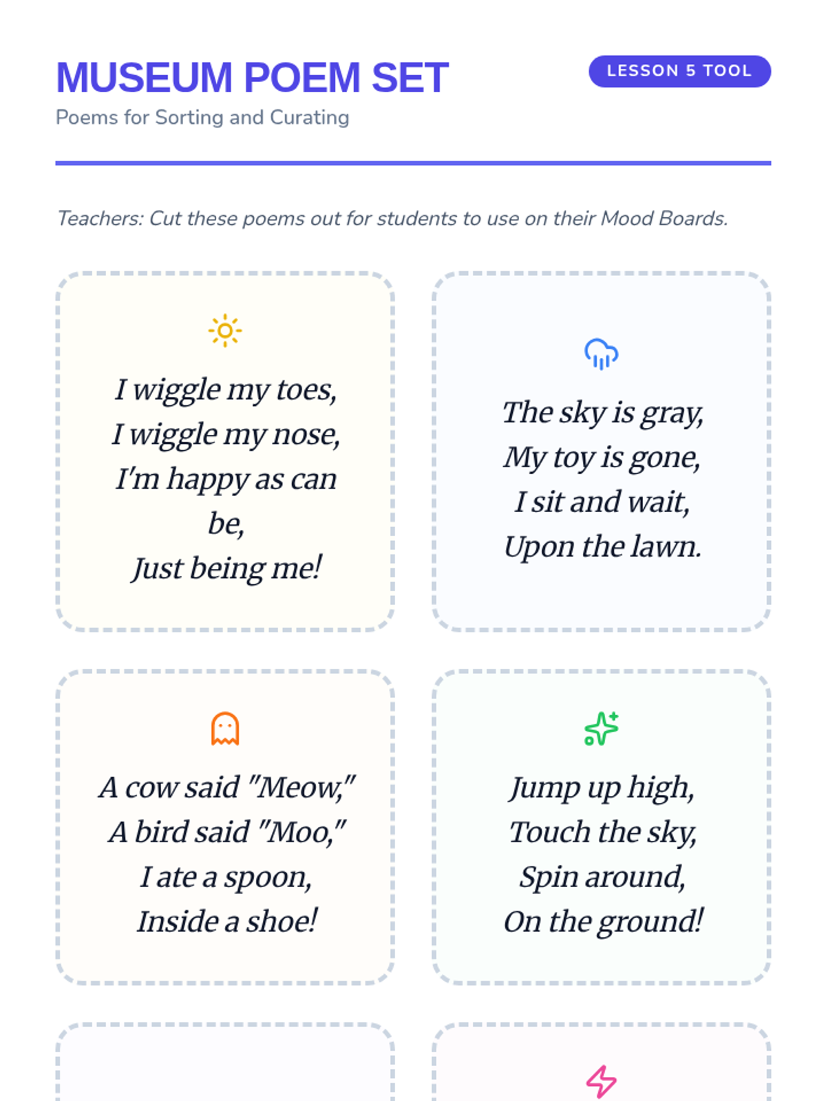 This Kindergarten ELA sequence introduces students to the unique structure of poetry and its ability to express emotions. Through visual comparison, structural analysis, and emotional connection, students learn to distinguish poems from prose and appreciate the 'heart' of a poem.
