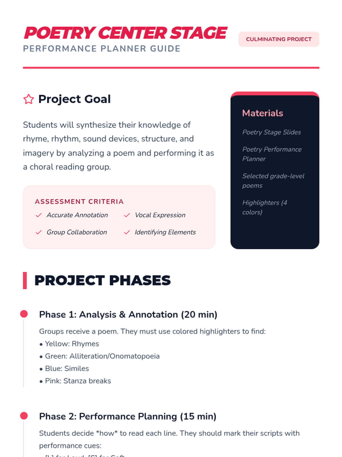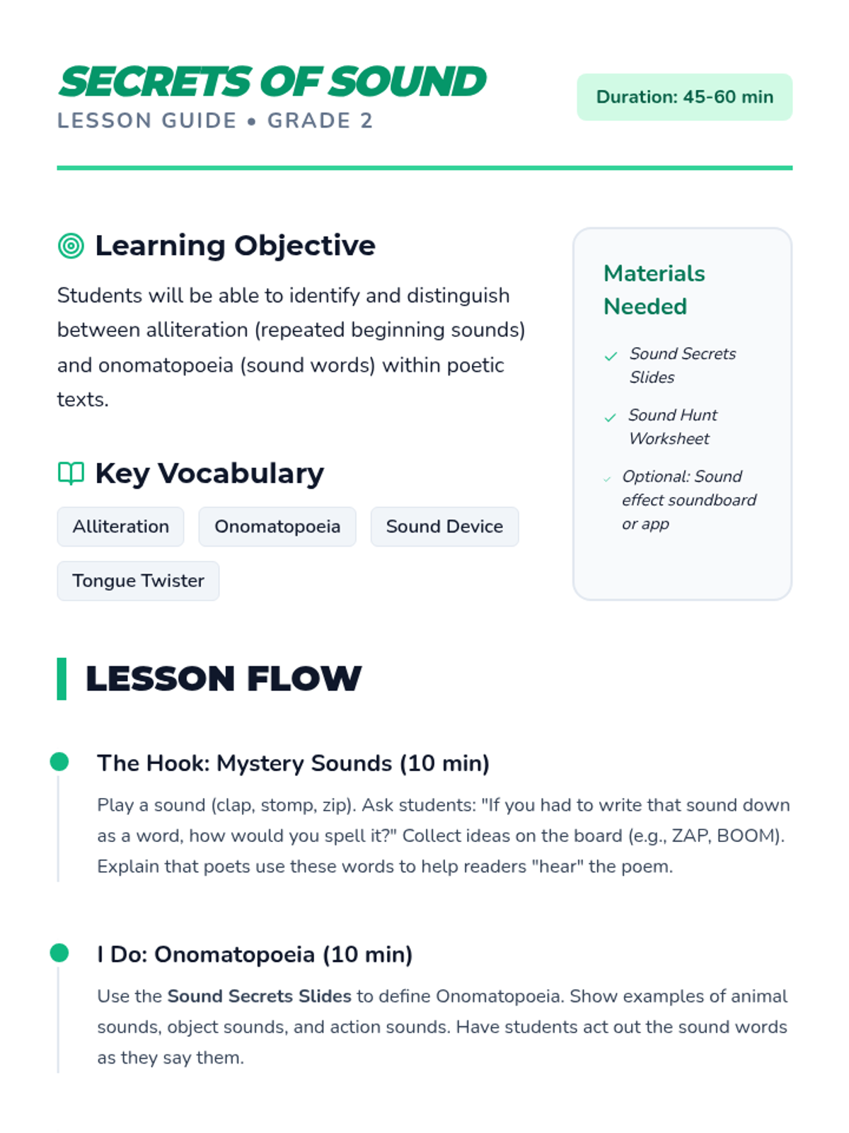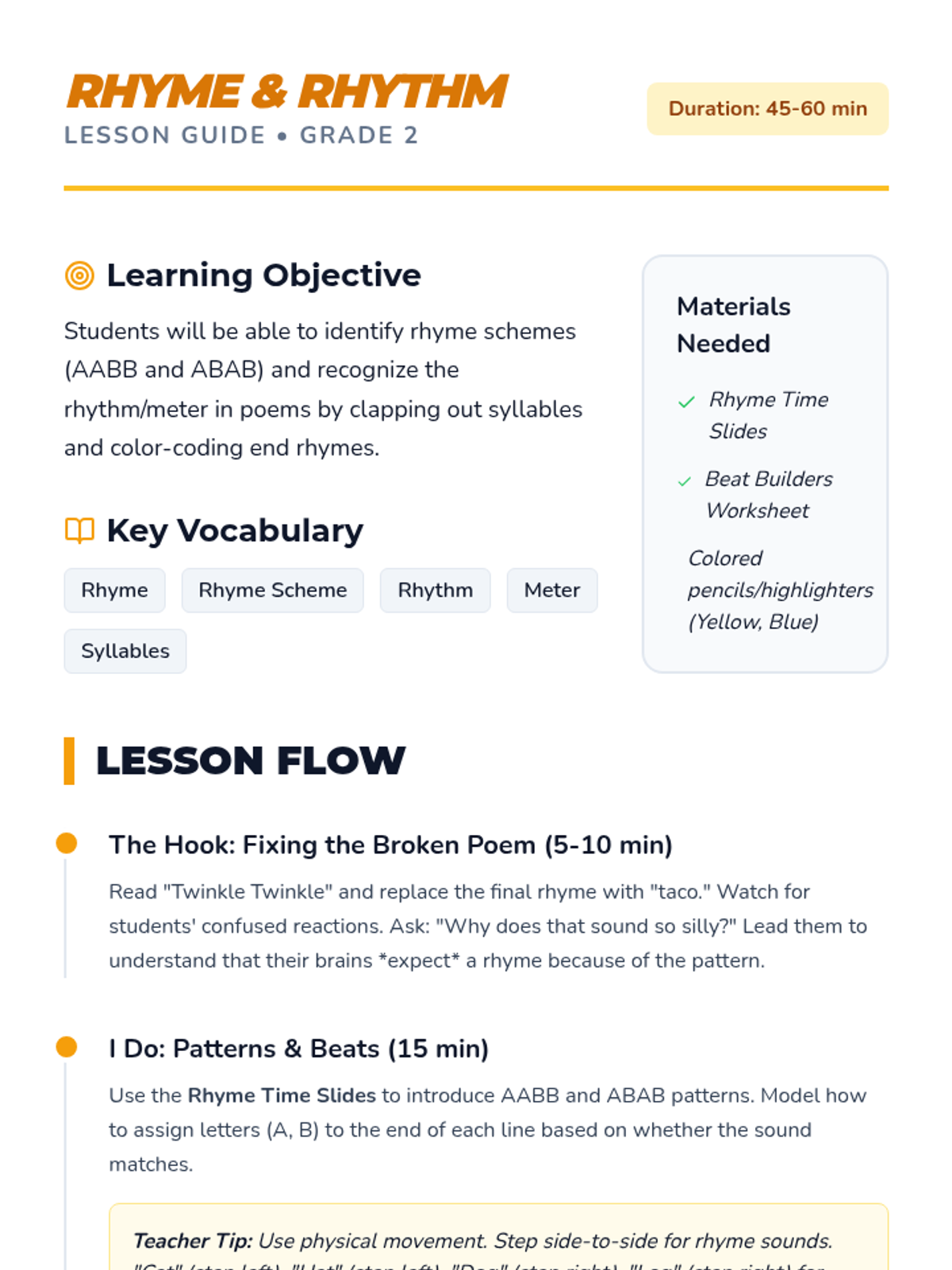 A comprehensive sequence for 2nd-grade students to explore the building blocks of poetry, including rhyme, rhythm, alliteration, onomatopoeia, structure, and imagery. Students learn through interactive analysis and choral performance.