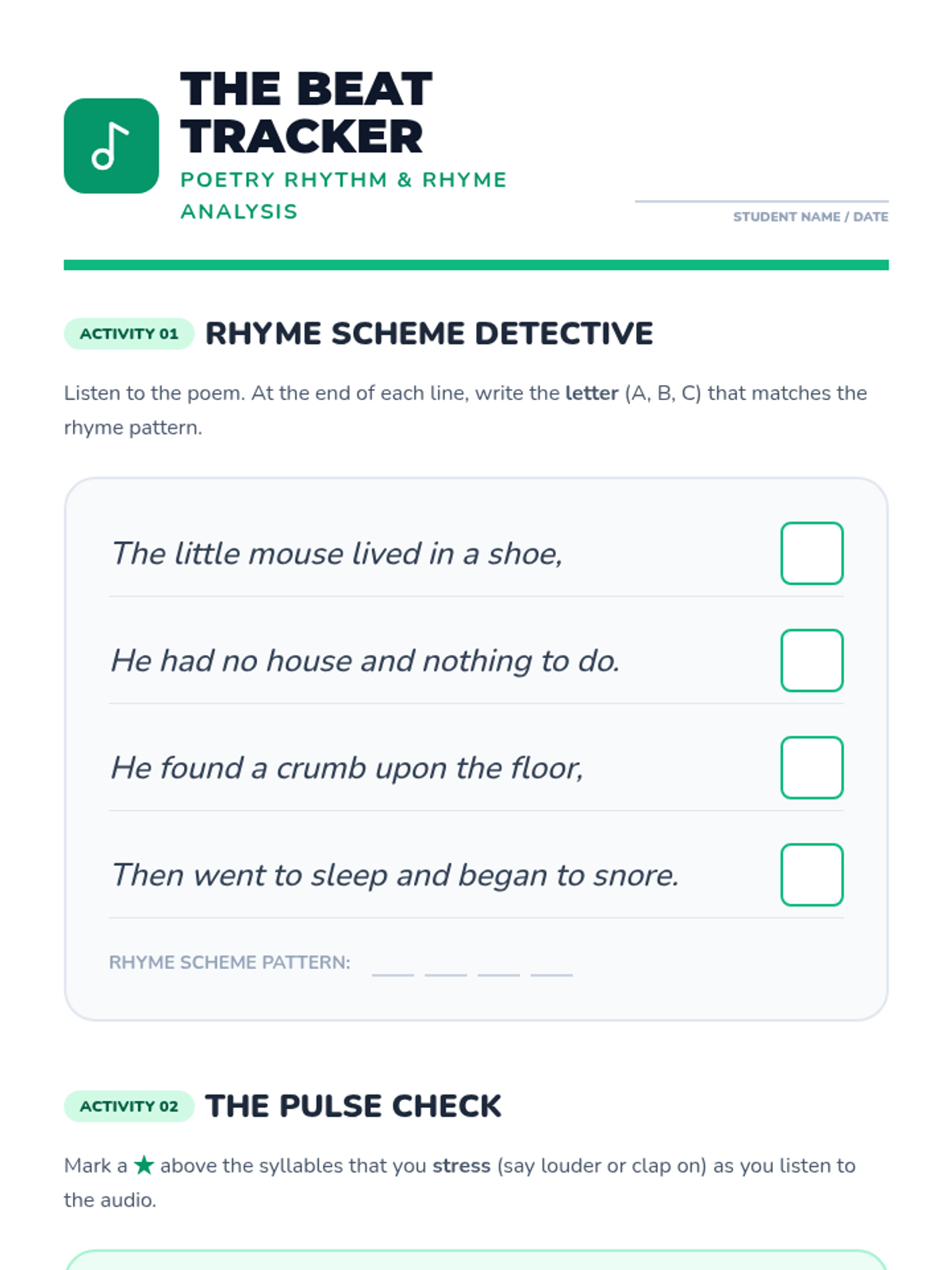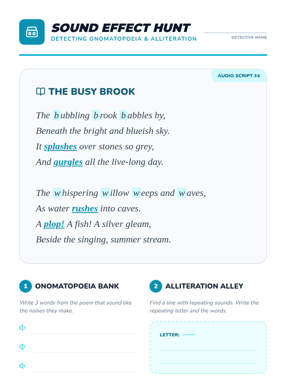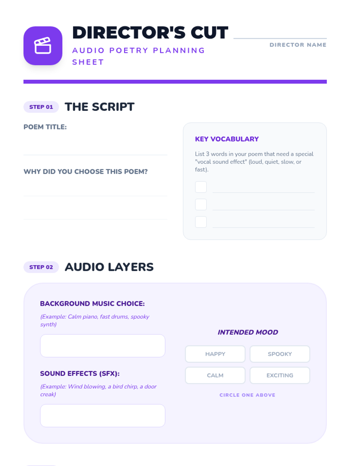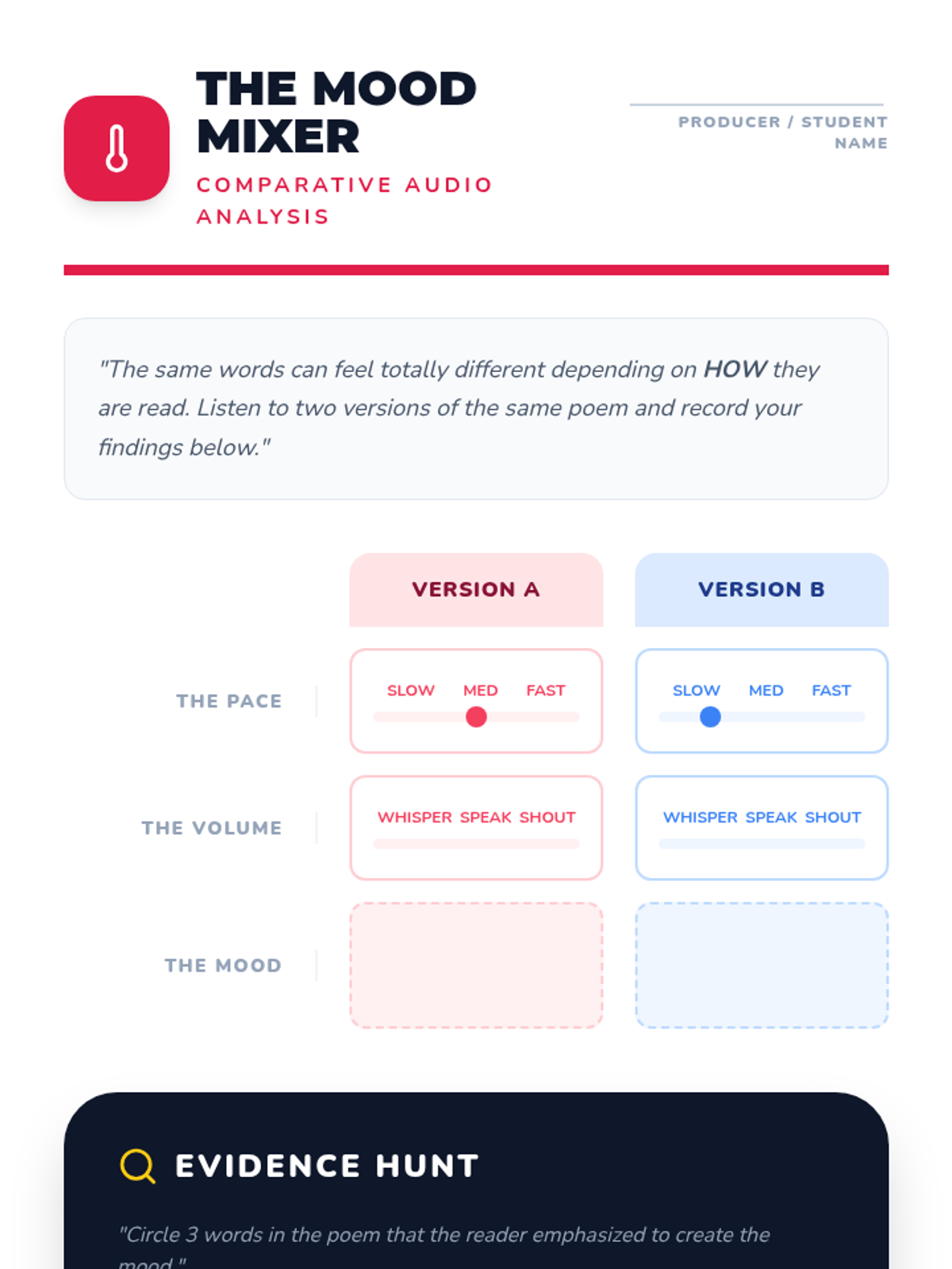 This 3rd-grade sequence explores how imagery, rhythm, and sound devices create meaning in poetry through a multisensory read-along approach. Students progress from visualizing sensory details to analyzing structural elements and finally synthesizing their understanding by creating their own audio-enhanced poetry experiences.