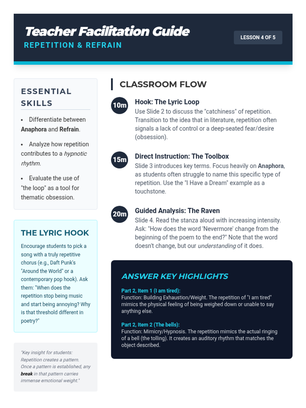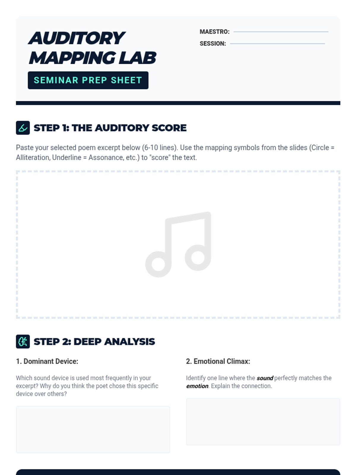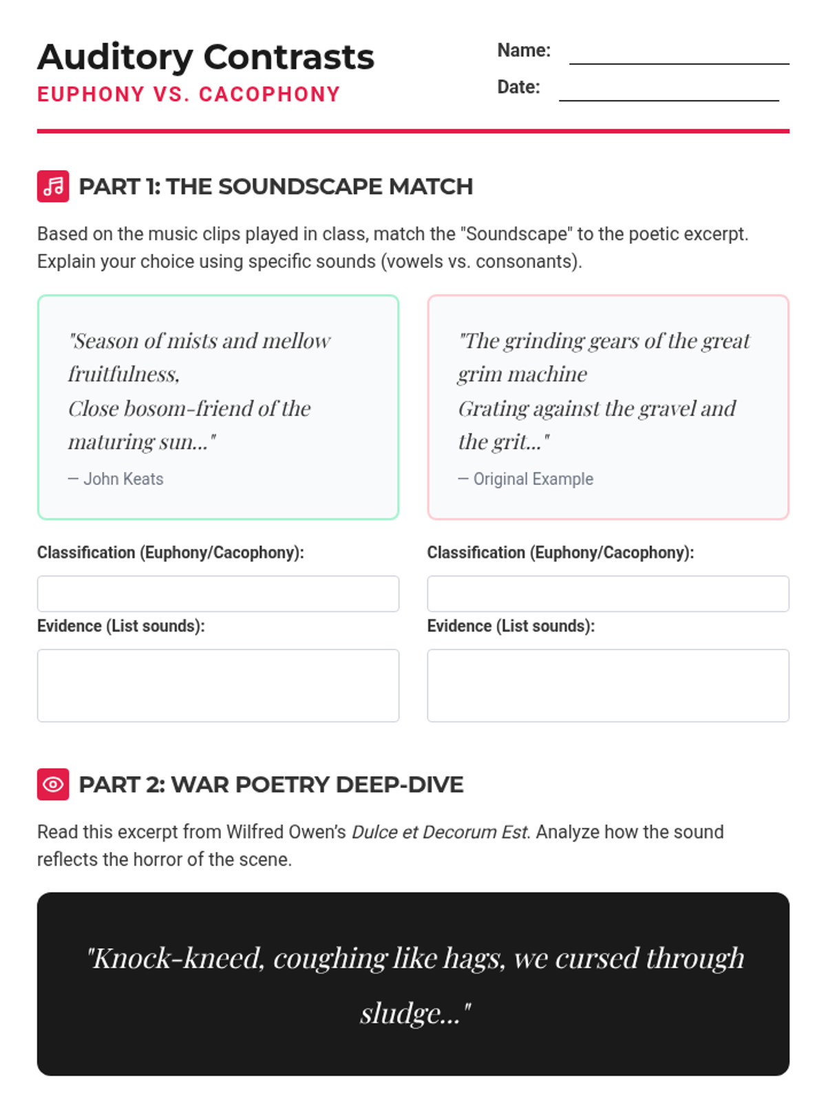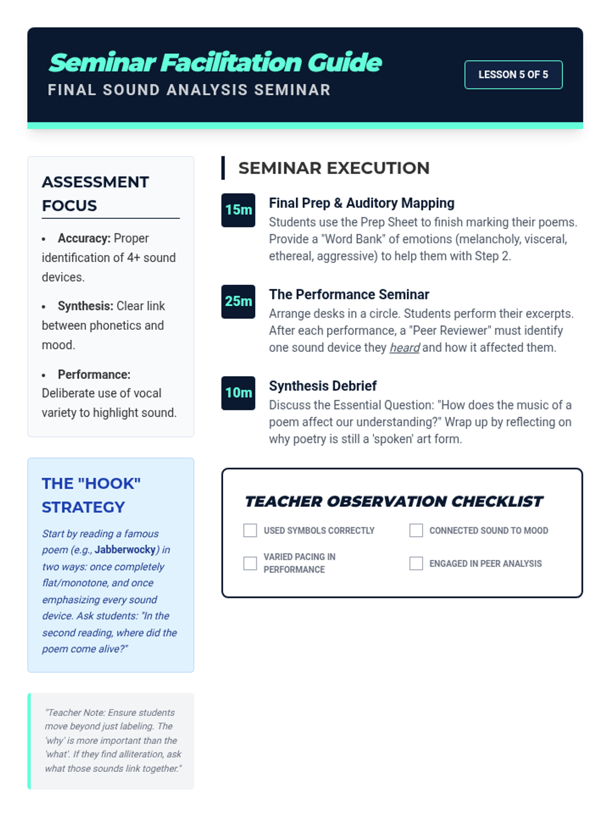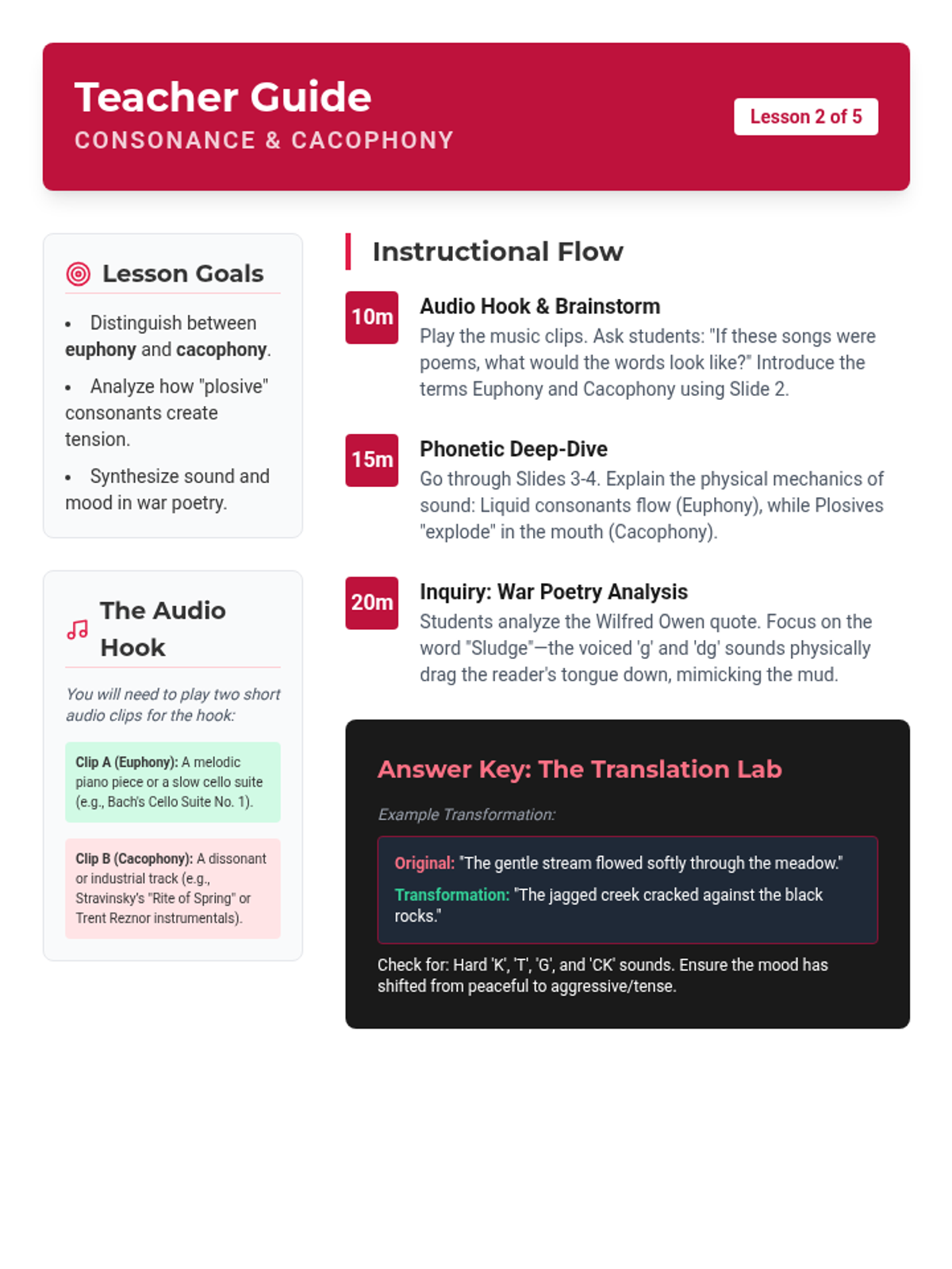 A 9th-grade poetry sequence focusing on the auditory elements of the genre, exploring how alliteration, assonance, onomatopoeia, and repetition create mood and meaning. Students move from identifying basic sound devices to conducting sophisticated auditory analyses of complex poems.