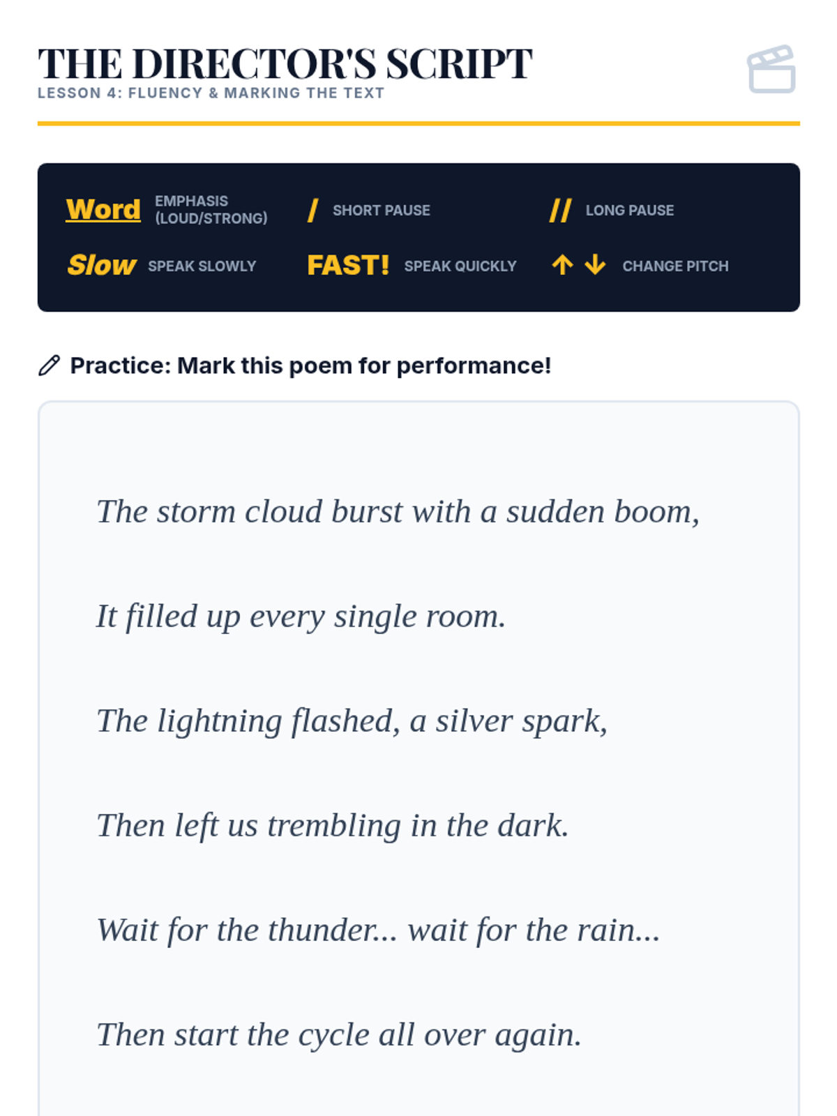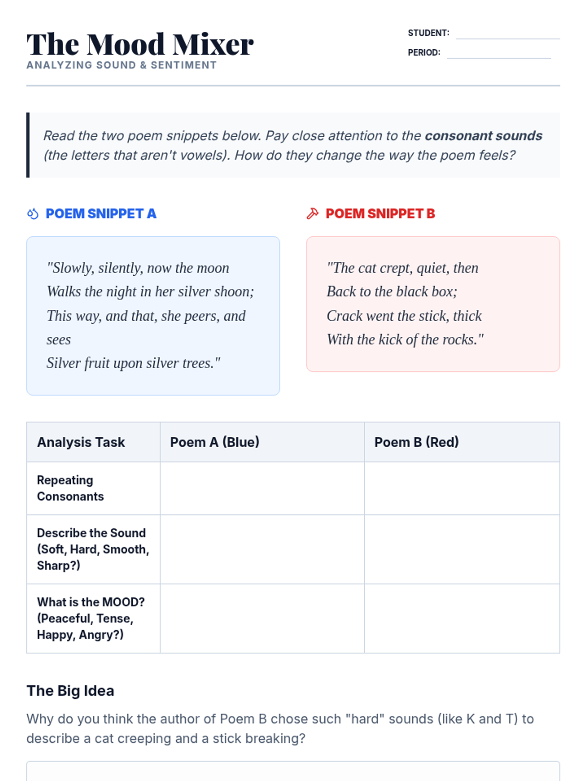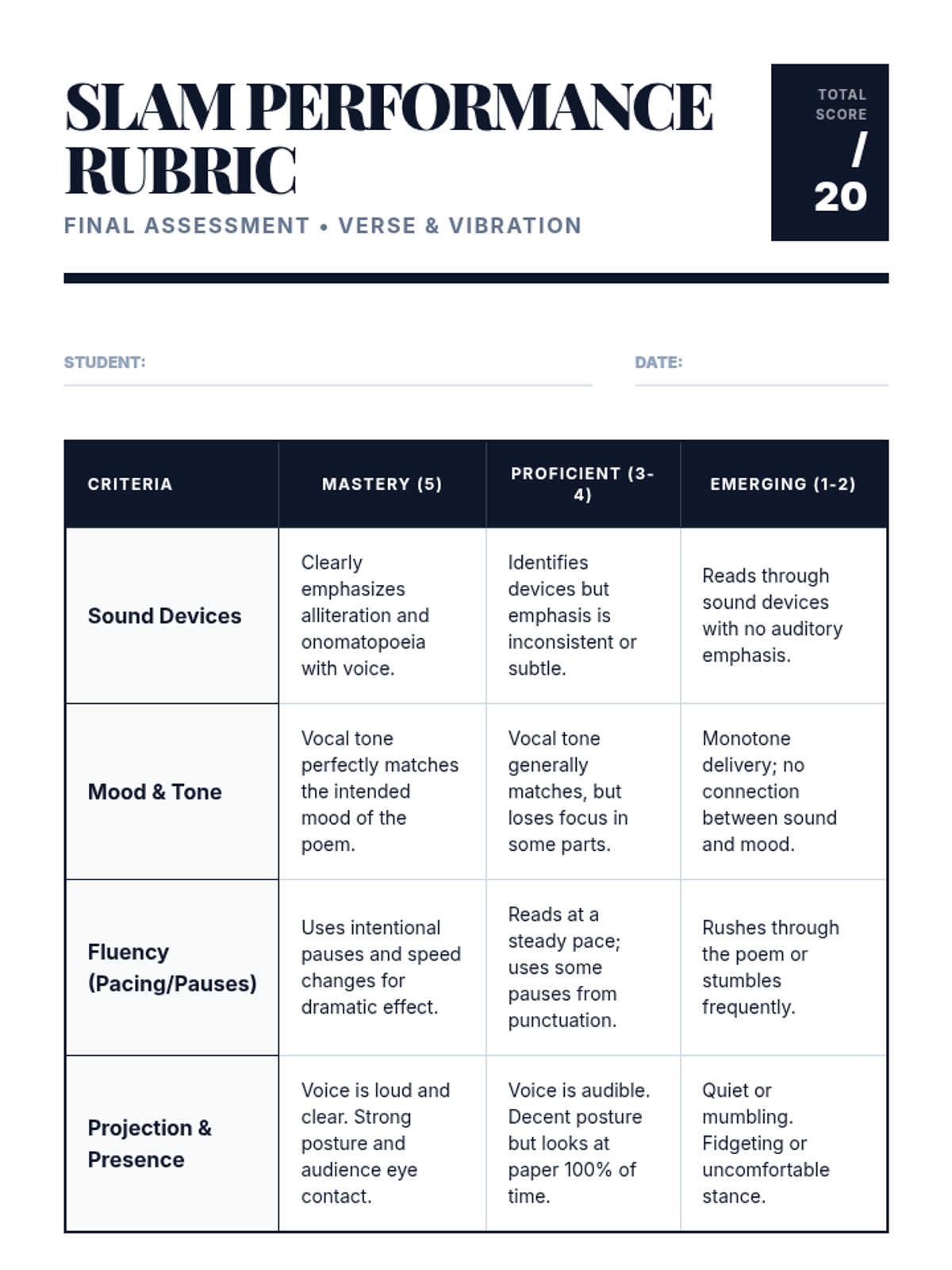 This immersive sequence focuses on the auditory experience of poetry, emphasizing that poems are meant to be heard. Students investigate sound devices like onomatopoeia, alliteration, and consonance to understand how sound creates mood and prepares them for oral performance.