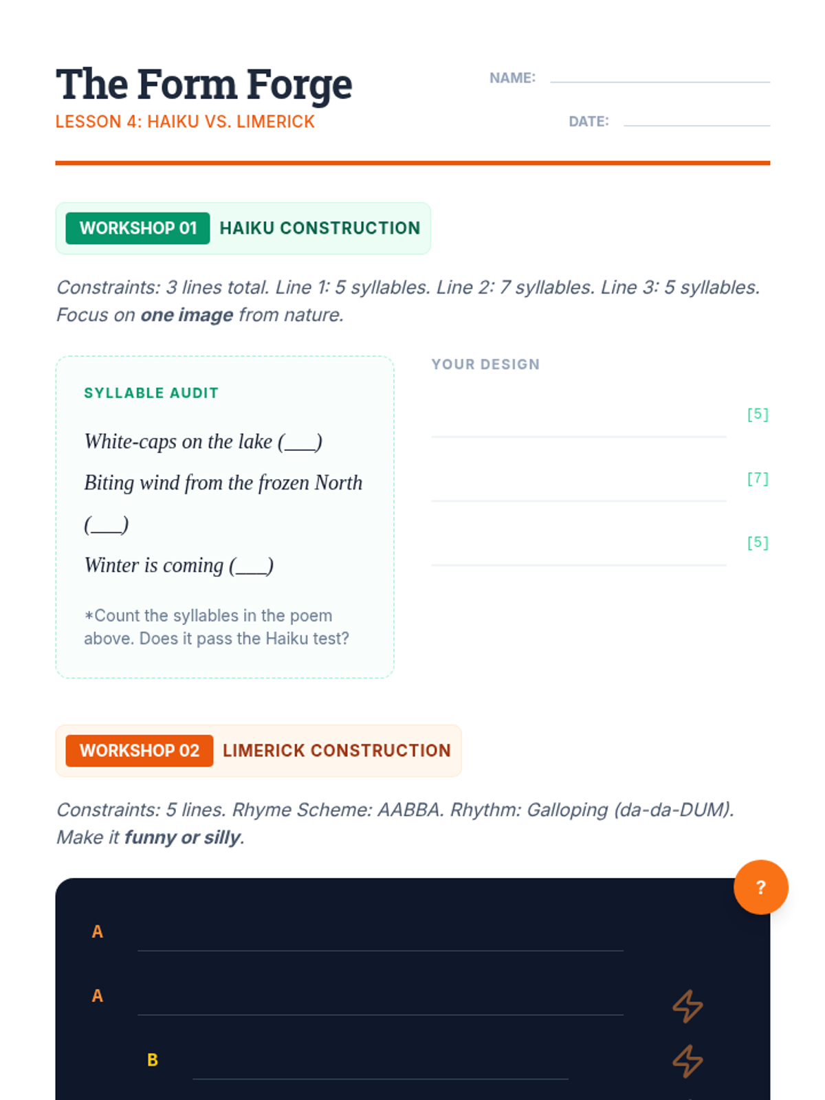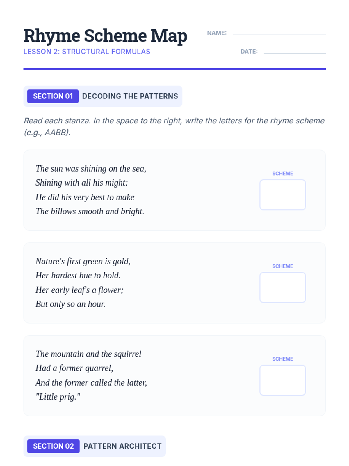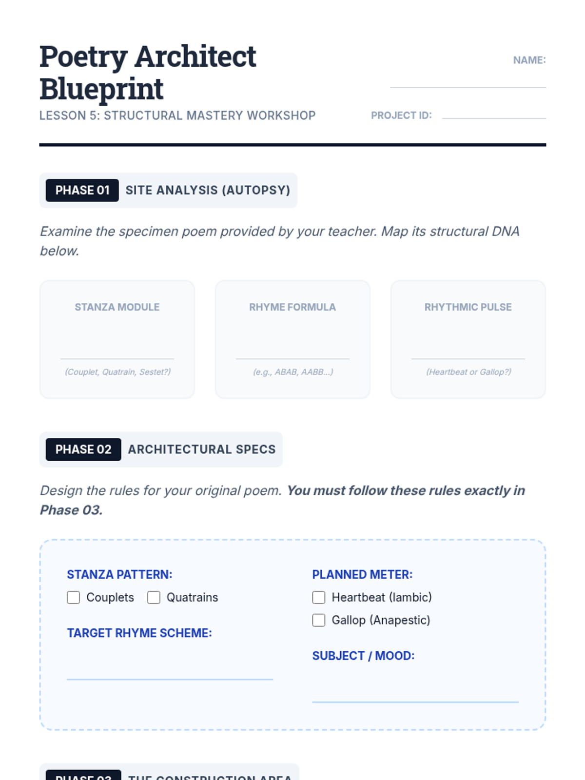 This sequence guides 6th-grade students through the structural mechanics of poetry, exploring stanzas, rhyme schemes, and meter. Students transition from identifying visual structures to active construction, using an architectural theme to understand how rules shape creativity.