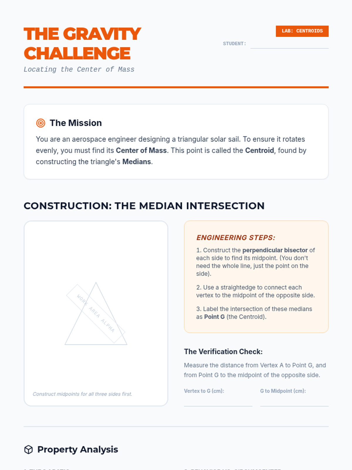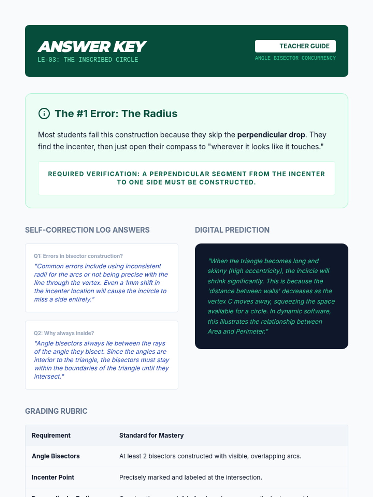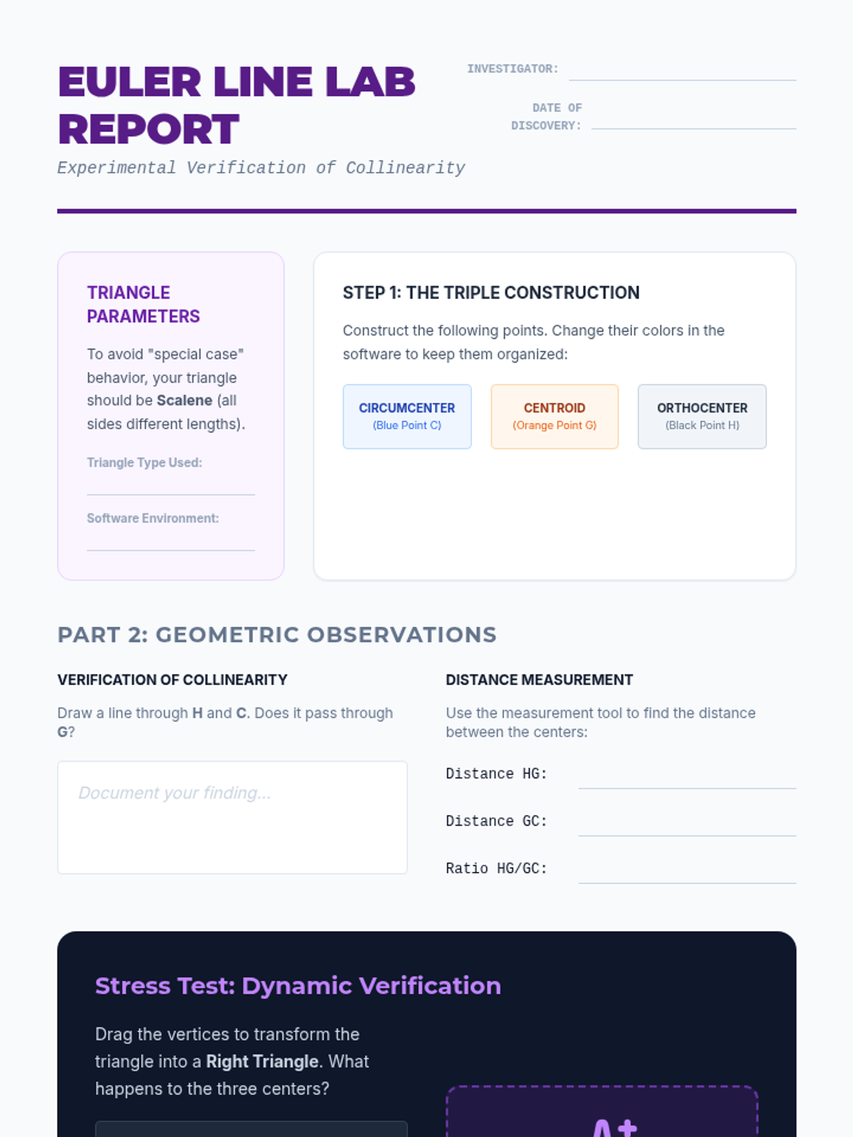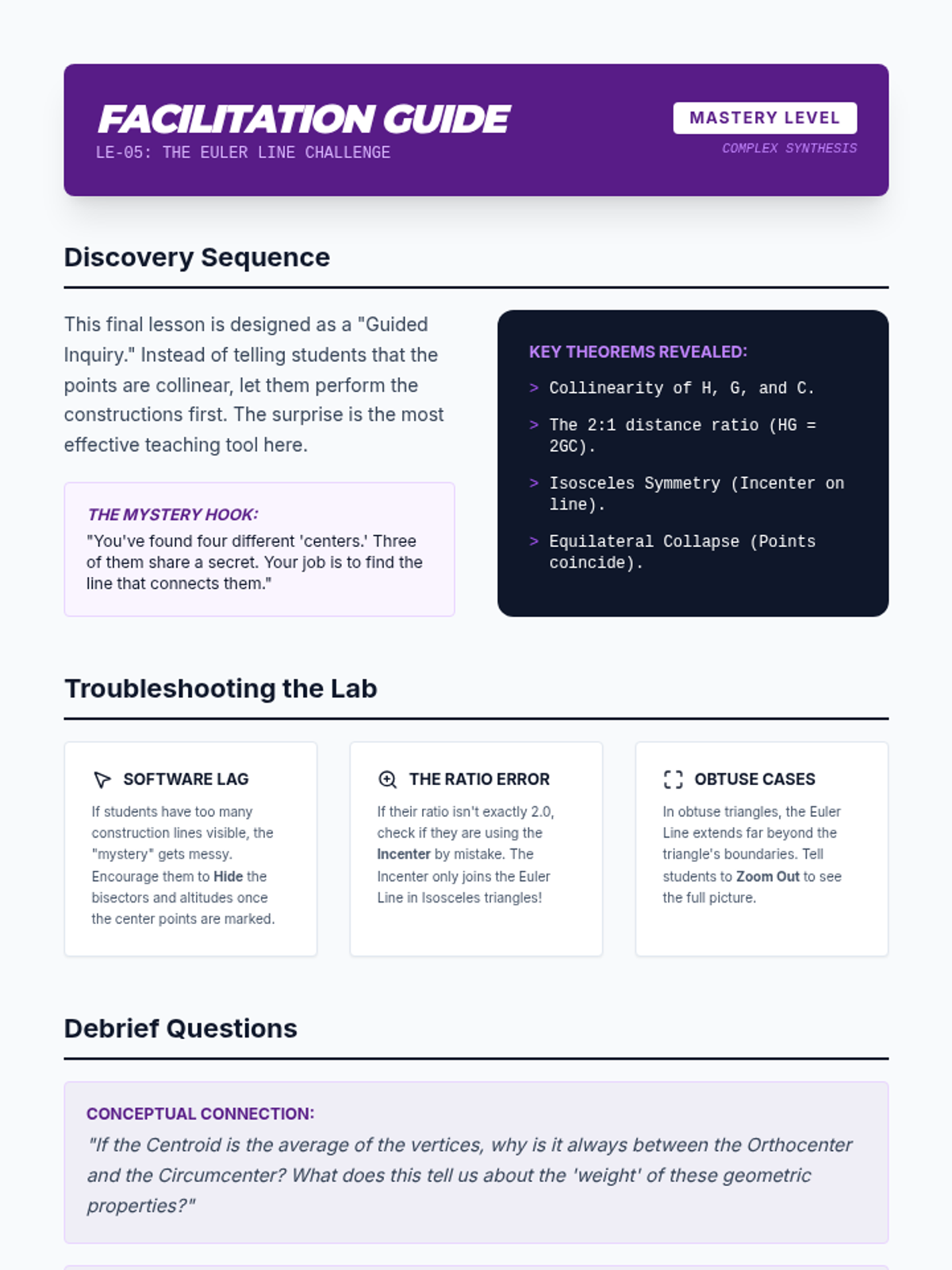 This advanced geometry sequence explores the points of concurrency in triangles through geometric constructions. Students use physical and digital tools to construct and analyze the circumcenter, incenter, centroid, and orthocenter, culminating in the discovery of the Euler Line.