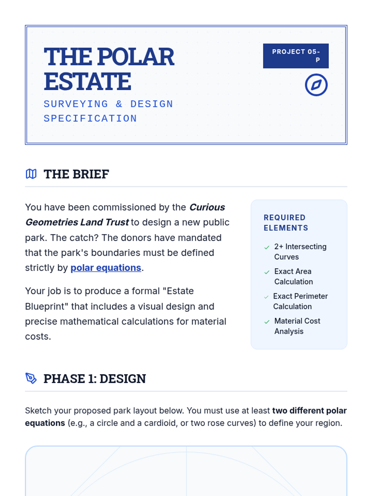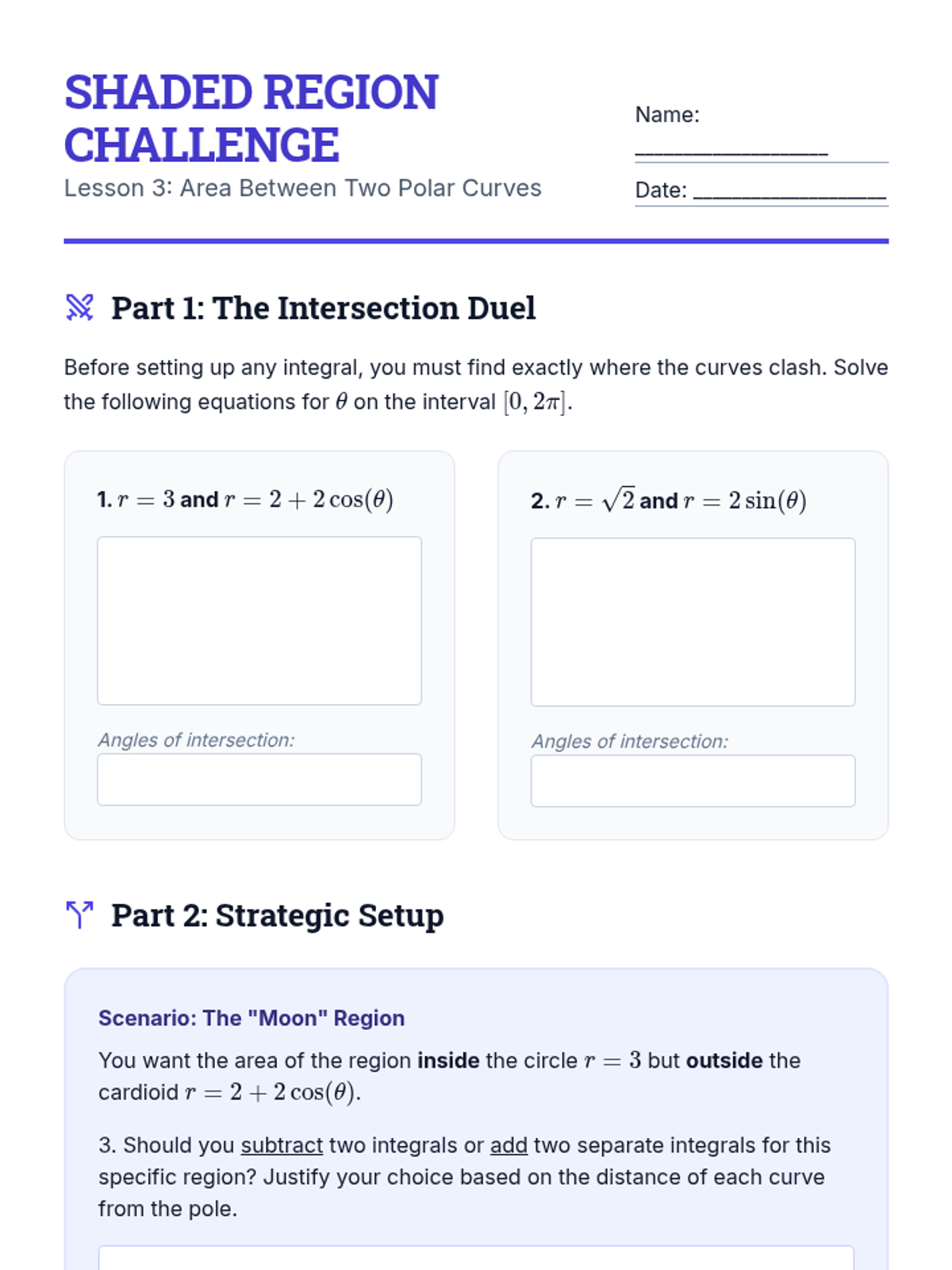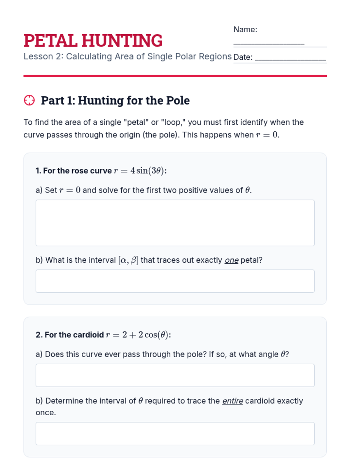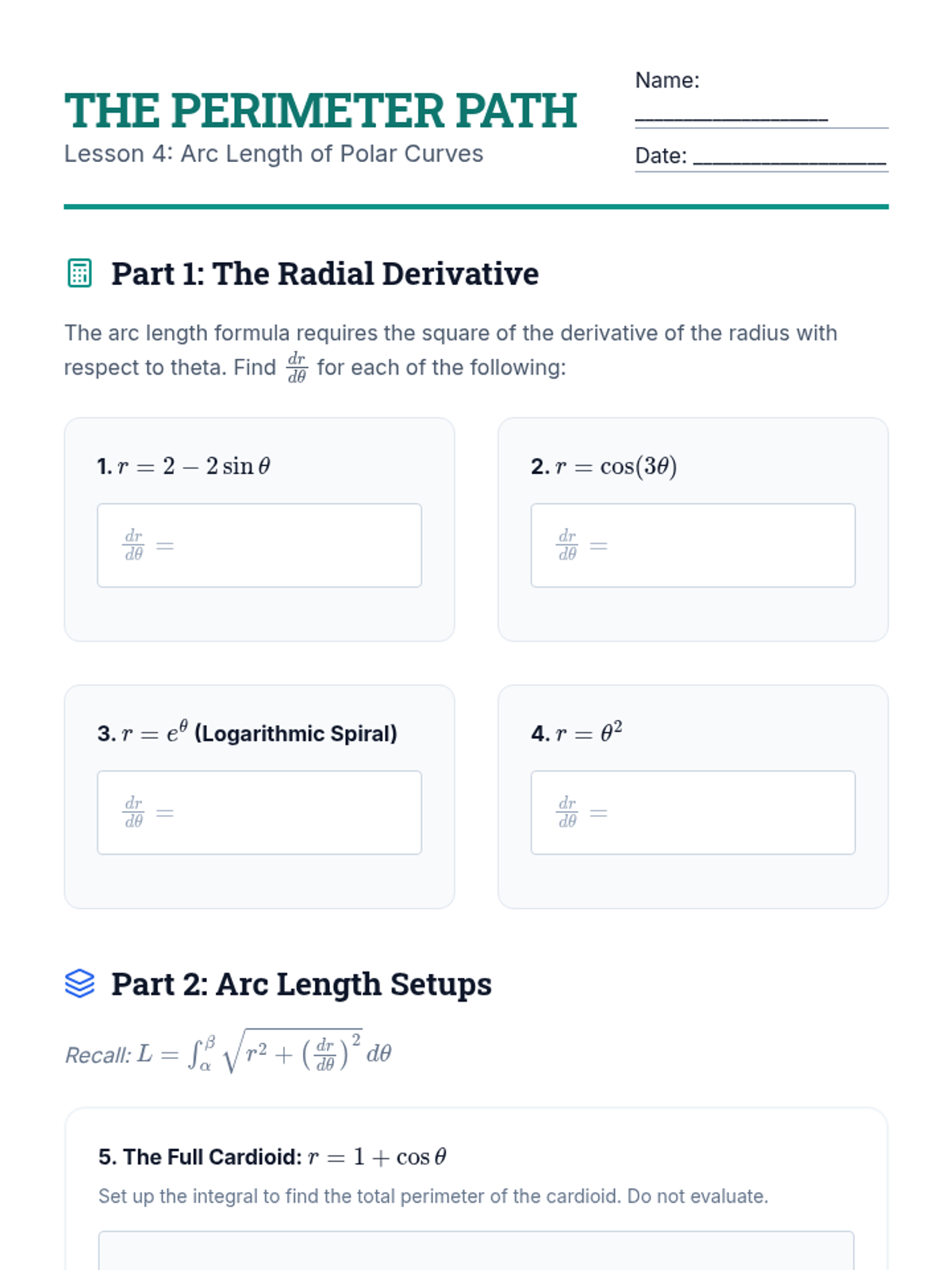 This calculus sequence guides 11th-grade students through the integration techniques required to calculate area and arc length within polar coordinate systems. From the geometric derivation of the polar sector formula to complex multi-curve regions and boundary measurements, students apply integral calculus to circular geometries.