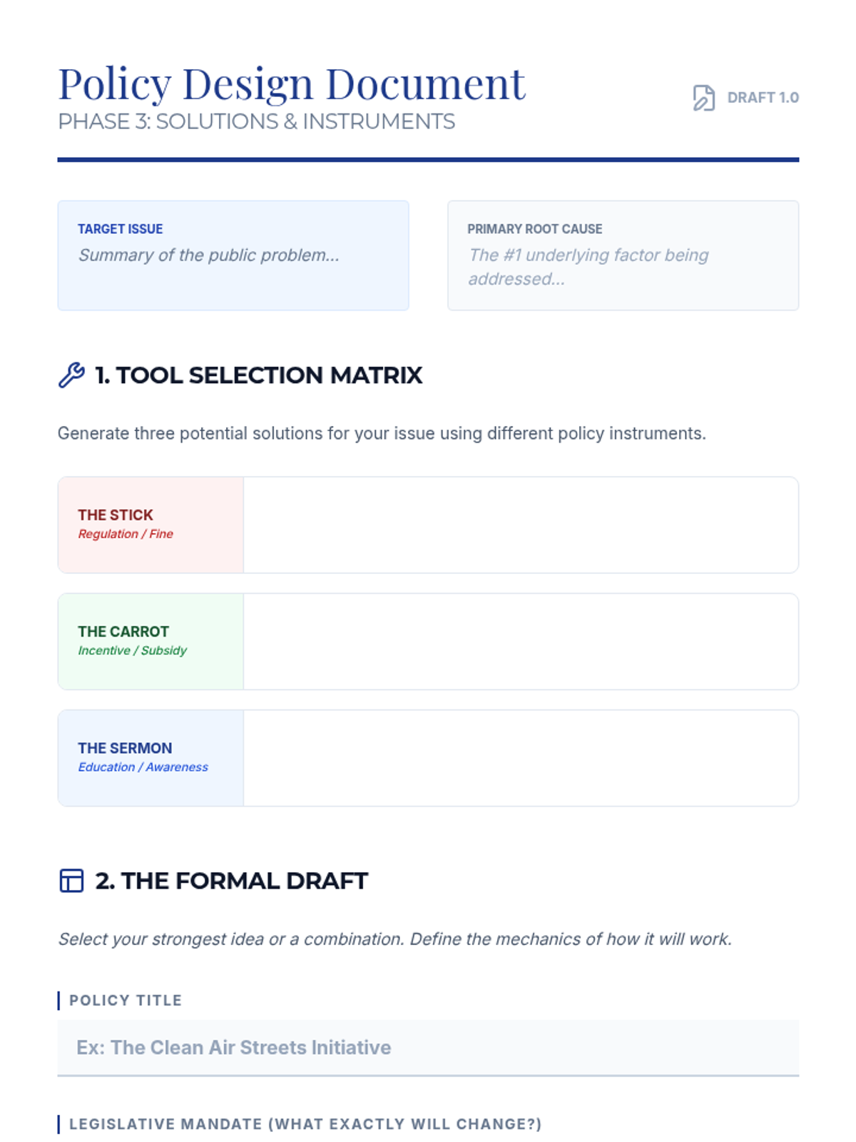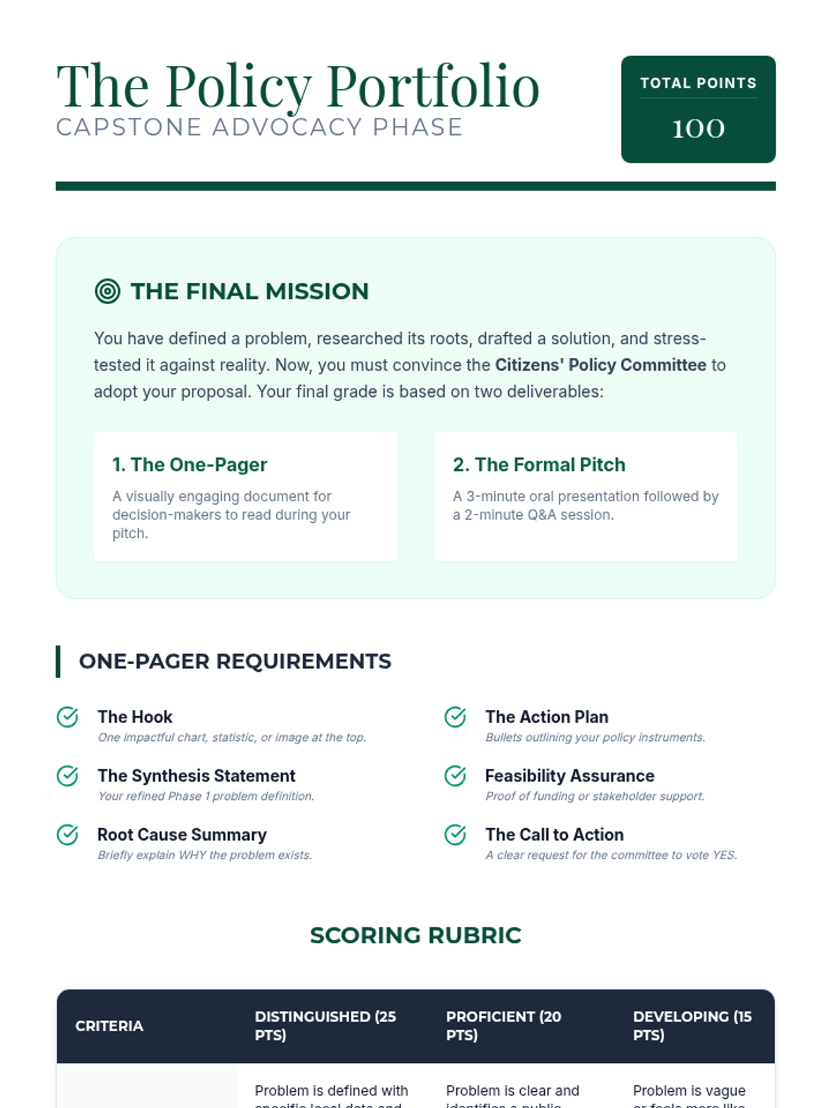 A project-based unit where students transform from community observers into policy architects. They learn to identify systemic issues, research root causes, design legislative solutions, and advocate for change through a professional policy pitch.
