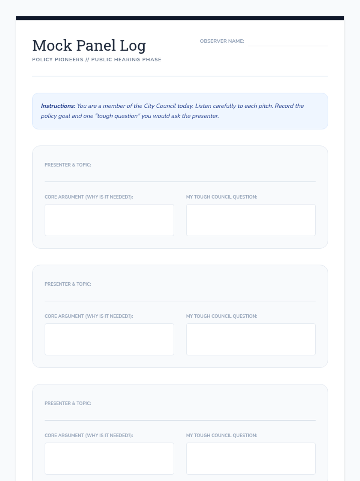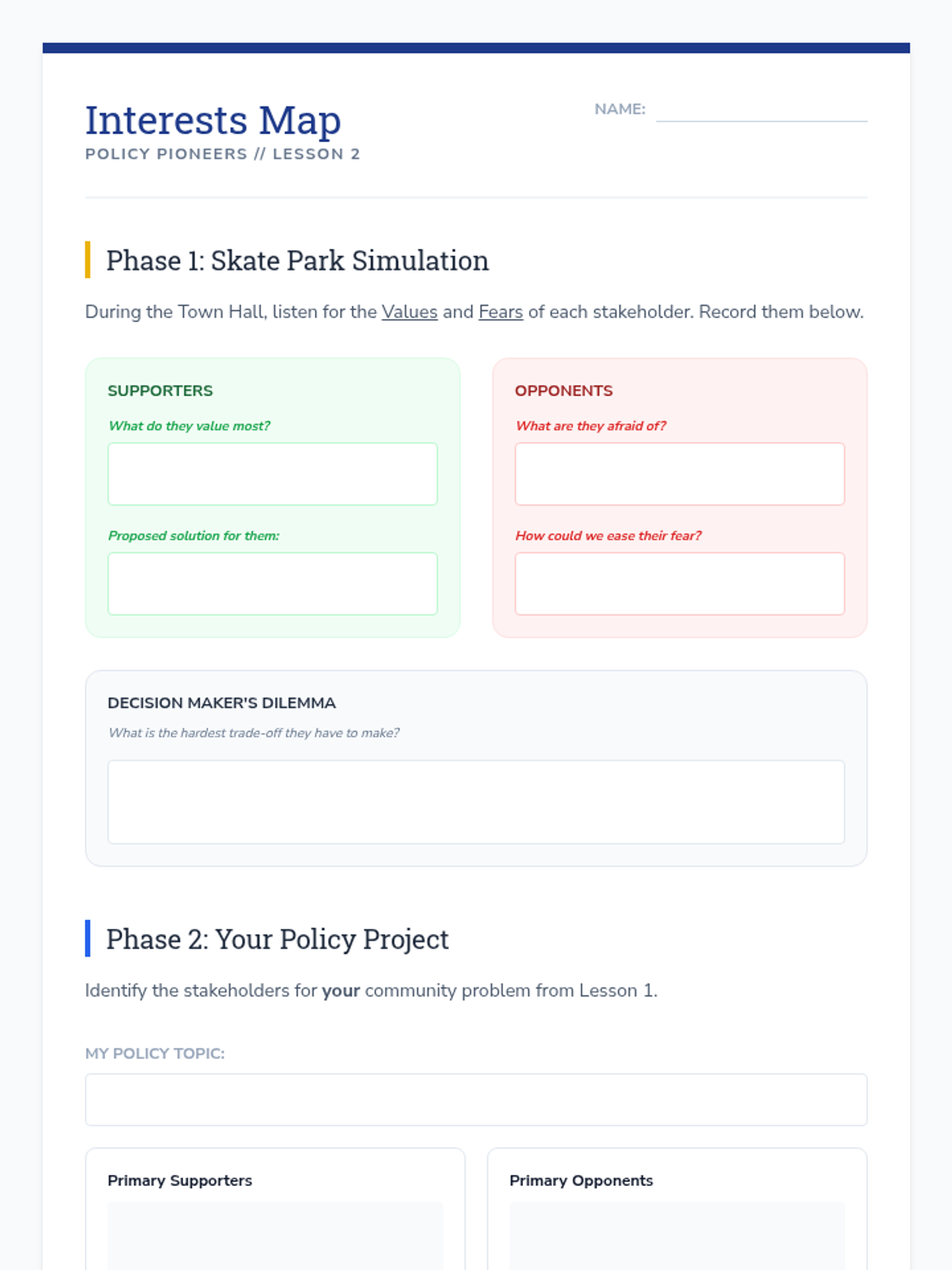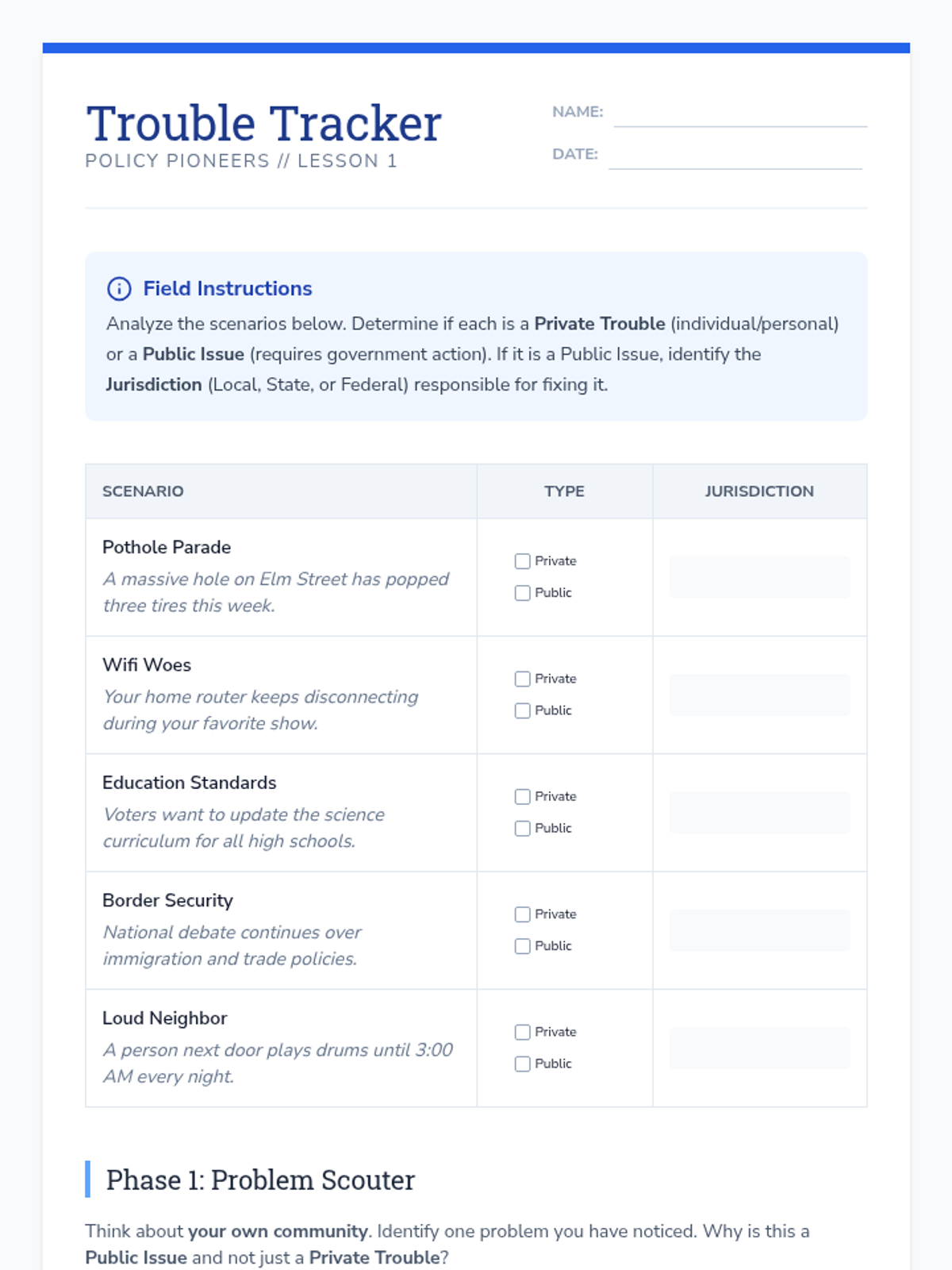 Students transition from passive observers to active civic participants by identifying local issues and constructing viable policy solutions. This sequence covers the entire policy cycle: from problem definition and stakeholder analysis to feasibility assessment and formal legislative drafting.
