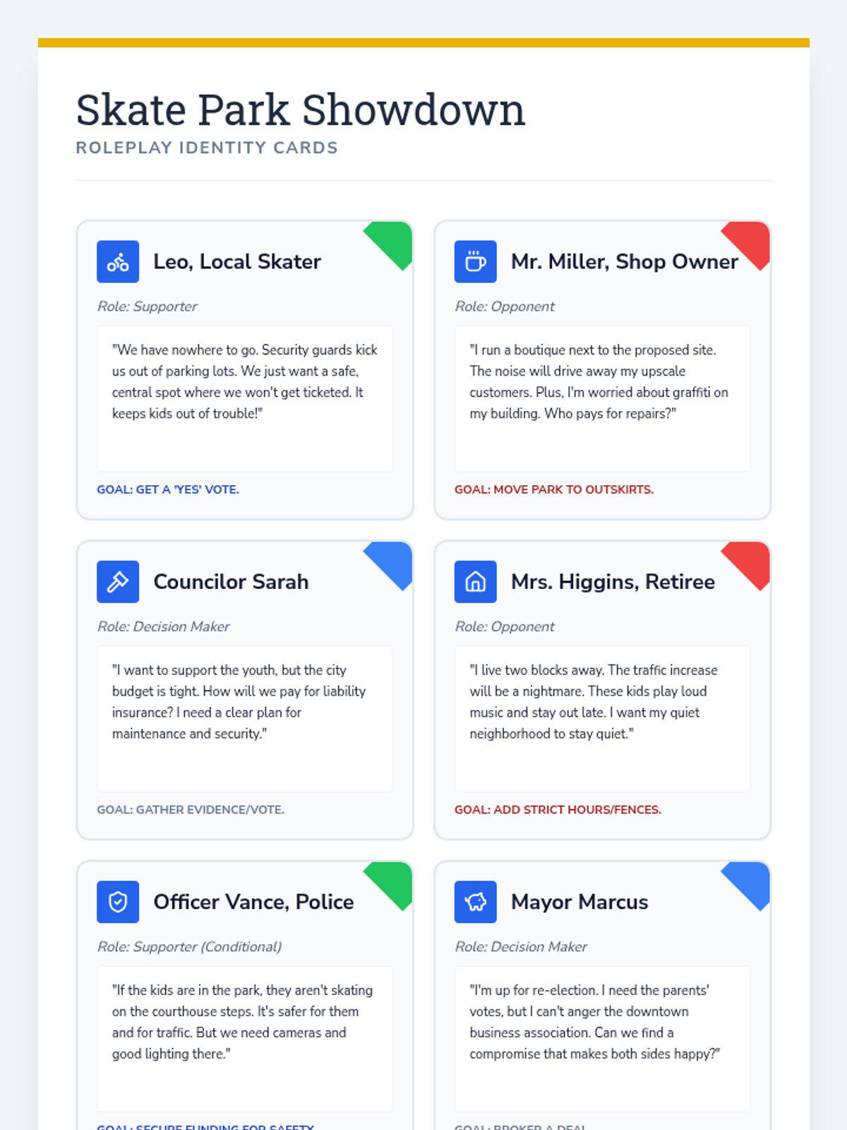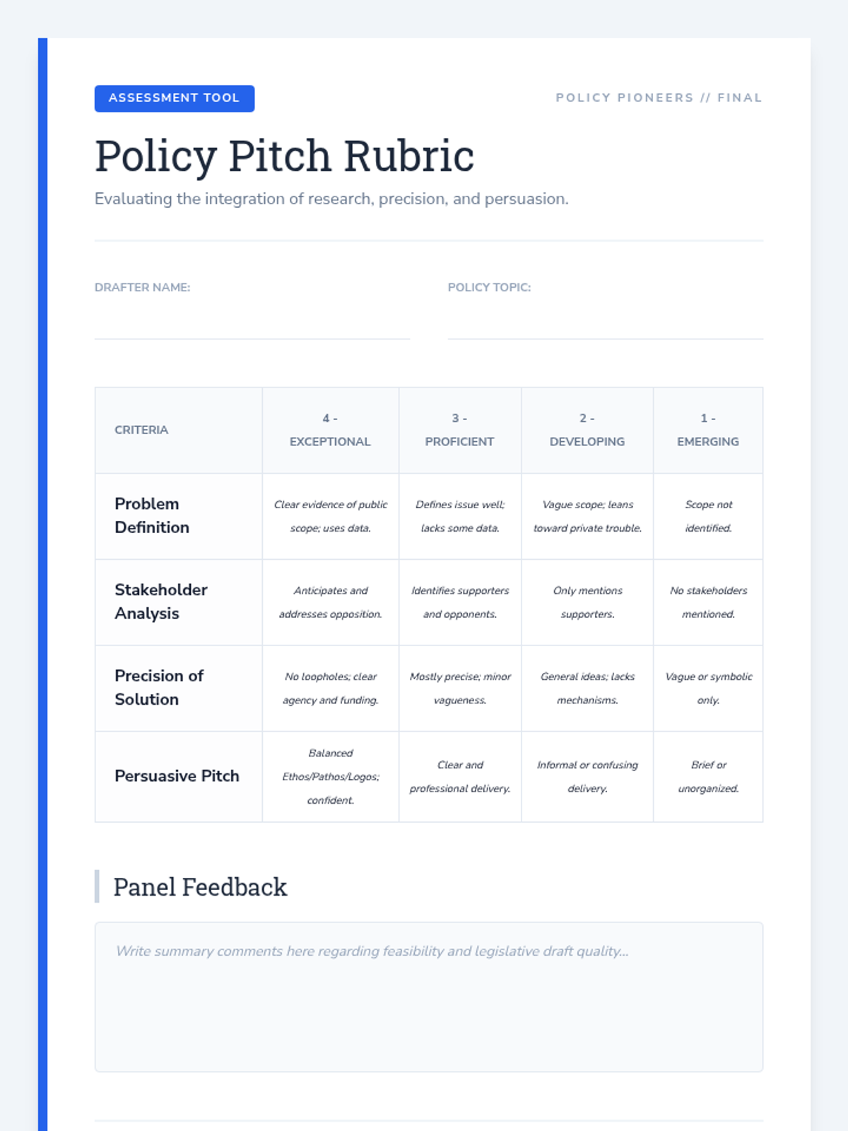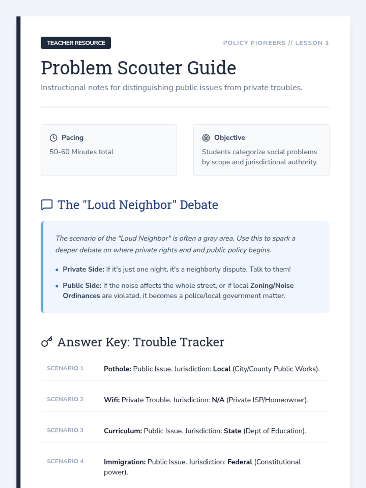 Students transition from passive observers to active civic participants by identifying local issues and constructing viable policy solutions. This sequence covers the entire policy cycle: from problem definition and stakeholder analysis to feasibility assessment and formal legislative drafting.