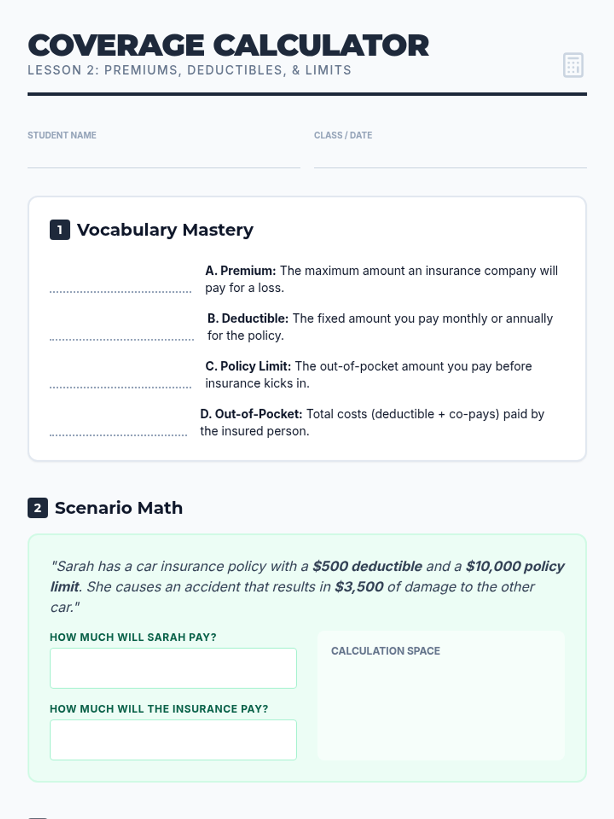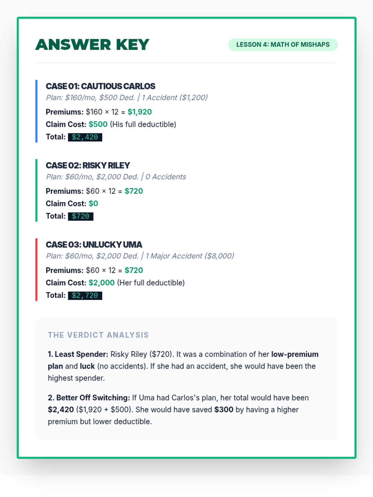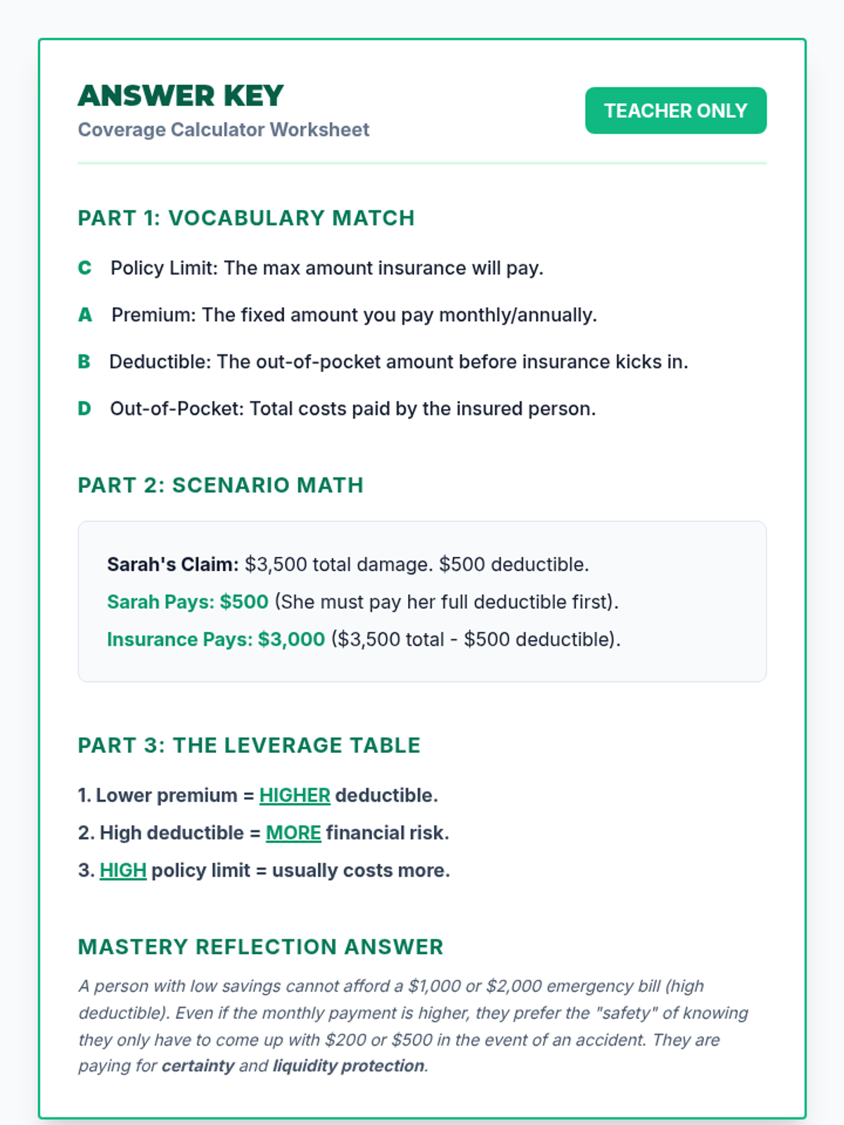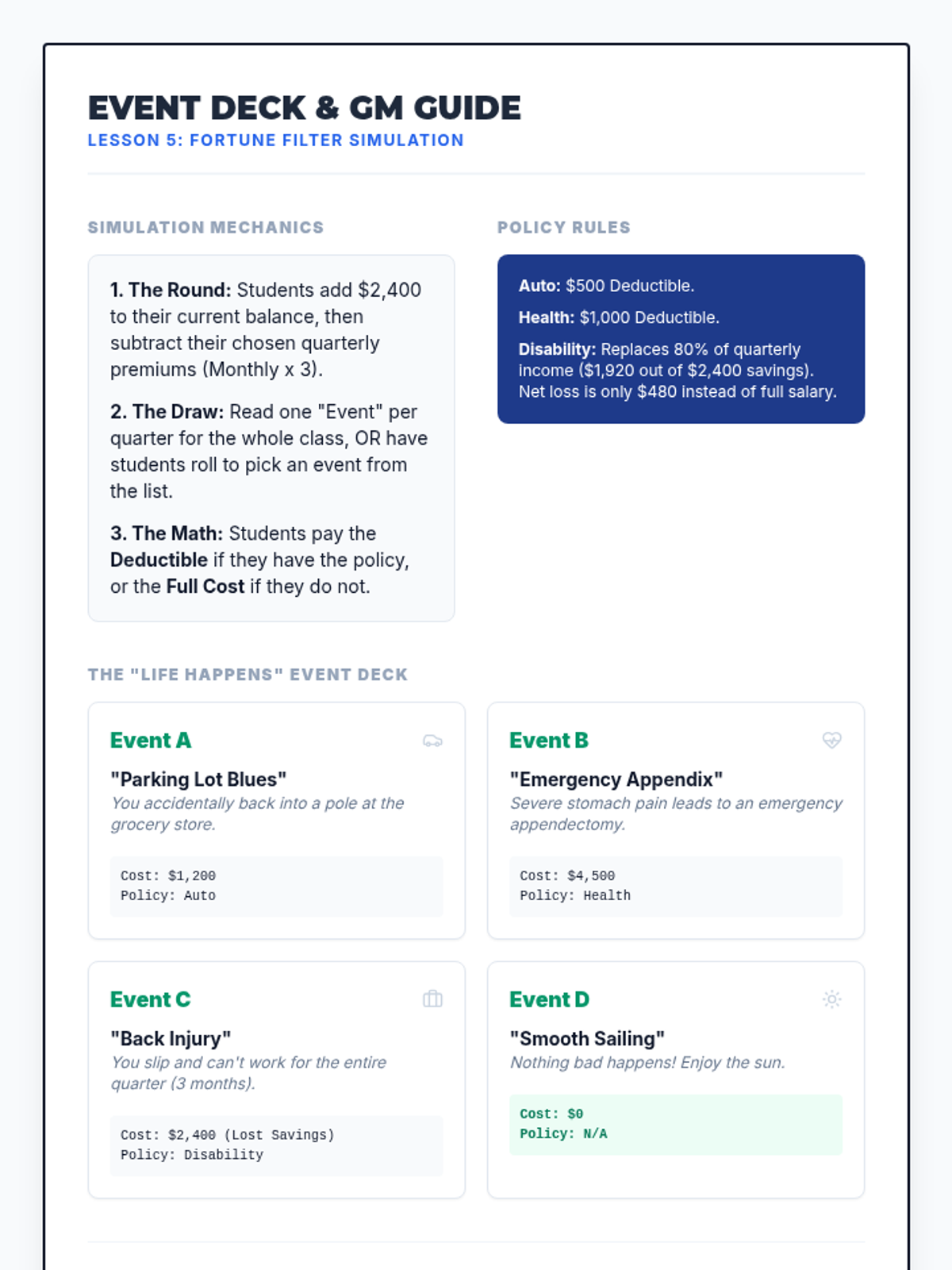 A comprehensive 10th-grade financial literacy unit on insurance. Students explore risk pooling through games, master the inverse relationship between premiums and deductibles, and apply mathematical reasoning to calculate total out-of-pocket costs across various life scenarios.