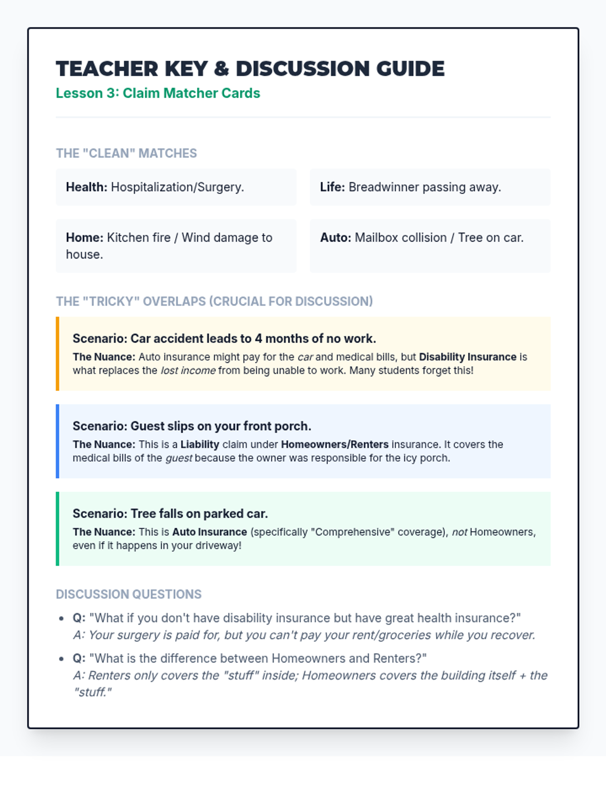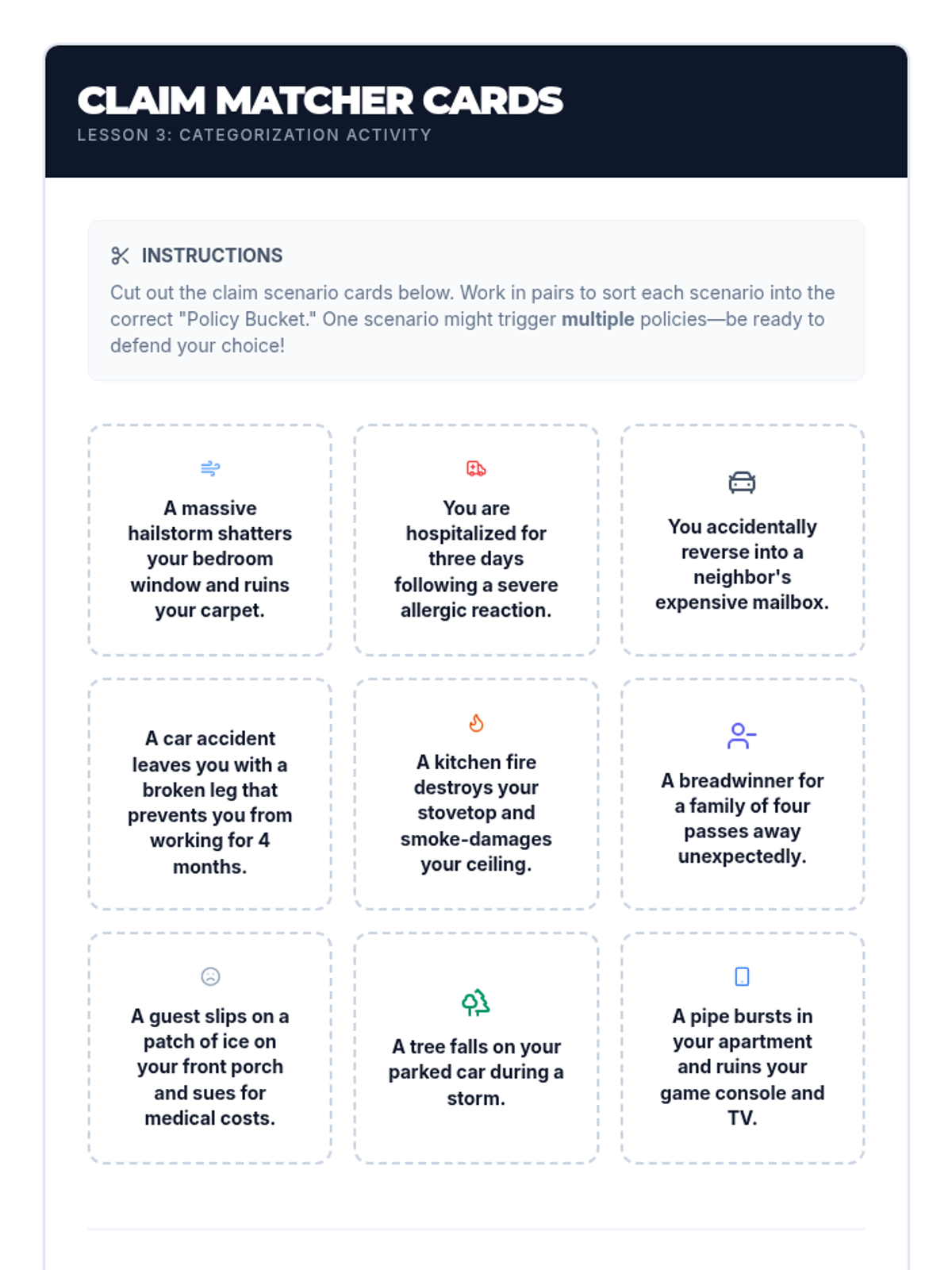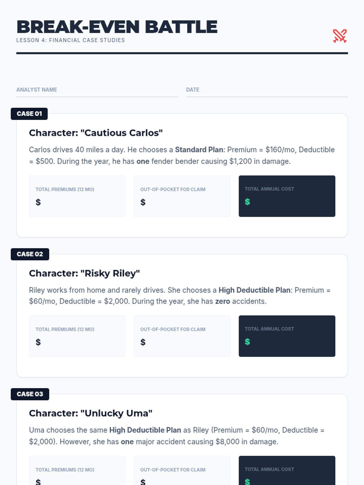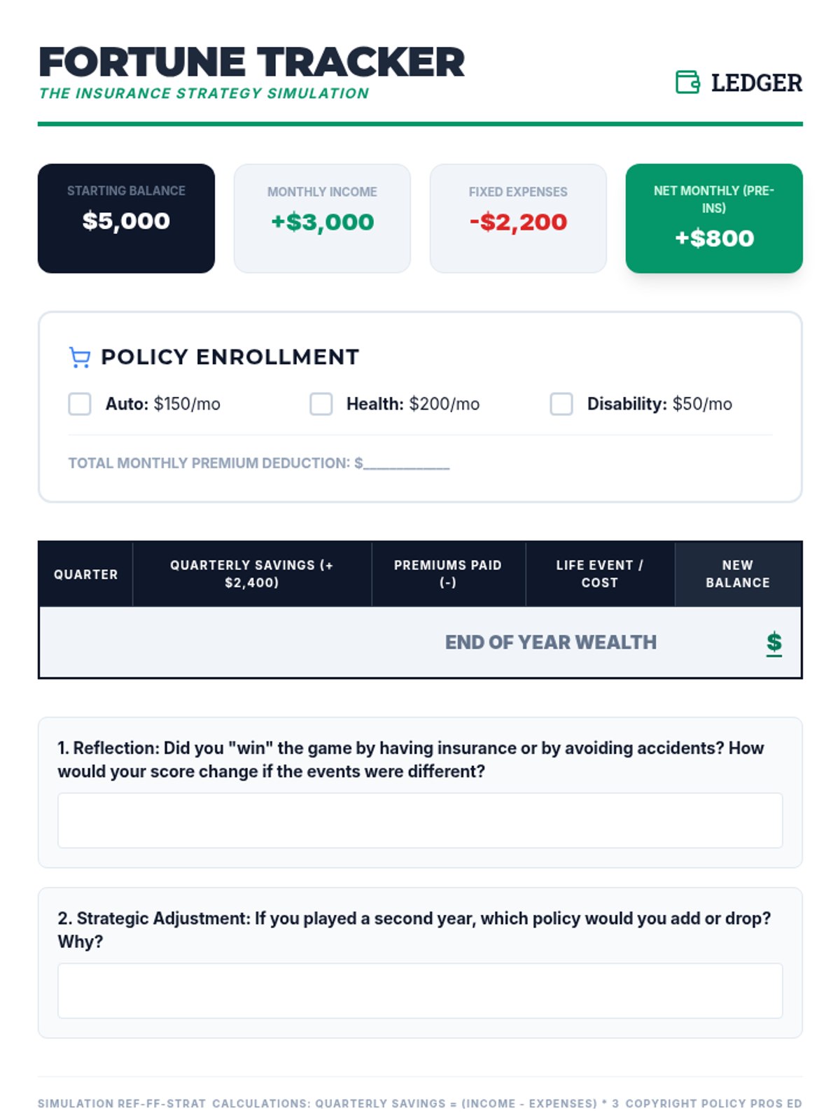 A comprehensive 10th-grade financial literacy unit on insurance. Students explore risk pooling through games, master the inverse relationship between premiums and deductibles, and apply mathematical reasoning to calculate total out-of-pocket costs across various life scenarios.