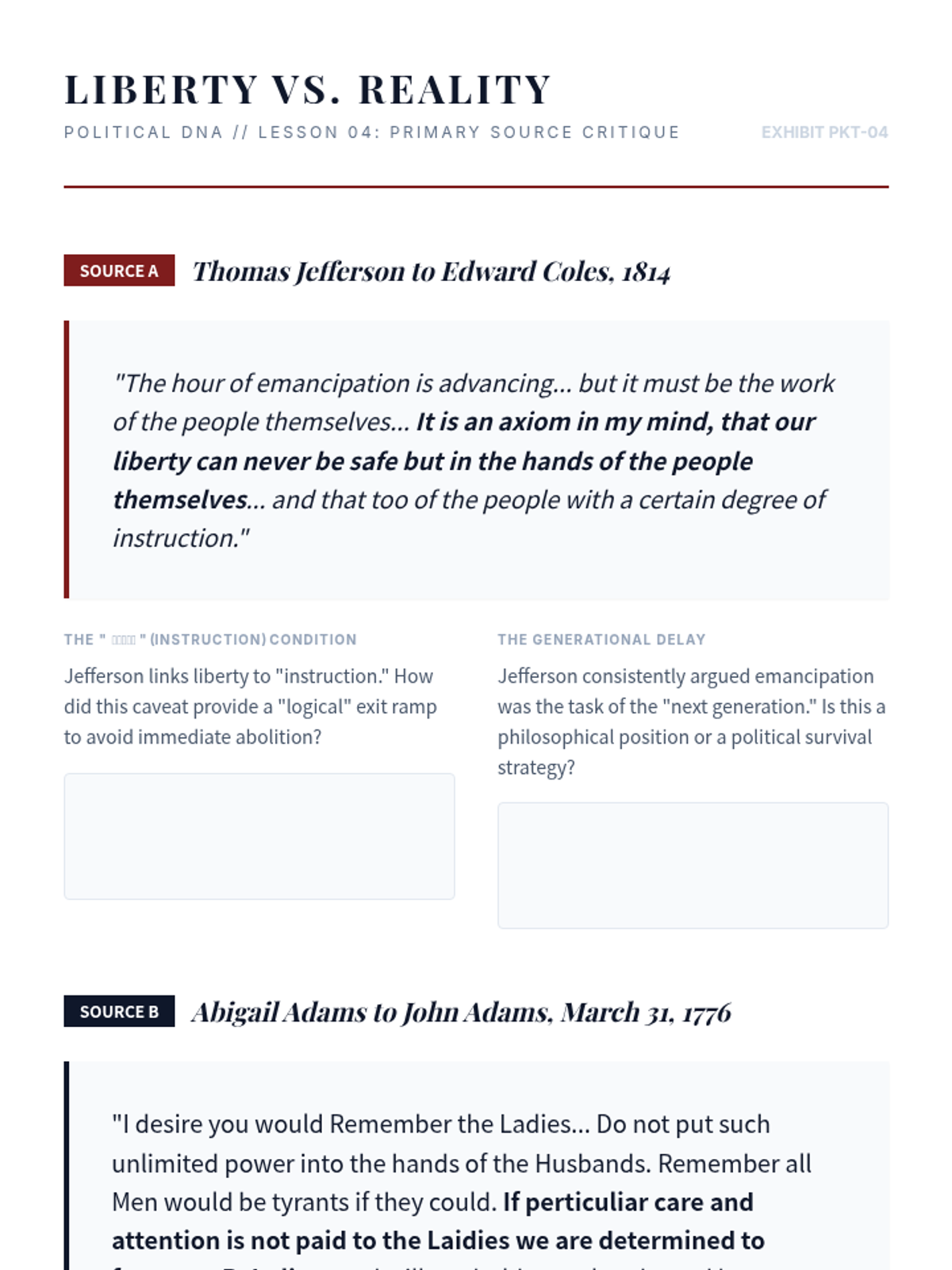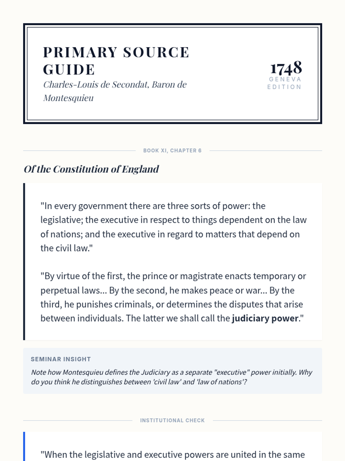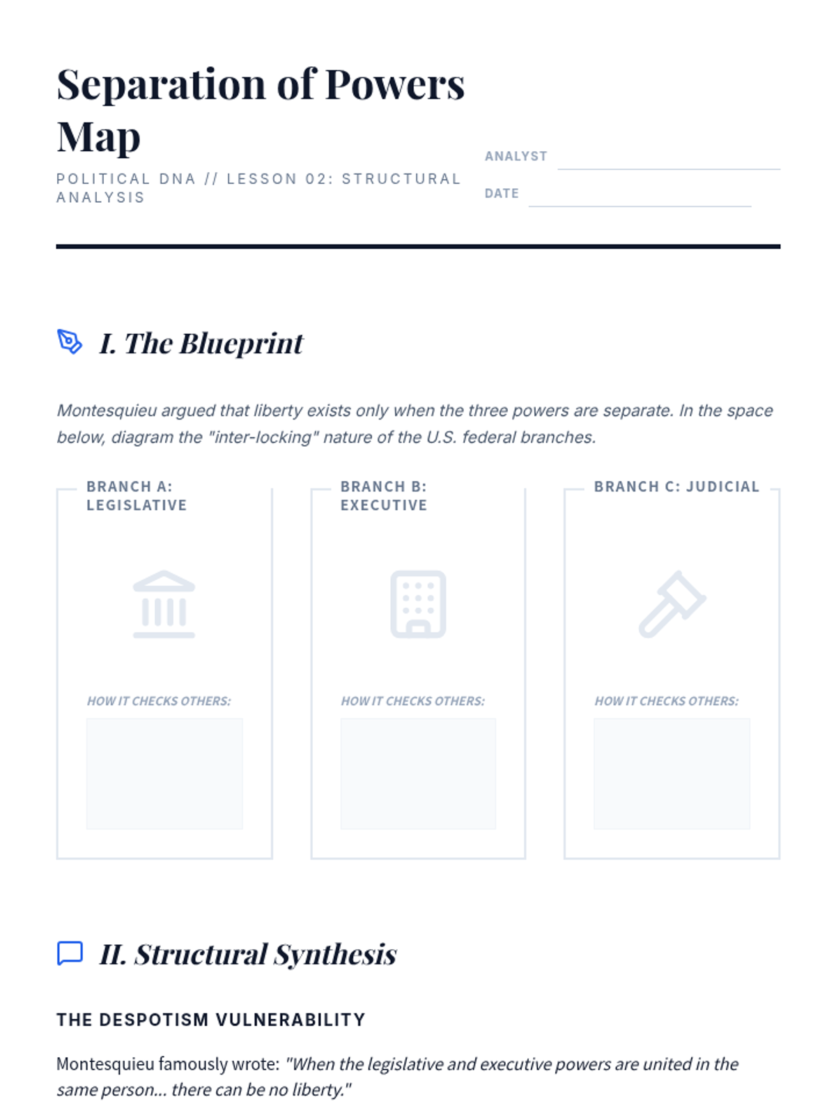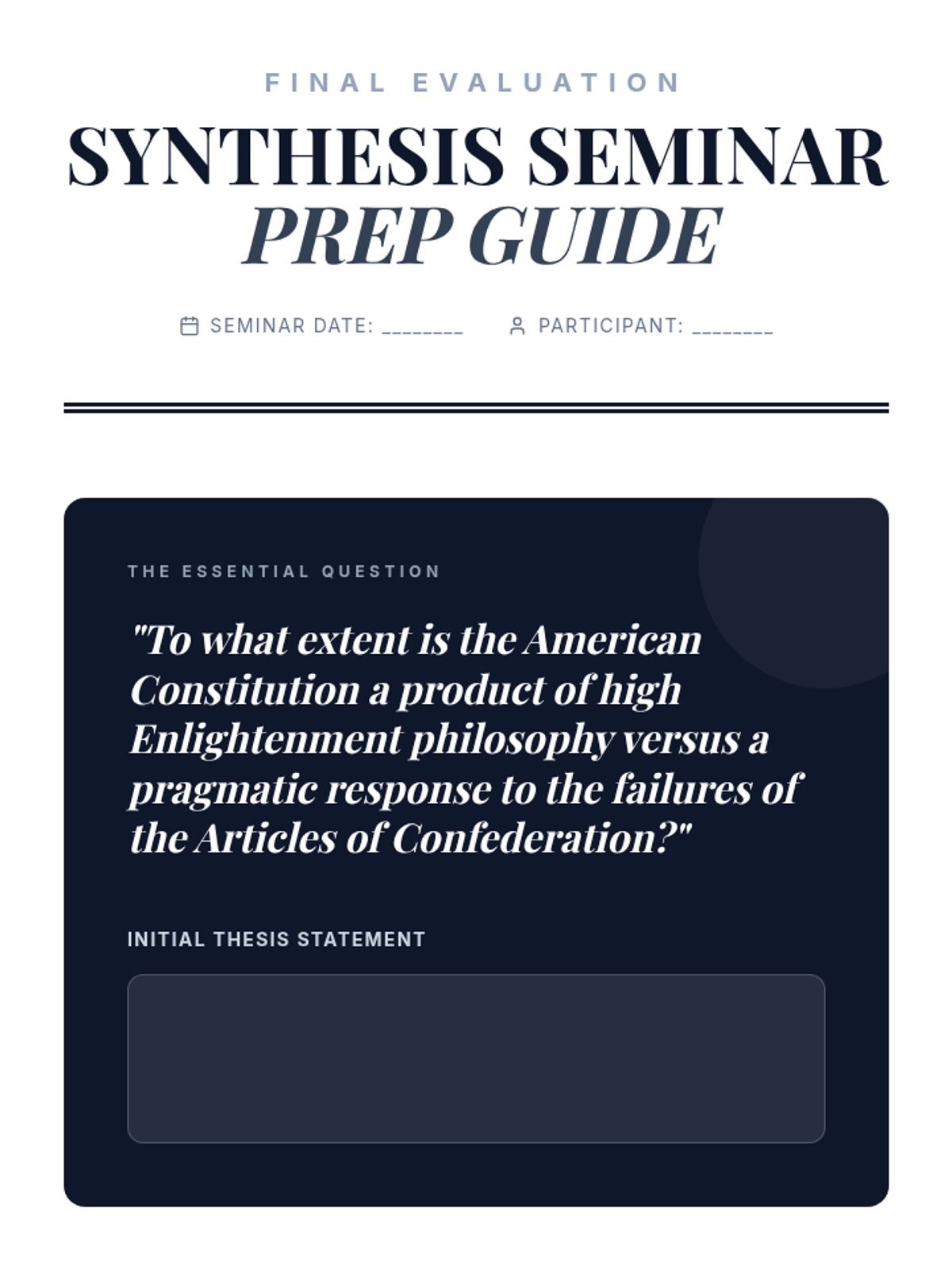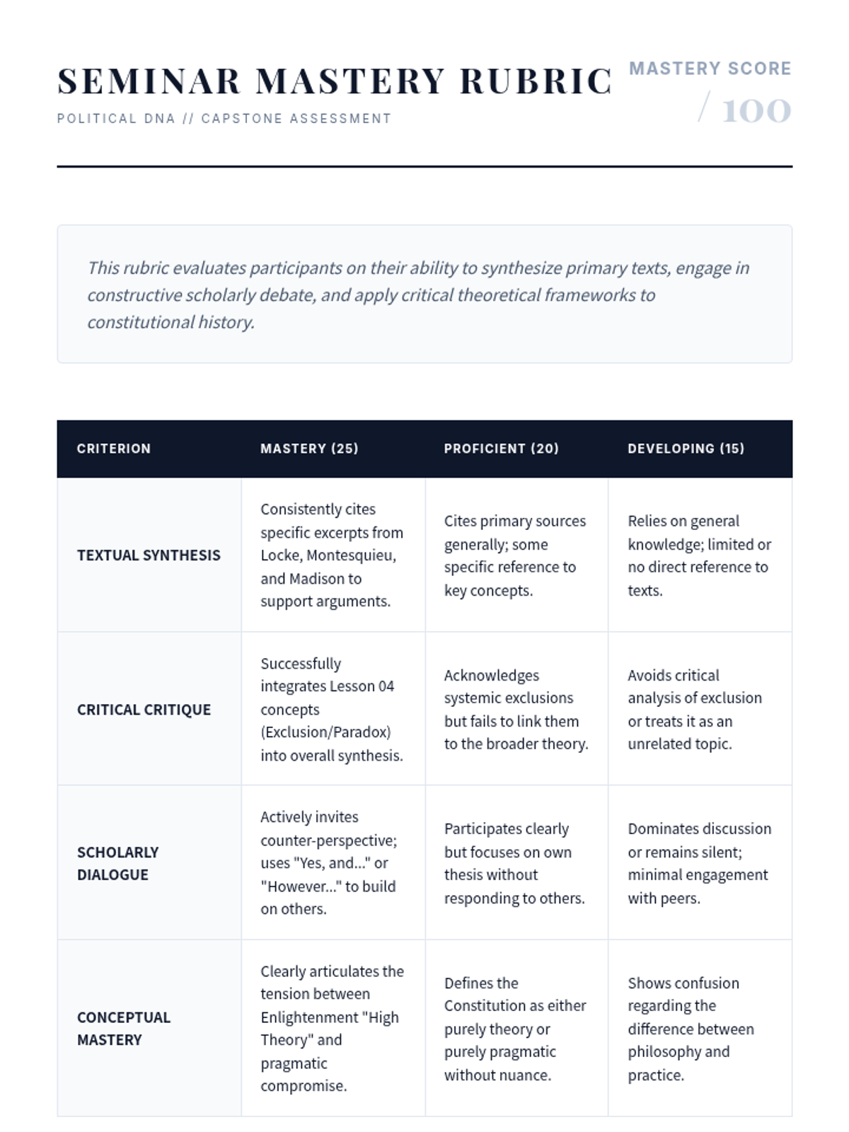 A comprehensive seminar-style sequence for undergraduate students exploring the Enlightenment roots of American constitutionalism. Students move from theoretical foundations of social contract and separation of powers to the rhetorical defense of the Constitution in the Federalist Papers, concluding with a critical analysis of the system's historical exclusions and a synthesis of theory versus pragmatic reality.