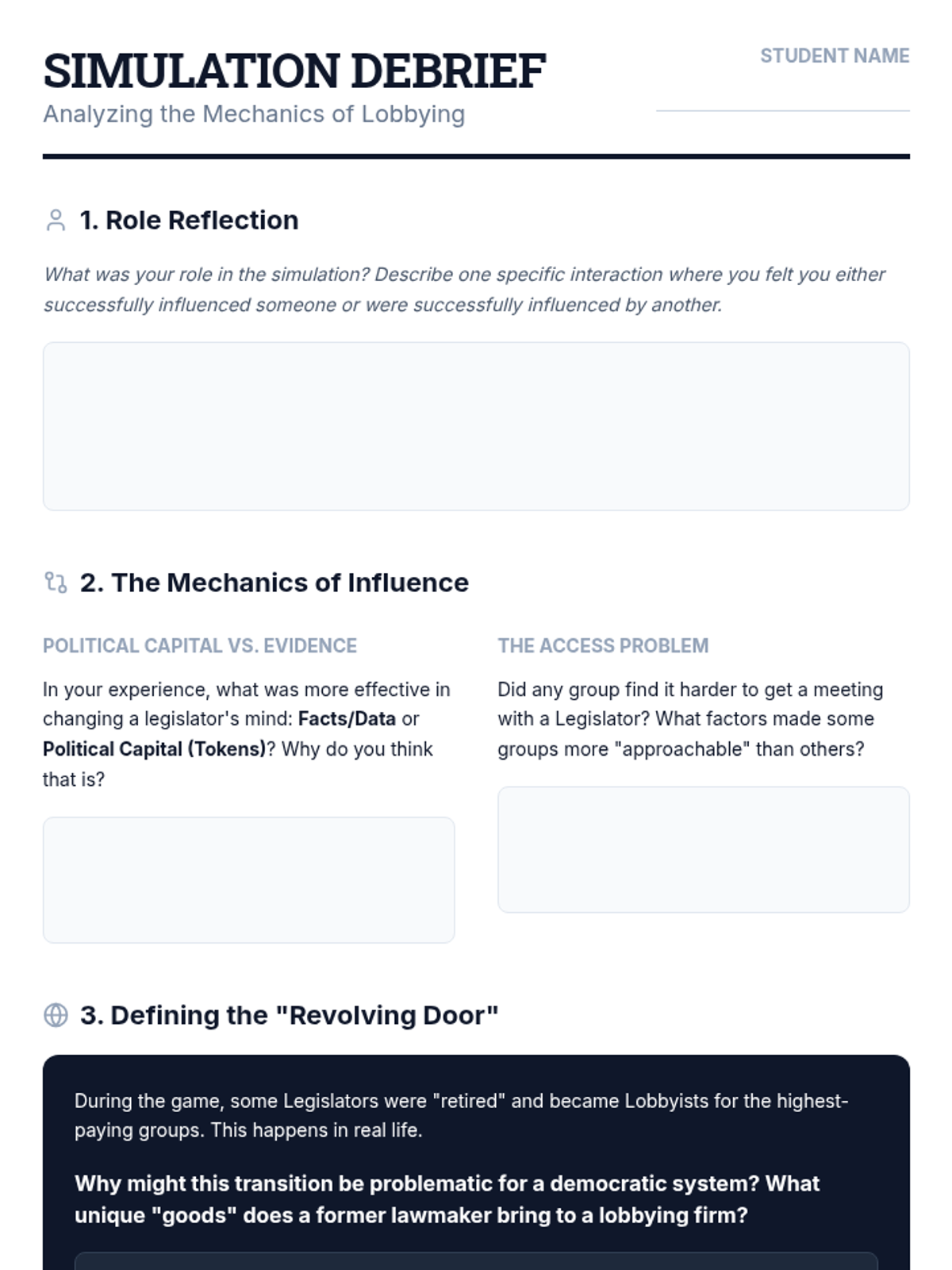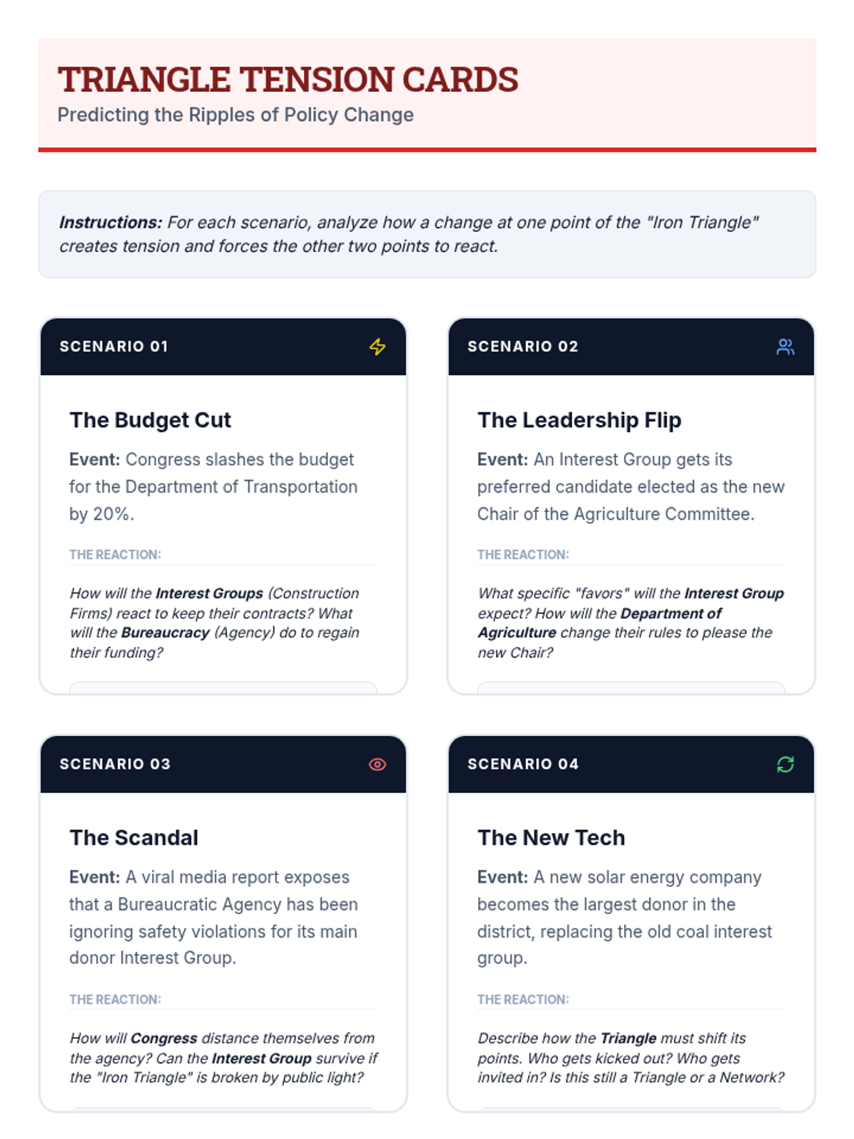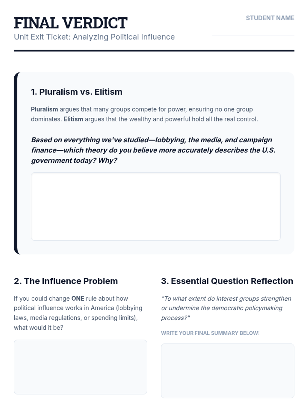 This sequence explores the informal pressures that shape public policy in the United States, focusing on interest groups, lobbying, public opinion, and the ethical debates surrounding campaign finance. Students transition from theoretical models of government to the practical, often messy reality of political influence.